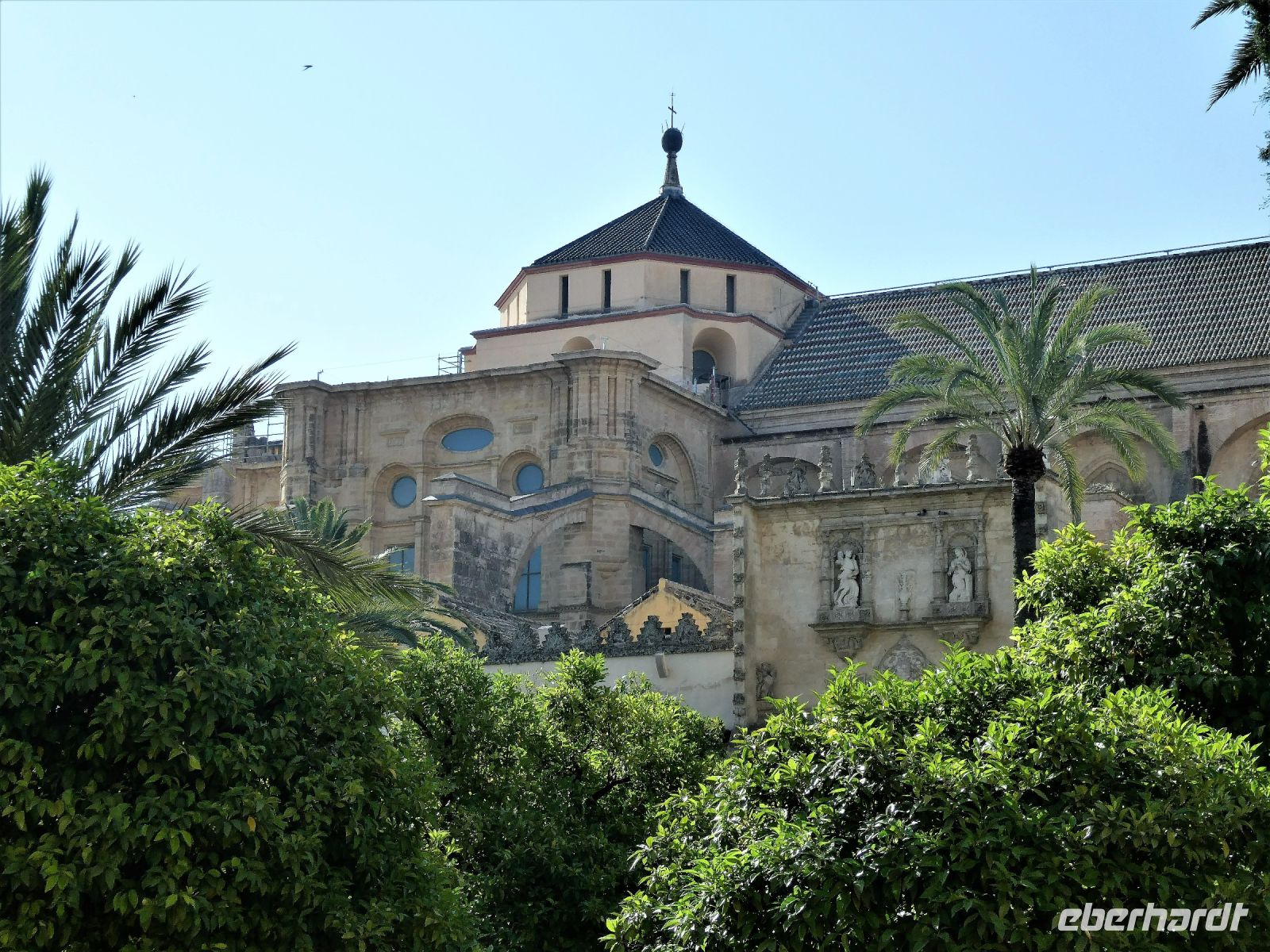 Hier an der Stelle eines einstigen römischen Tempels errichteten die Mauren eine neue Moschee. die im Laufe ihrer Herrschaft mehrfach vergrößert wurde. Für den Moscheebau wurden zahlreiche Säulen aus der Römerzeit in der Säulenhalle integriert. Das Ergebnis war eine Gebetshalle von gigantischem Ausmaß. Wir stellen uns vor wie in dieser damals von Licht durchfluteten Säulenhalle die Gläubigen zu dem rituellen Gebet der Muslime in einer Reihe sich gen Mekka vor Allah verneigten und ihr Gebet murmelten. Die heutige Ausdehnung, inklusive des Orangenhofs, erreichte die Moschee im 10.Jahrhundert und bedeckt heute eine Grundfläche von 23.000 qm.