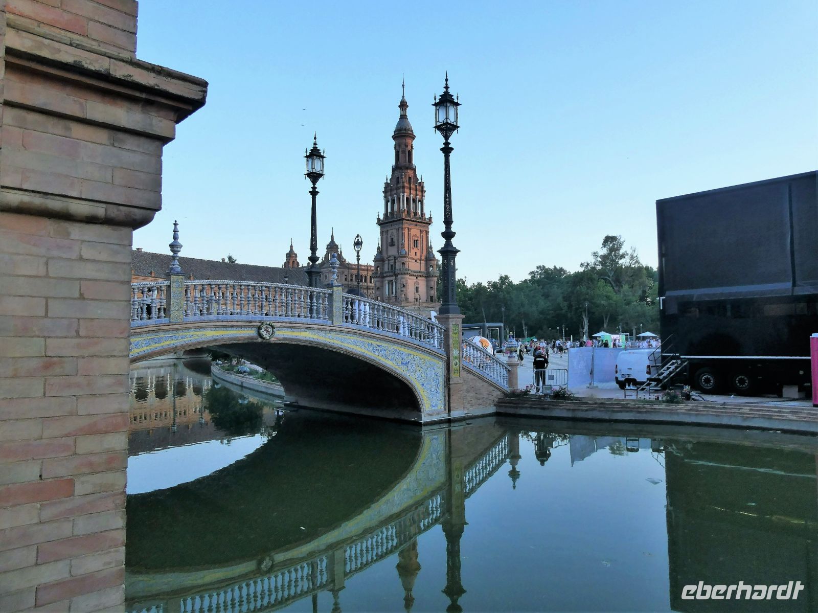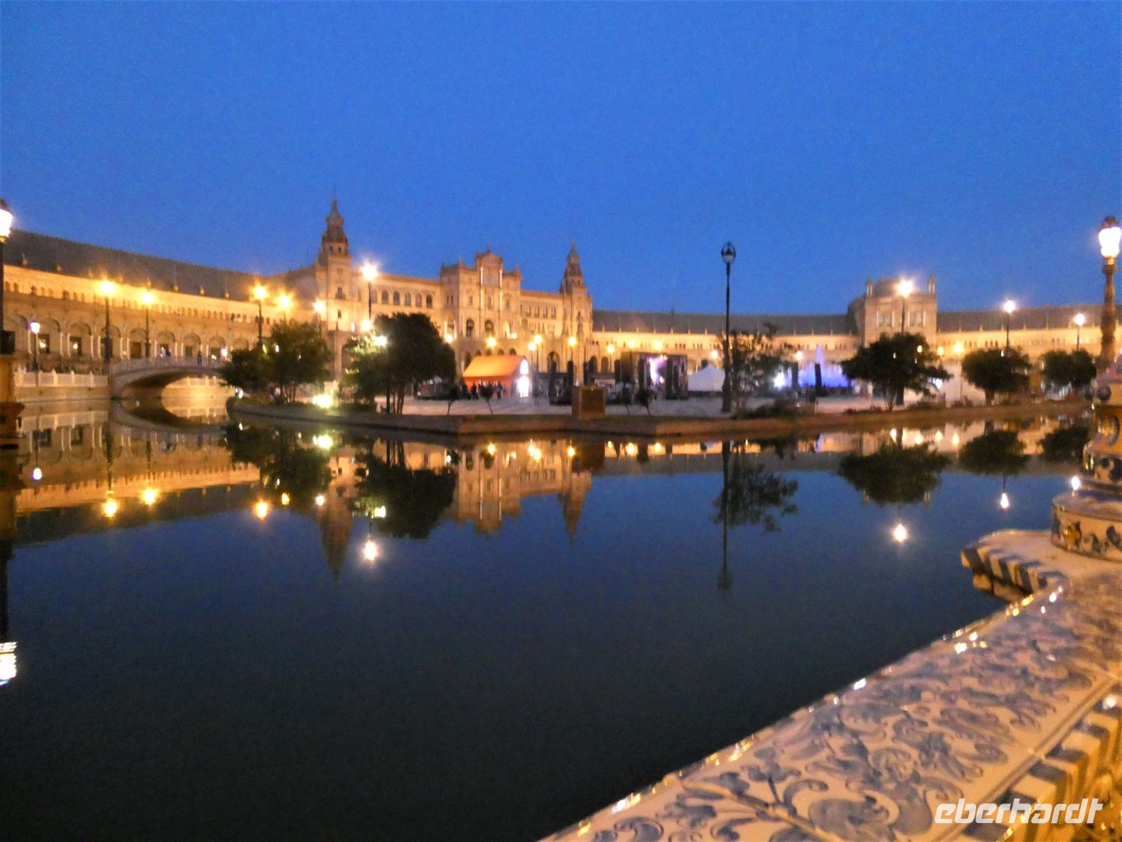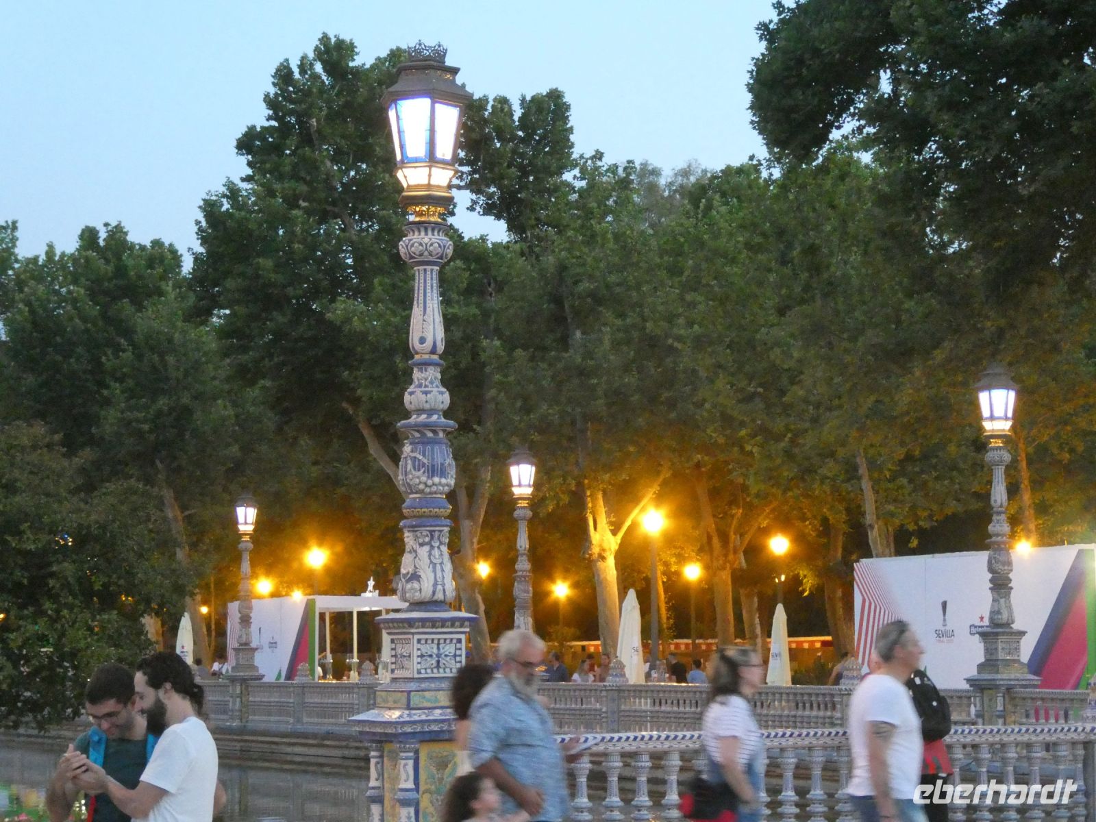 An der "Plaza Espana", eine Anlage die zu Beginn des 20 Jahrhunderts errichtet und mit Fliesen im Zeitgeschmack ausgeschmückt wurde, machen wir eine Fotopause. Hier sind Vorbereitungen für eine Party anlässlich des Endspiels des UEFA-Cups: Frankfurter Eintracht gegen Glasgow Rangers im Gange. Zahlreiche Fans sind aus beiden Ländern angereist und bevölkern den Platz. Auch in den Kneipen und Bars der Stadt erkennt man an der Kleidung die Zugehörigkeit.