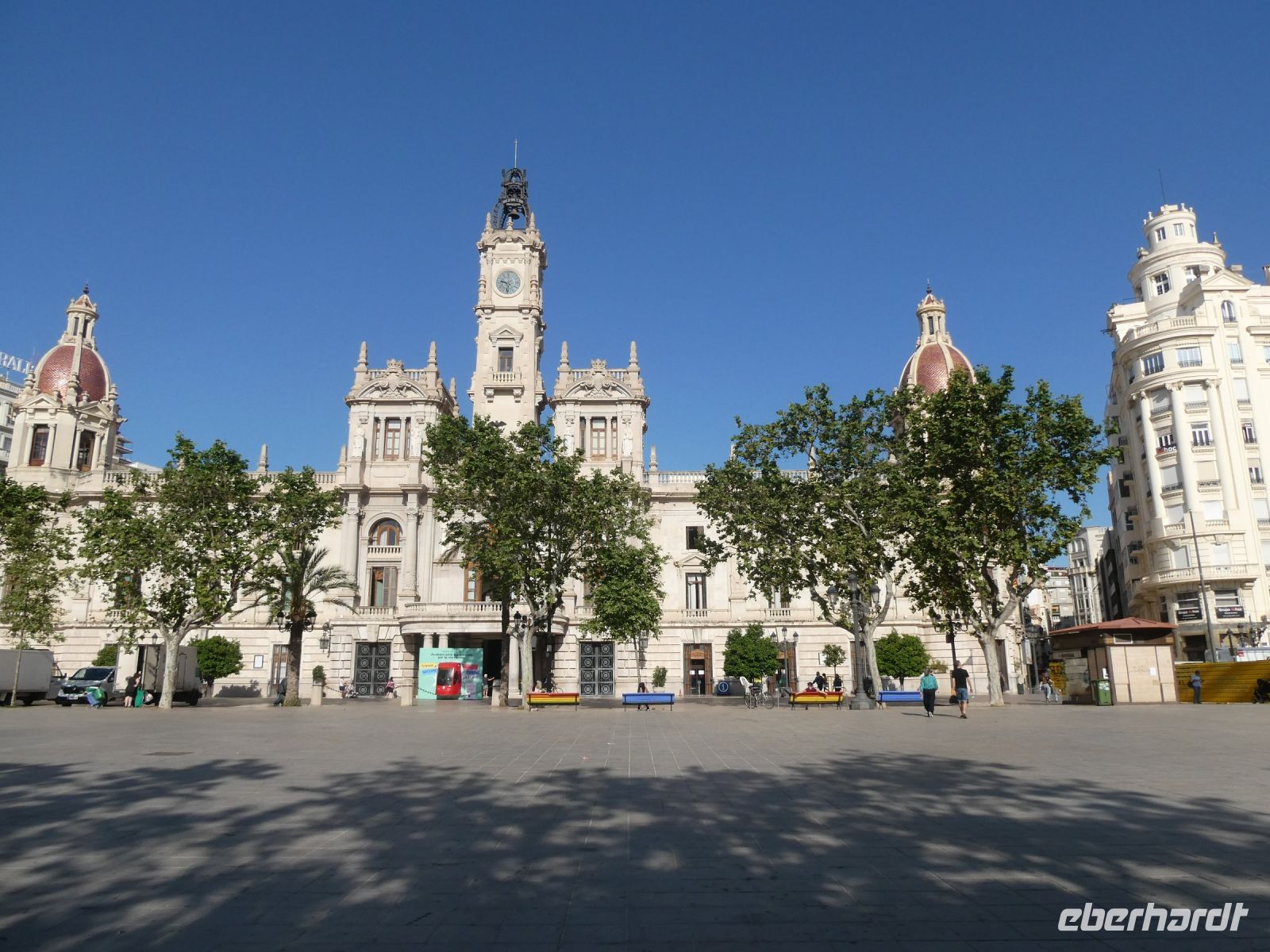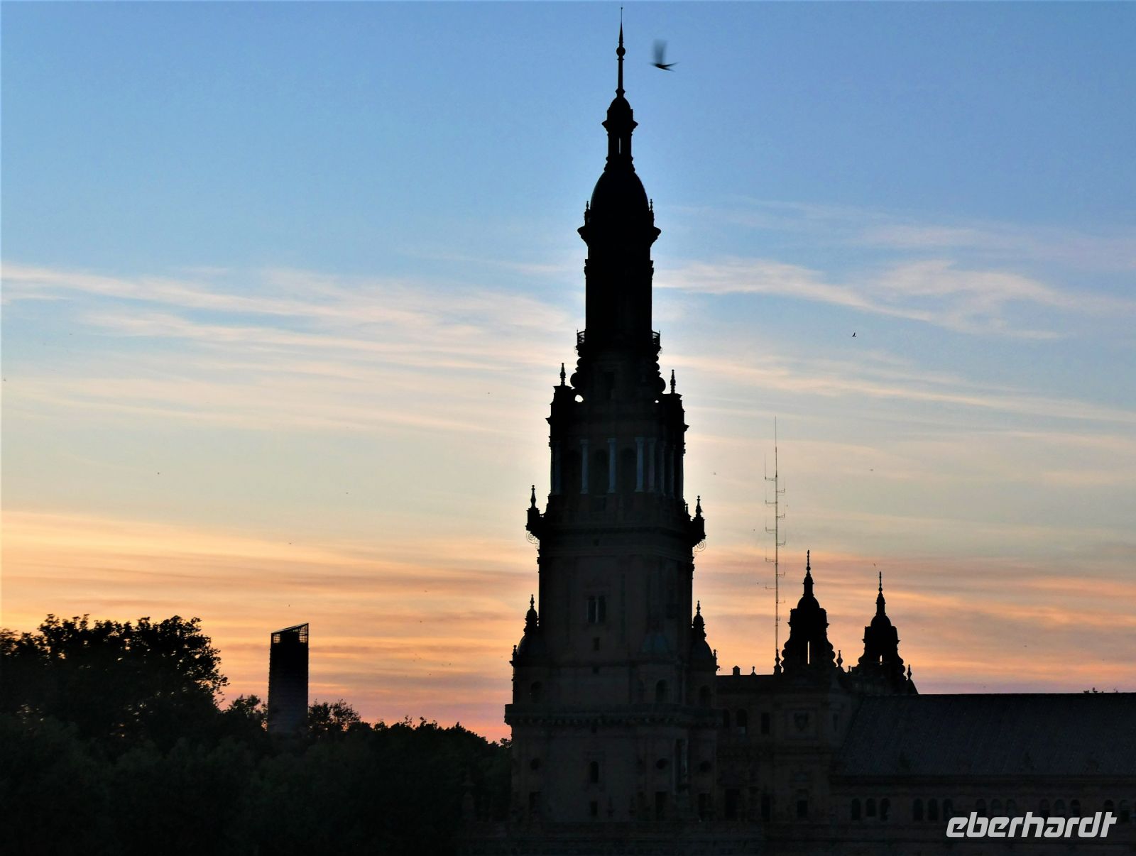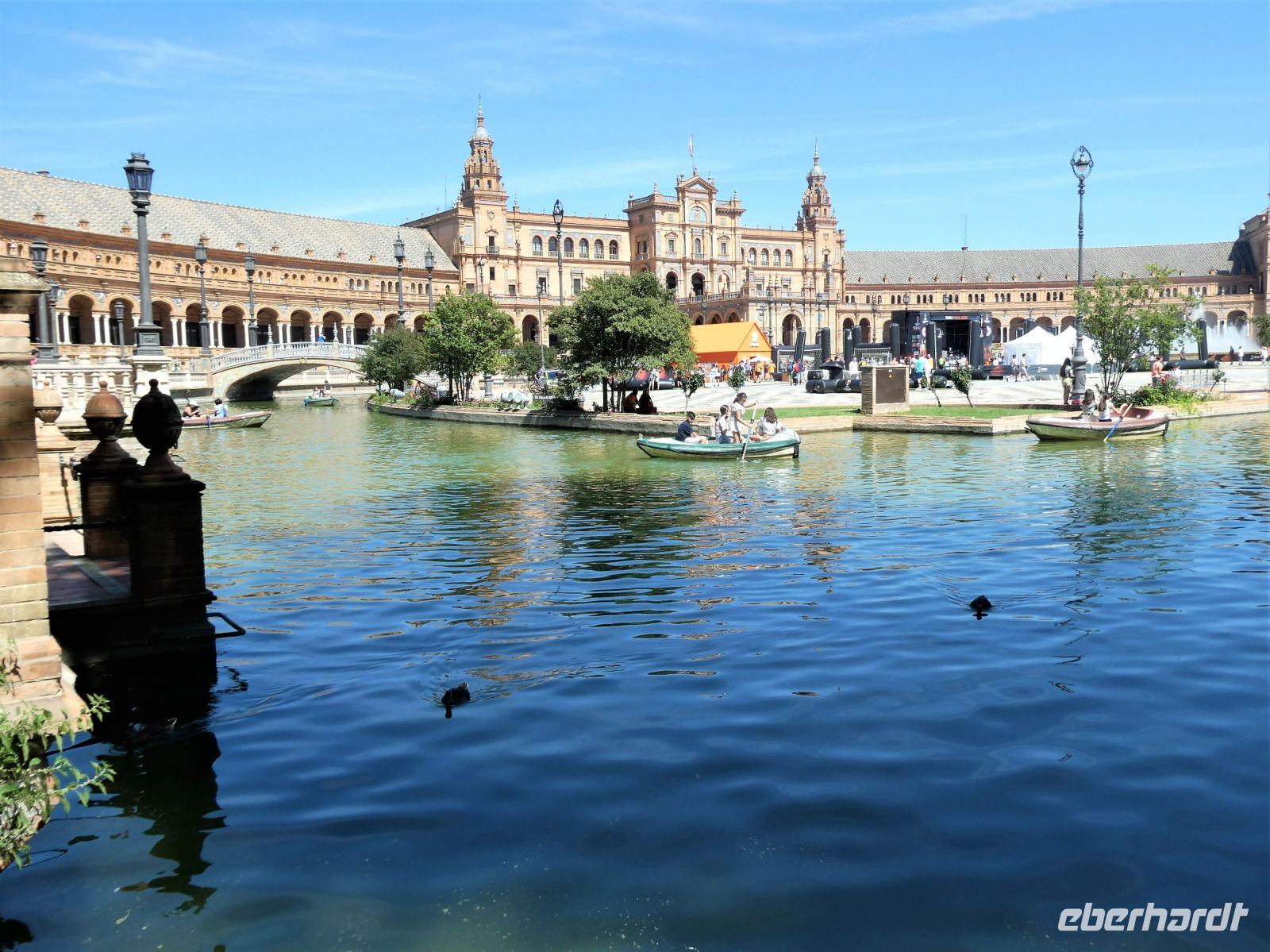 An der "Plaza Espana", eine Anlage die zu Beginn des 20 Jahrhunderts errichtet und mit Fliesen im Zeitgeschmack ausgeschmückt wurde, machen wir eine Fotopause. Hier sind Vorbereitungen für eine Party anlässlich des Endspiels des UEFA-Cups: Frankfurter Eintracht gegen Glasgow Rangers im Gange. Zahlreiche Fans sind aus beiden Ländern angereist und bevölkern den Platz. Auch in den Kneipen und Bars der Stadt erkennt man an der Kleidung die Zugehörigkeit.