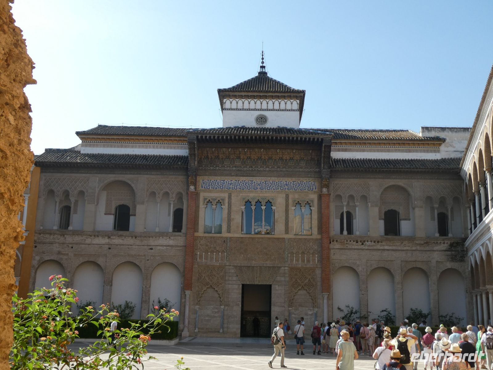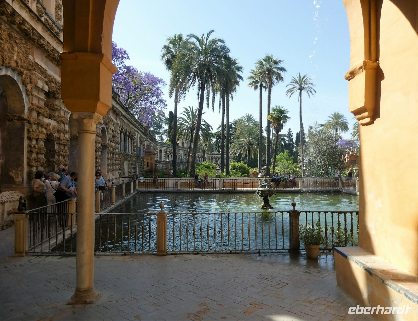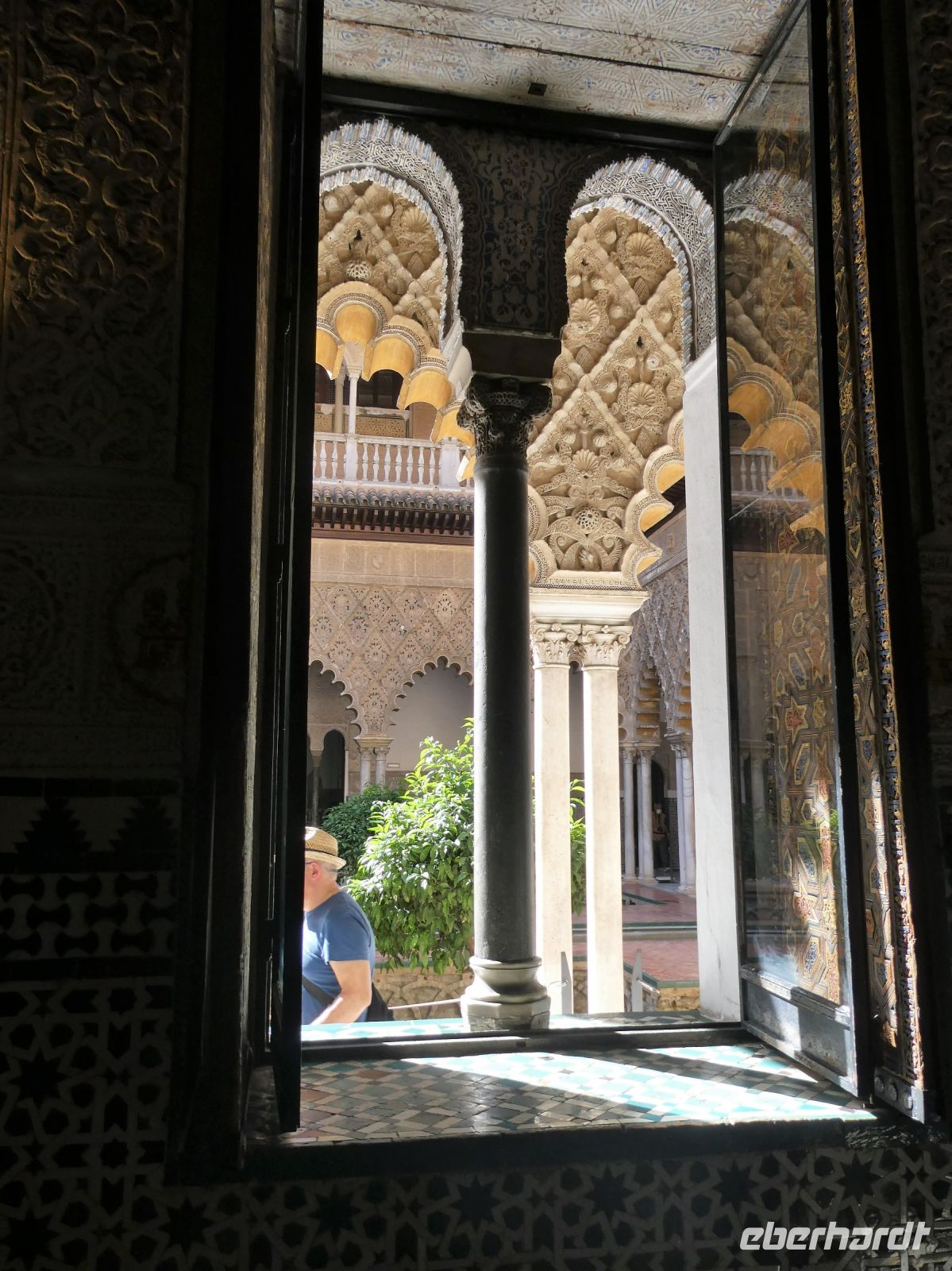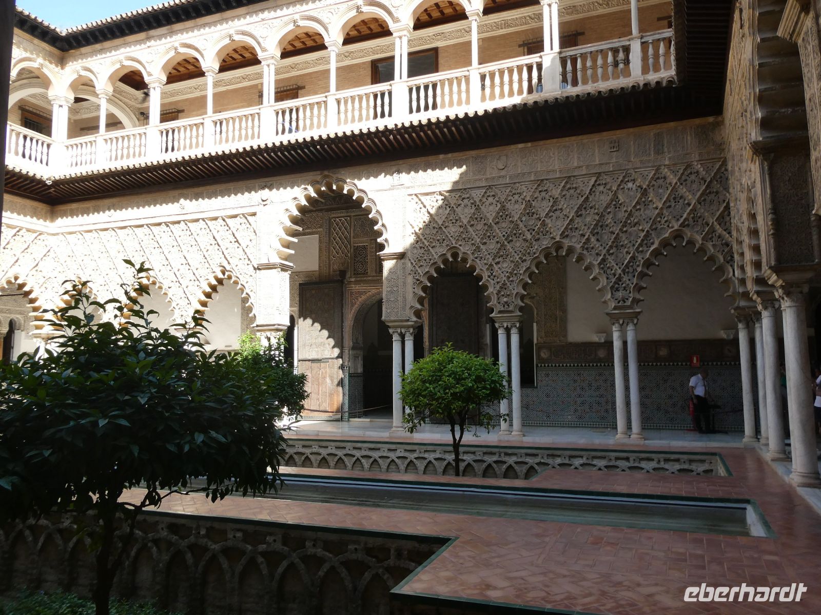 Heute wollen wir uns die Altstadt von Sevilla, den Stadtteil "Sta.Cruz" und das ehemalige jüdische Viertel anschauen. Wir starten von unserem Hotel mal wieder zu Fuß und kommen bei schon für diese Tageszeit beachtlichen Temperaturen durch dieses Viertel. Schöne mit Blumen bepflanzte Innenhöfe und wunderbare Fassaden auch hier. Über Schleichwege kommen wir zum zentralen Platz "Plaza Virgen de los Reyes" und die Kathedrale mit der berühmten "Giralda" einem zum einem Glockenturm umgebauten Minarett taucht vor uns auf. Von hier starten wir eine der beiden wichtigsten Besichtigungen heute: die des "Real Alcazar" ein Palast im Stil des "Mudejar", der von "Pedro I.", einem christlichen Herrscher, errichtet wurde. Er entstand innerhalb einer Palastanlage der "Almohaden", die aus Nordafrika gekommen waren. Baumeister aus Granada und Toledo erschufen dieses prachtvolle Bauwerk. Spätere Monarchen wie Isabella I und Karl V. ergänzten und erweiterten es. Azulejos (Fliesen) und Stuck zieren den Botschaftersaal. Die Kuppel ist eine Stalaktitenkuppel und besteht aus vergoldeten Holzintarsien. Im "Mädchenhof" einem Patio im Palast bewundern wir die kunstvollen Verzierungen. Wir würden gerne noch bleiben aber unser nächster "Termin" ruft. Es bleibt noch ein wenig Zeit um in den wunderbaren Gärten zu spazieren, nur auf diese Idee kommen nicht nur wir. Es sind schon sehr viele Menschen hier unterwegs. Da die Eintrittszeiten eingehalten werden müssen reißen wir uns schweren Herzens los und laufen hinüber zum Kathedraleneingang. Auch hier stand einst eine Moschee der "Almohaden"- der Einheitsbekenner, aus dem 12.Jahrhundert. Sie waren eine streng konservative muslimische berberische Bruderschaft. Es ist dieselbe Gruppe aus Nordafrika welche die Moschee in Marrakesch(Marokko) errichten lies. Das Minarett ähnelte sehr dem Minarett der "Koutoubia-Moschee" (Marrakesch).