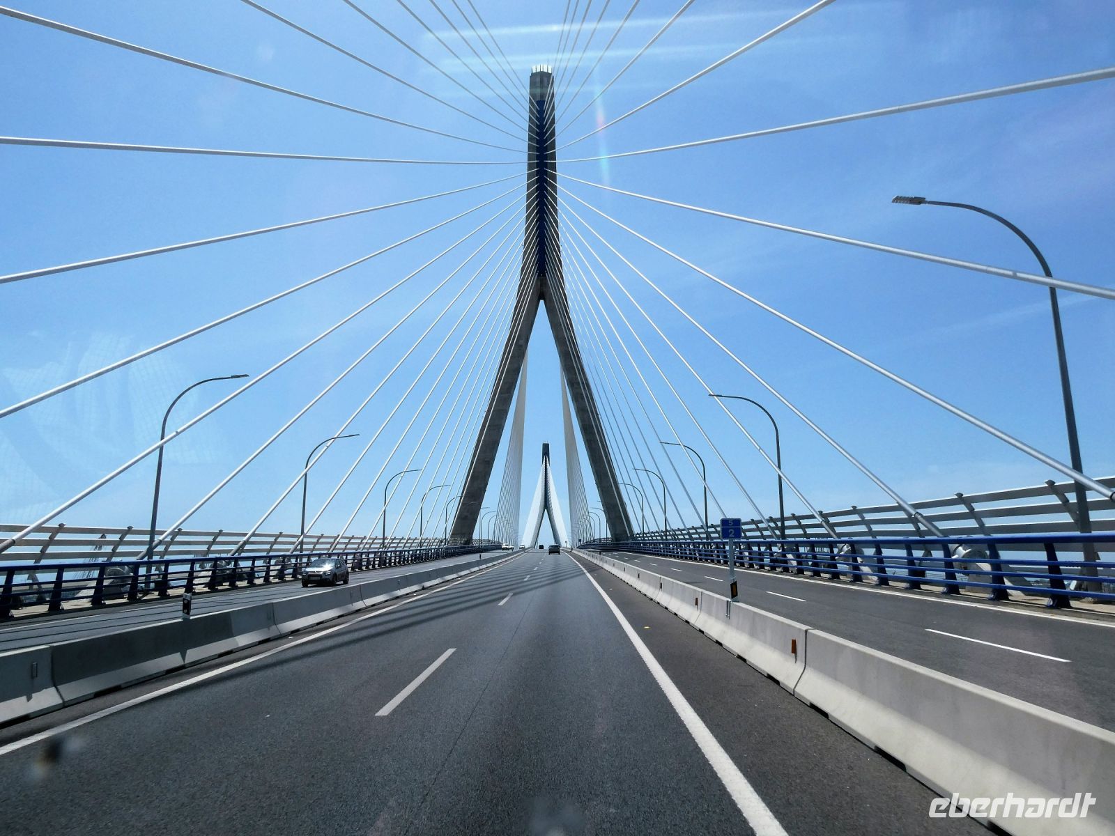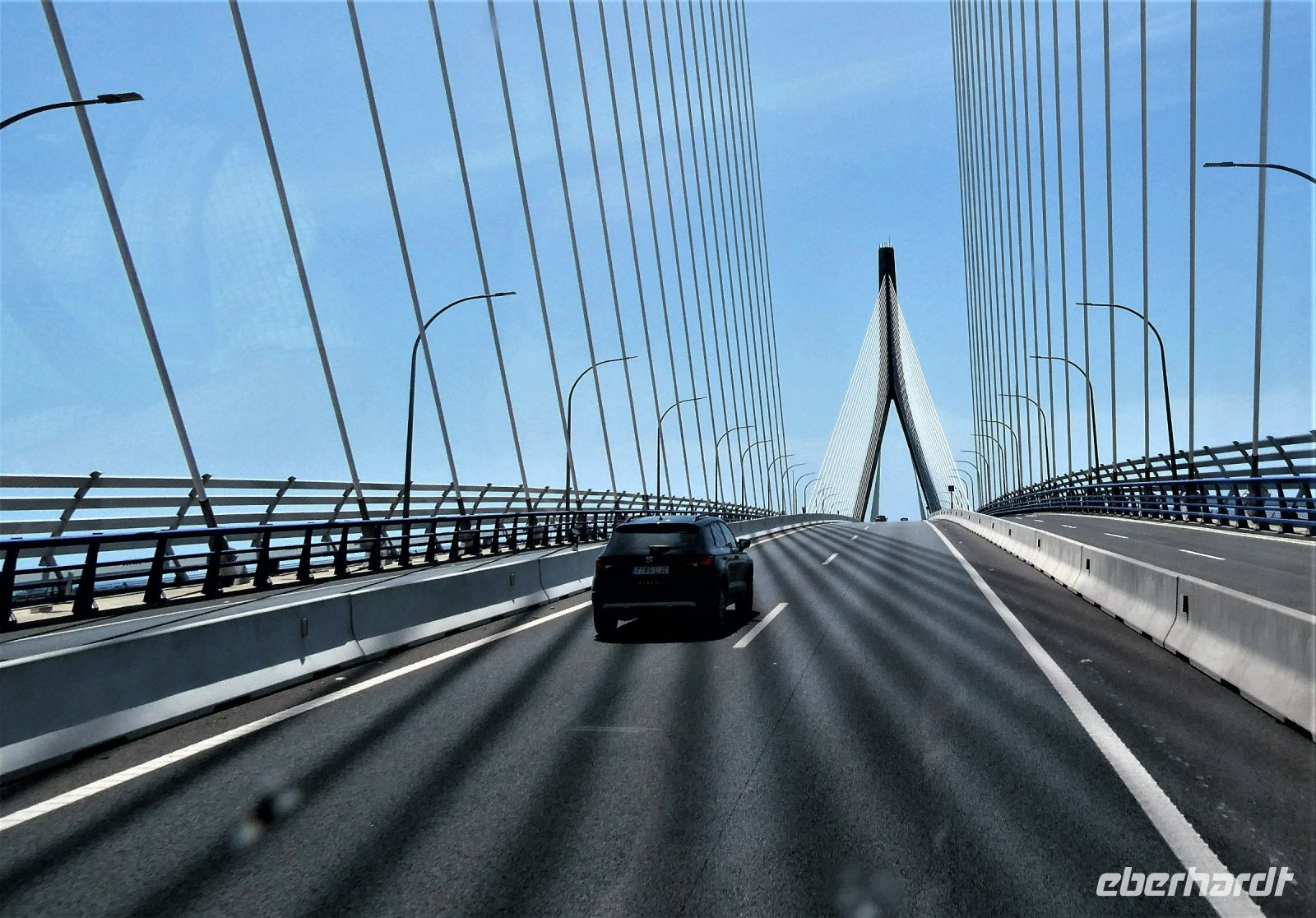 Nach einer kurzen Erholung im Bus auf unserer Weiterfahrt an die Küste kommt schon bald die verhältnismäßig neue "Puente da la Constitución" in Sicht. Sie verbindet Cádiz direkt mit dem Festland und hat eine Gesamtlänge von über 3000 m. Sie hat die größte Spannweite der spanischen Schrägseilbrücken und sie ist die drittgrößte in Europa.