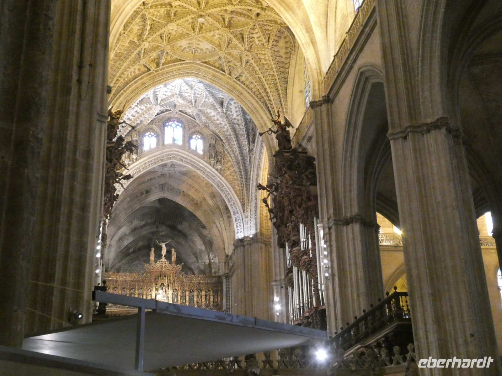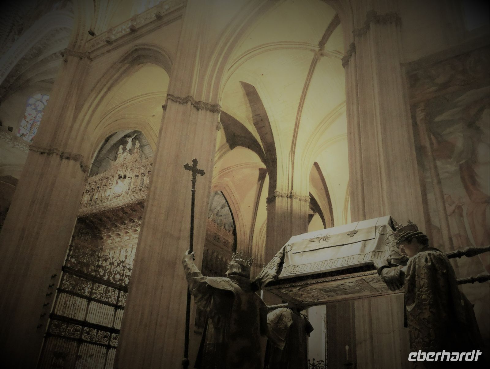 Der Hauptaltar der Kathedrale ist von Gold überbordend. Gold welches aus der sog. "Neuen Welt" stammte. In der Kathedrale ist auch das Grab von "Christobal Colon" dessen sterbliche Überreste wohl mehrfach zwischen Lateinamerika und Spanien hin und her wanderten. Hier befinden sich aber nach neuesten Untersuchungen die nachweislich "richtigen". Sein Grab ist beeindruckend, wird doch sein Sarg von vier Bronzefiguren getragen: sie repräsentieren die Königreiche Kastilien, León, Aragón und Navarra. Nach der Führung haben wir noch ein wenig Zeit um in der Kathedrale oder im "Orangenhof" mit seinem Brunnen (für einstige rituelle Waschungen vor dem Gebet) zu bleiben. Wir verabreden eine Zeit am zentralen Platz um von dort zu unserem Bus zu laufen, der nicht überall halten darf. So kommen wir noch zu zwei weiteren für Sevilla wichtigen Gebäuden vorbei, dem "Archivo General de las Indias" einem Gebäude aus dem 16.Jahrhundert mit 86 Mio. Manuskripten und 8000 Karten und Zeichnungen, alle die Eroberung der Neuen Welt betreffend. Auch der "Torre del Oro" am Ufer des Guadalquivir hatte etwas damit zu tun. Hier wurde die kostbare Schiffsfracht die aus den neu eroberten Gebieten kam, entladen. Viel Geschichte und Geschichten lagern heute, nicht nur virtuell, in dieser Stadt.