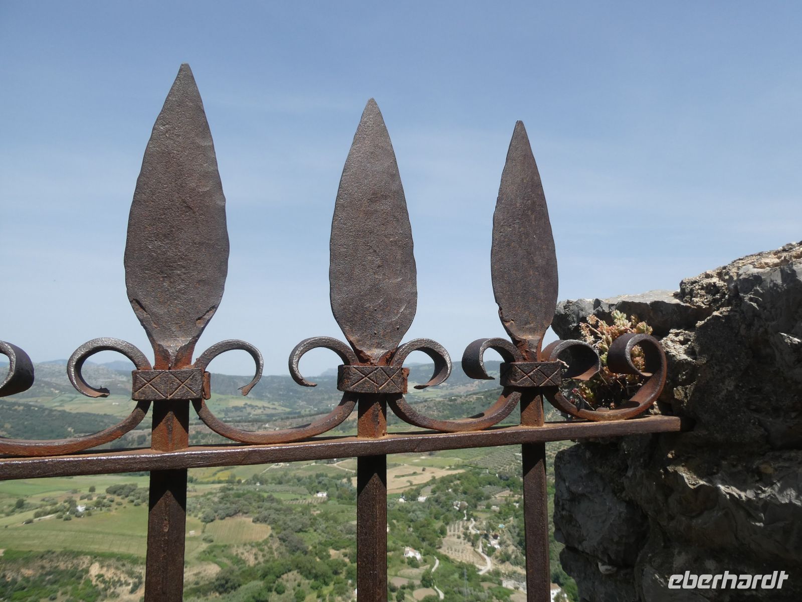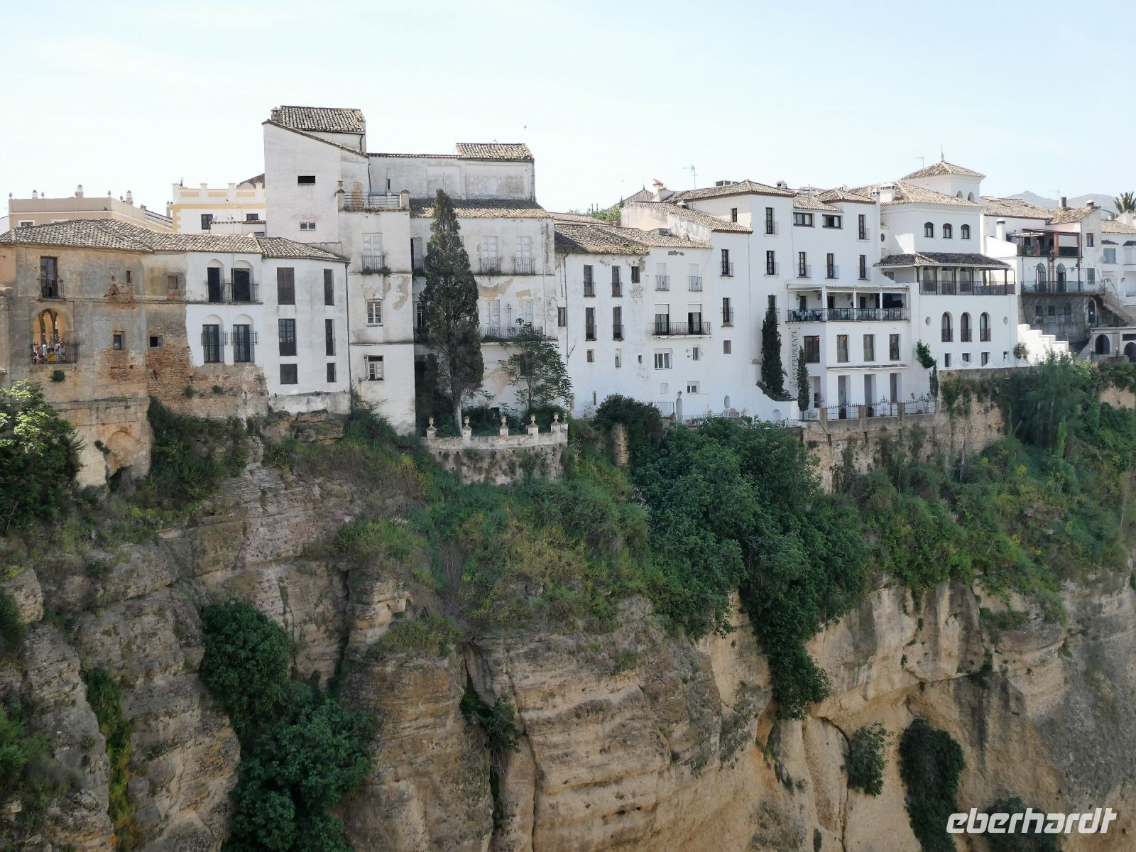 Ronda liegt auf einem Felsplateau in ca. 750 m.ü.M. am Rande einer tiefen Schlucht. Die Stadtteile aus unterschiedlichen Jahrhunderten sind durch eine Brücke miteinander verbunden, die "Puente Nuevo" aus dem 18.Jahrhundert. Es war eine Meisterleistung der Ingenieurwesens für die damalige Zeit. Wir spazieren darüber und bummeln durch den älteren Teil der Stadt. Ein Straßenmusikant bietet seine CD's an und einige aus der Gruppe werden bei den spanischen sentimentalen Klängen schwach. Auch hier besuchen wir eine Kirche, die sogar einen Balkon hat.