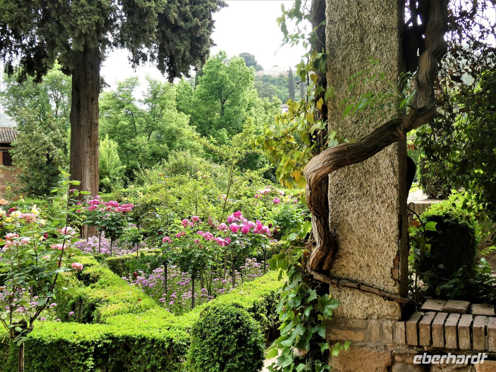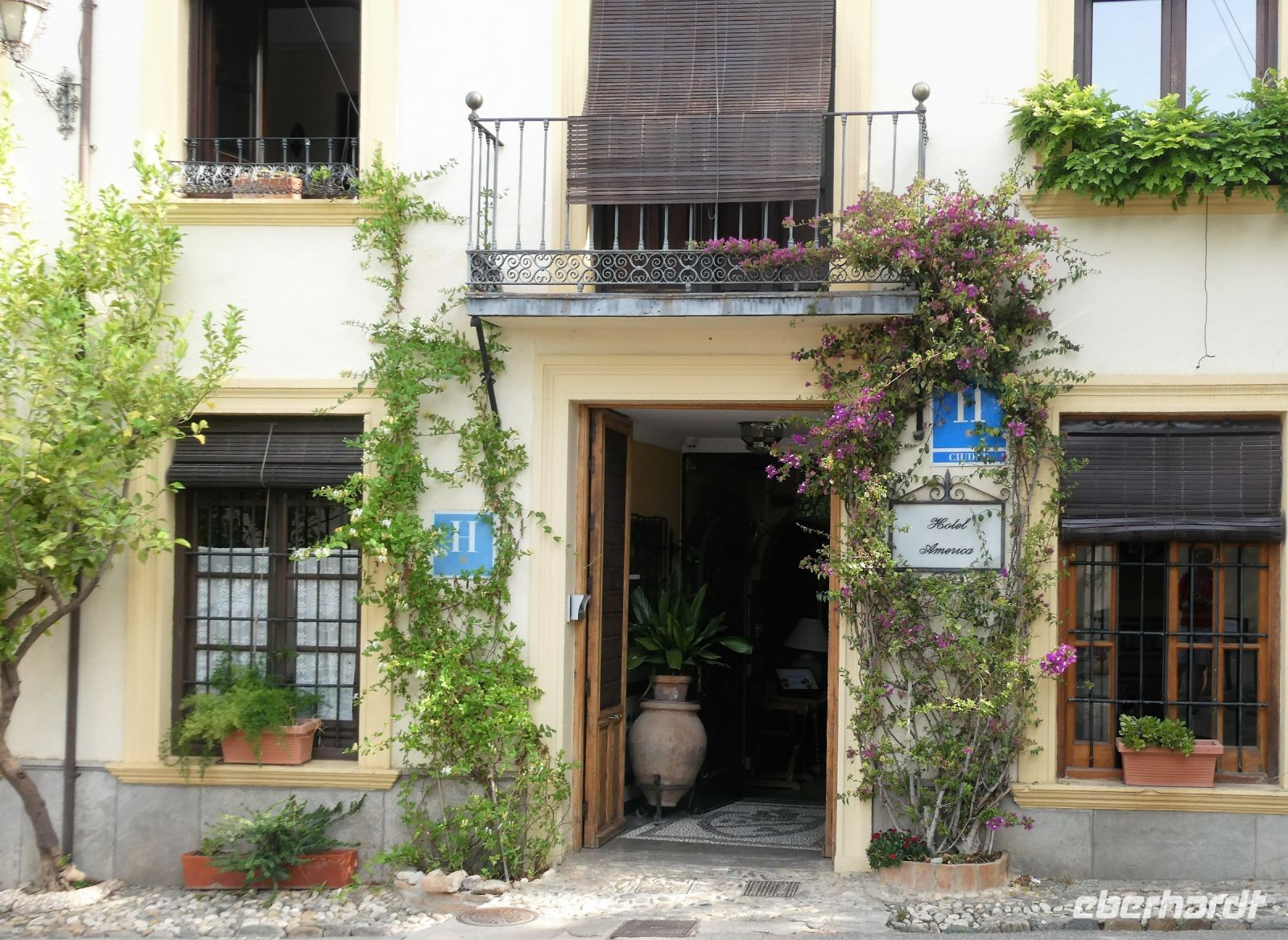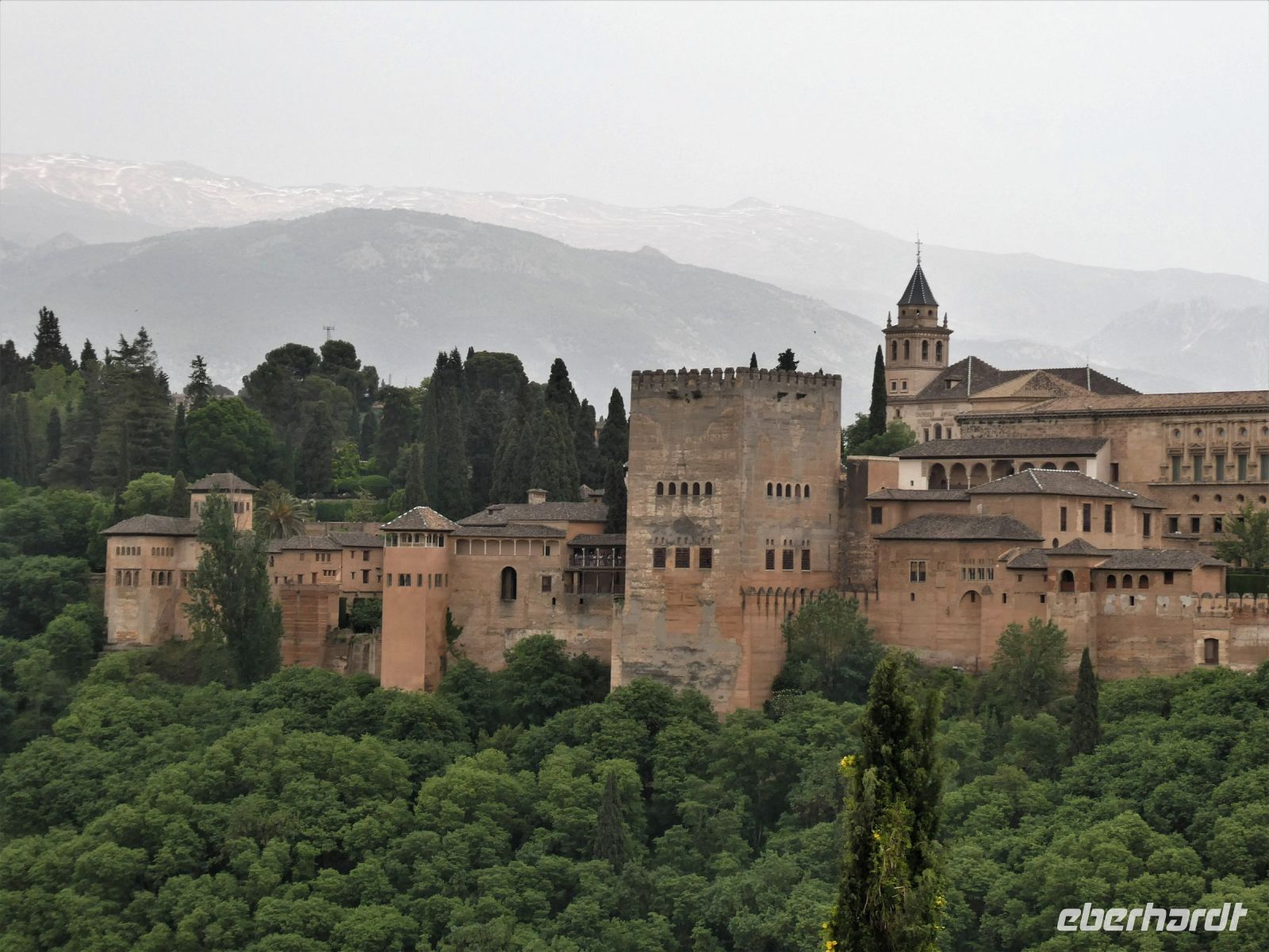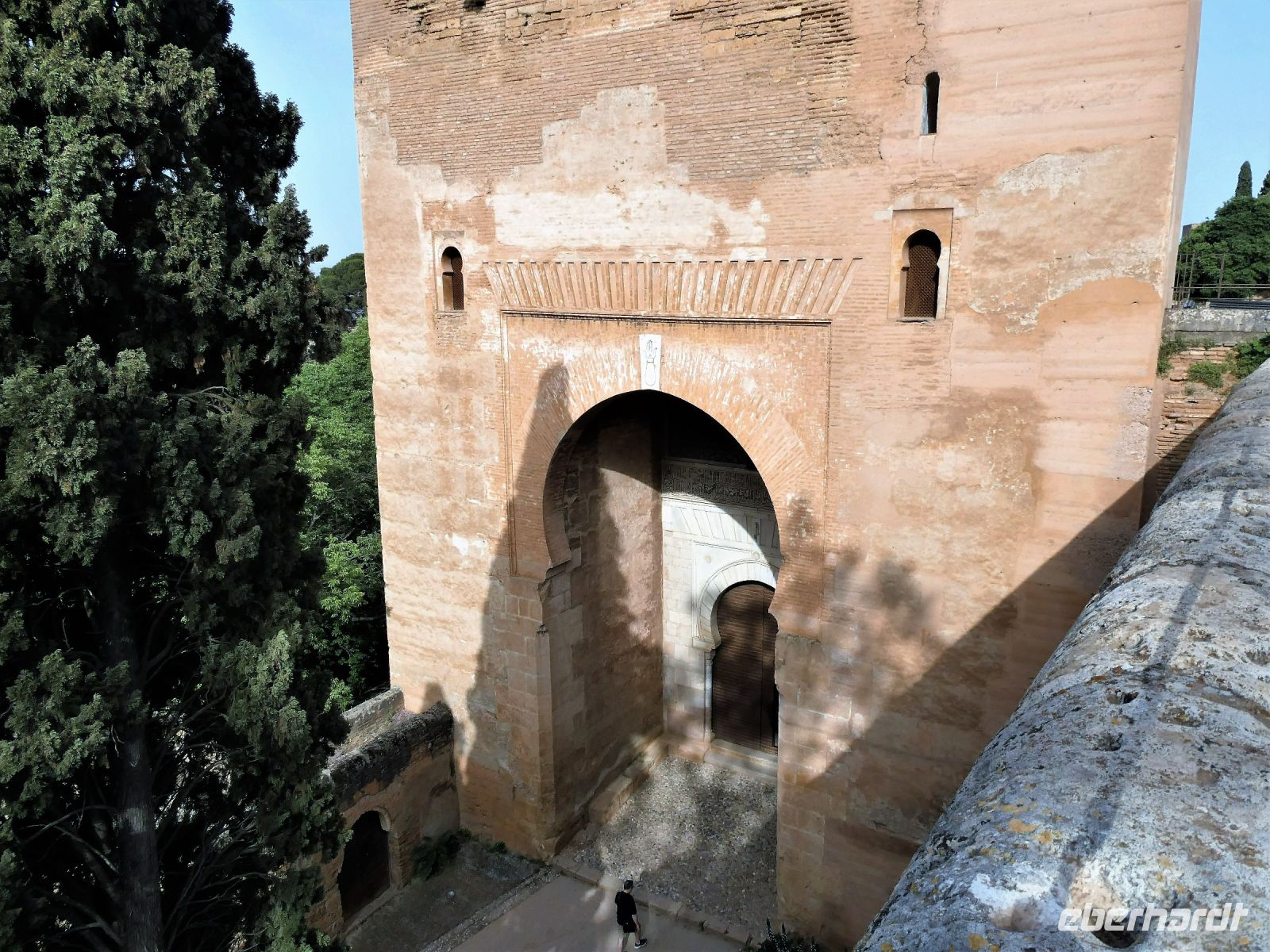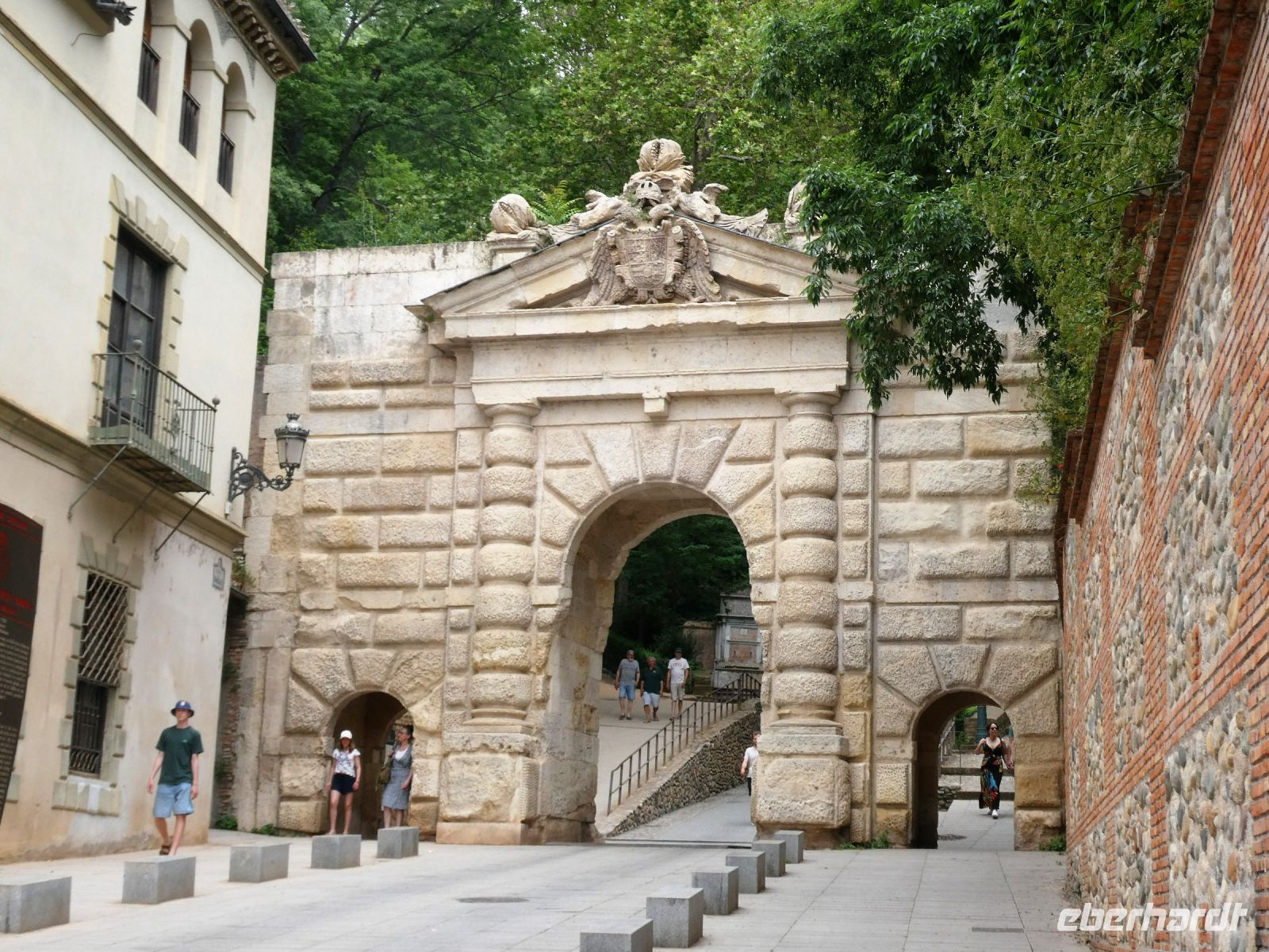 Nach dem Frühstück treffen wir uns mit unserem Granada-Stadtführer Pedro. Er geleitet uns zum ersten Eingangstor der Alhambra, welches nicht weit entfernt von unserem Hotel ist. Es ist noch nicht ganz so viel los und das rozedere läuft ohne Komplikationen ab. Langsam durch grüne Pracht spazierend, vorbei an dem "Parador nacional", eine landestypische Herberge für Liebhaber traditionsreicher Hotels, erreichen wir den 2. Zutrittspunkt. Dann sind wir auf dem Gelände und vor uns liegt die Alhambra. Die Erbauer, die Nasriden erkannten, dass sie dem Vormarsch Ferdinands III. von Kastilien nichts entgegenzusetzen hatten, stellten sich an dessen Seite. Gemeinsam mit Ferdinand unterzeichneten sie einen Waffenstillstand und konnten so das Nasridenreich von Granada gründen.