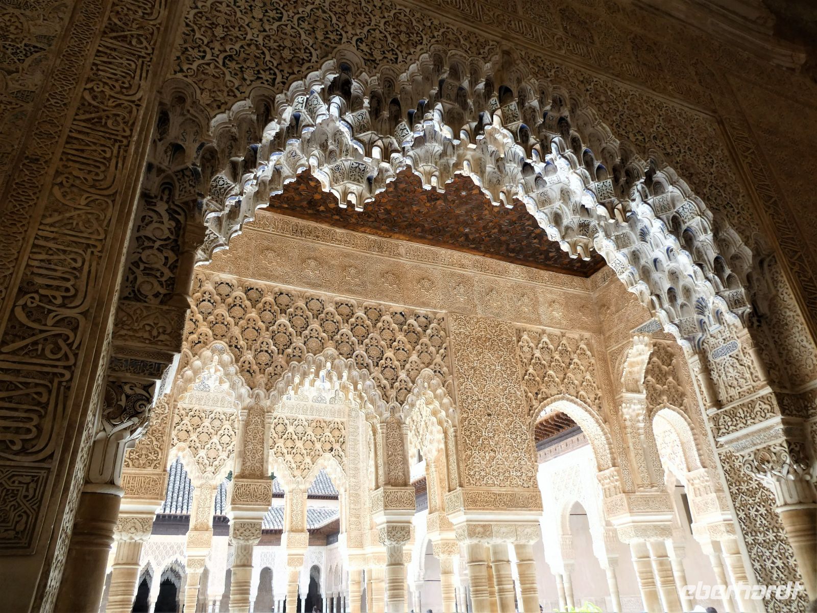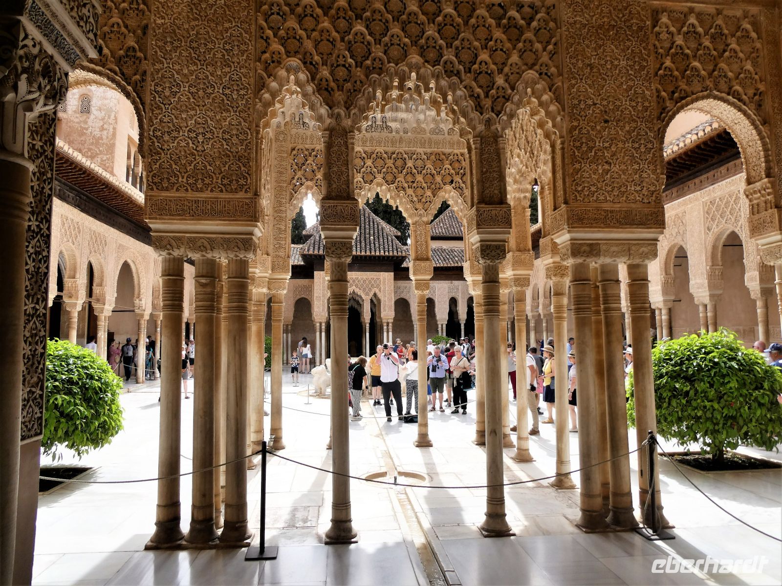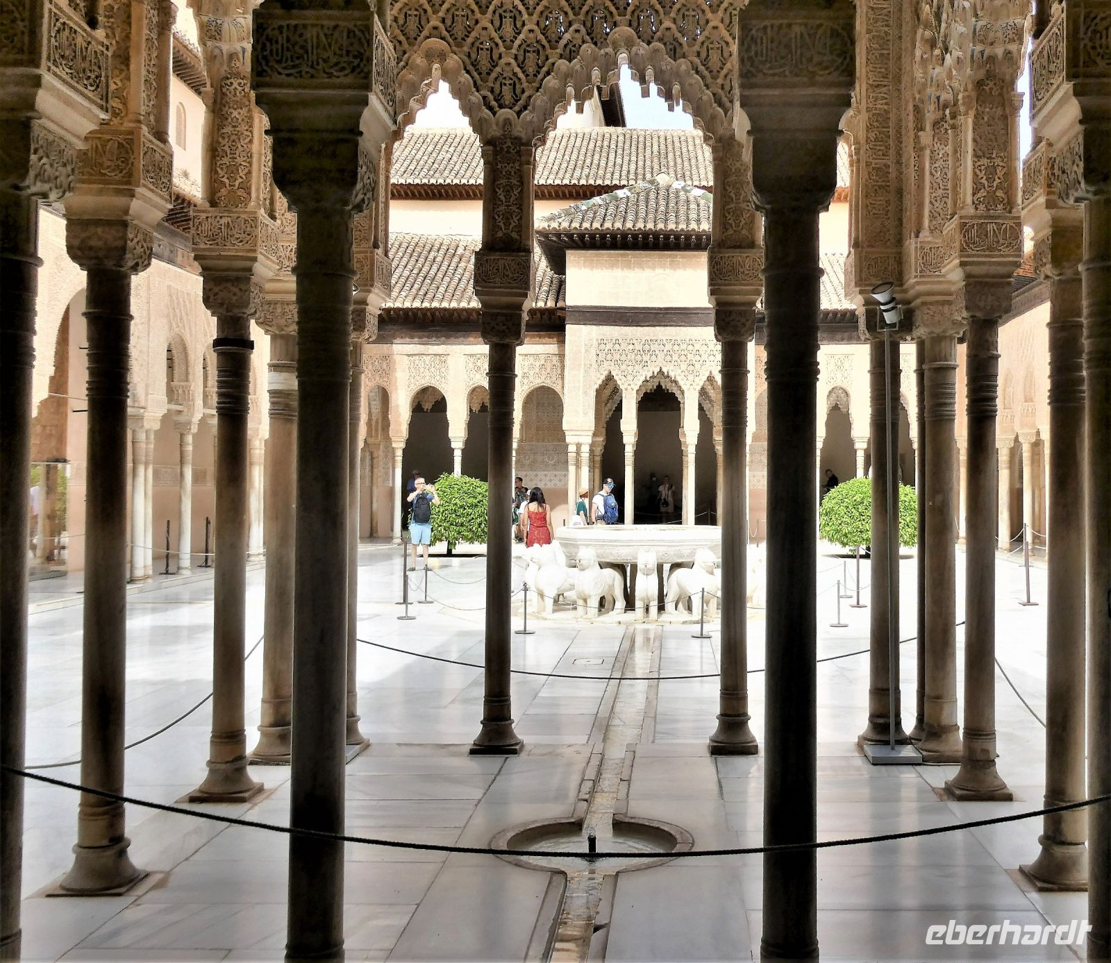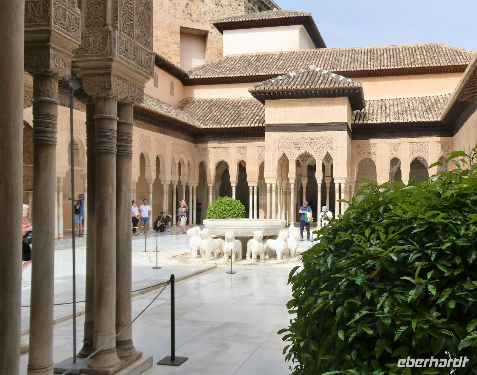 Marmorsäulen ausgestattet ist aber eine gewisse Kälte ausstrahlt. Er wurde allerdings erst lange nach dem endgültigen Untergang des Nasridenreiches im Jahr 1492 errichtet. Endlich betreten wir ihren Palast. Eine Pracht an geometrischen Formen, Säulen und Stuckgewölben empfängt uns. Ein Saal ist schöner als der vorhergehende. Alles ist eine raffinierte ästhetische Komposition die ihren Höhepunkt im Löwenhof mit dem schönen Springbrunnen hat.