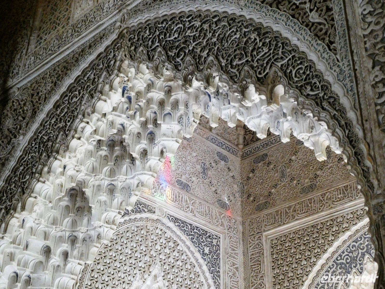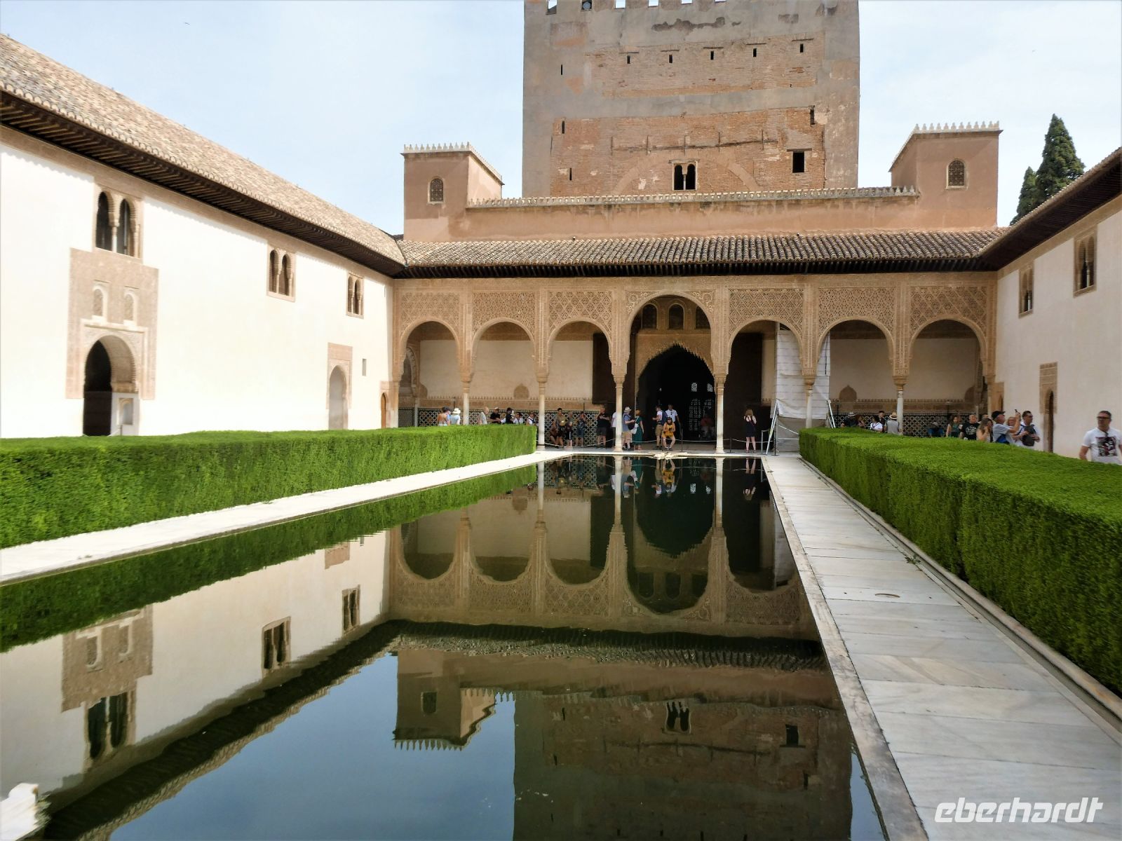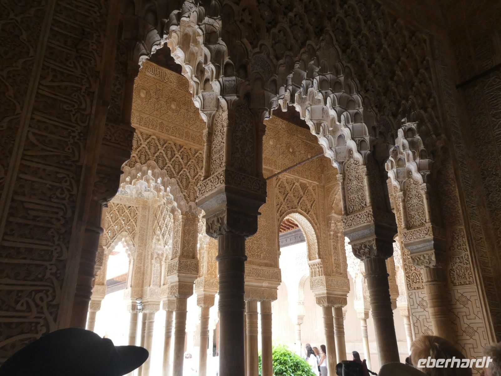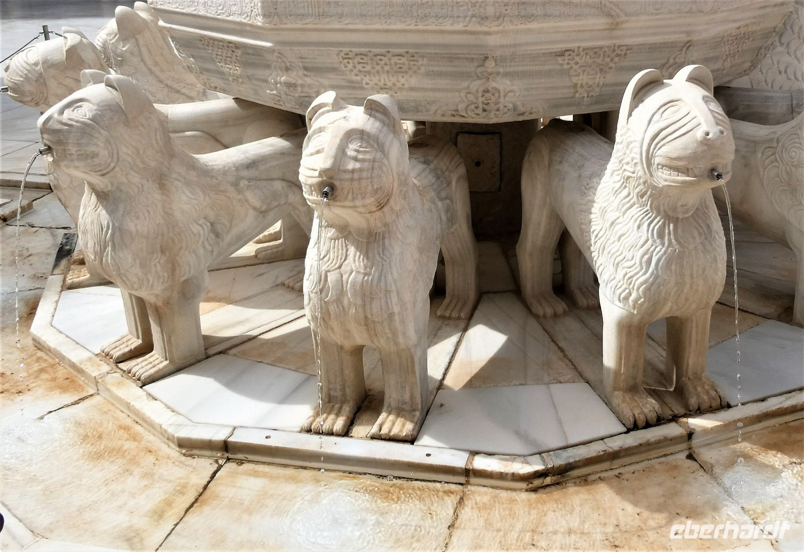 Marmorsäulen ausgestattet ist aber eine gewisse Kälte ausstrahlt. Er wurde allerdings erst lange nach dem endgültigen Untergang des Nasridenreiches im Jahr 1492 errichtet. Endlich betreten wir ihren Palast. Eine Pracht an geometrischen Formen, Säulen und Stuckgewölben empfängt uns. Ein Saal ist schöner als der vorhergehende. Alles ist eine raffinierte ästhetische Komposition die ihren Höhepunkt im Löwenhof mit dem schönen Springbrunnen hat.