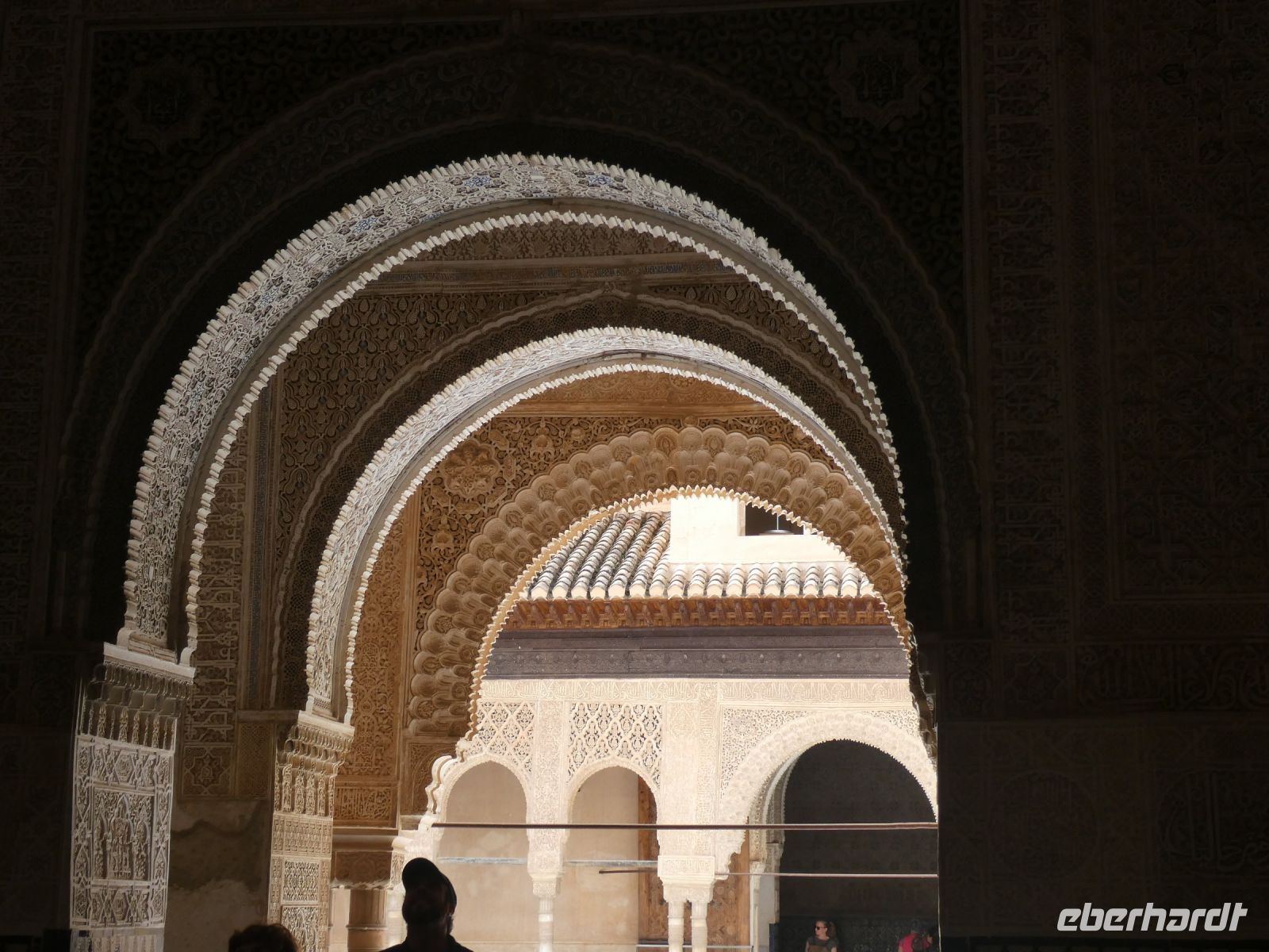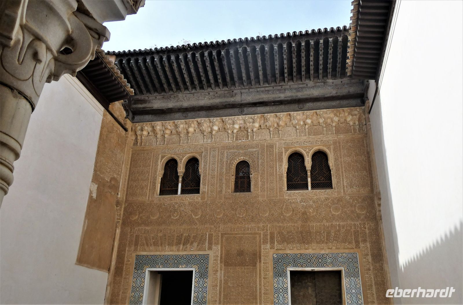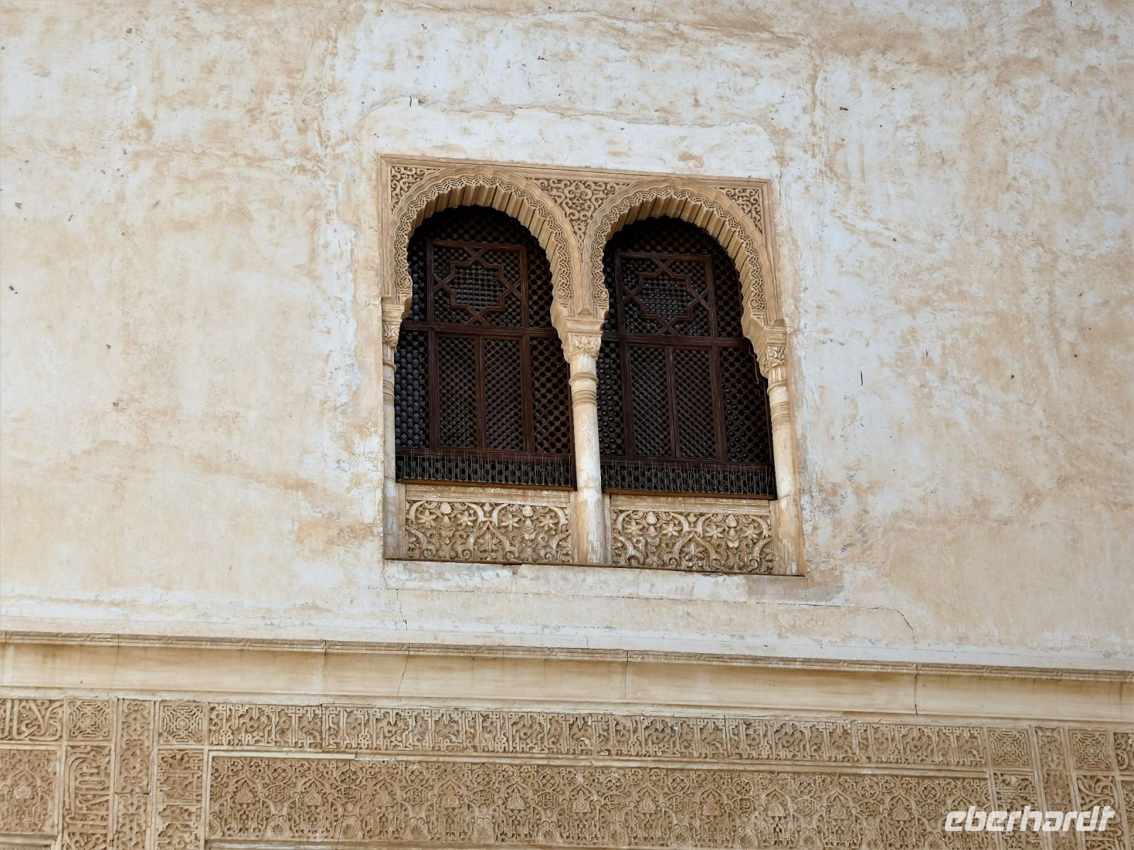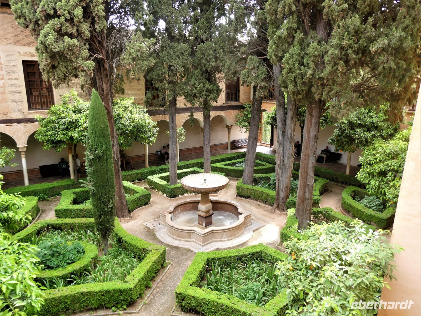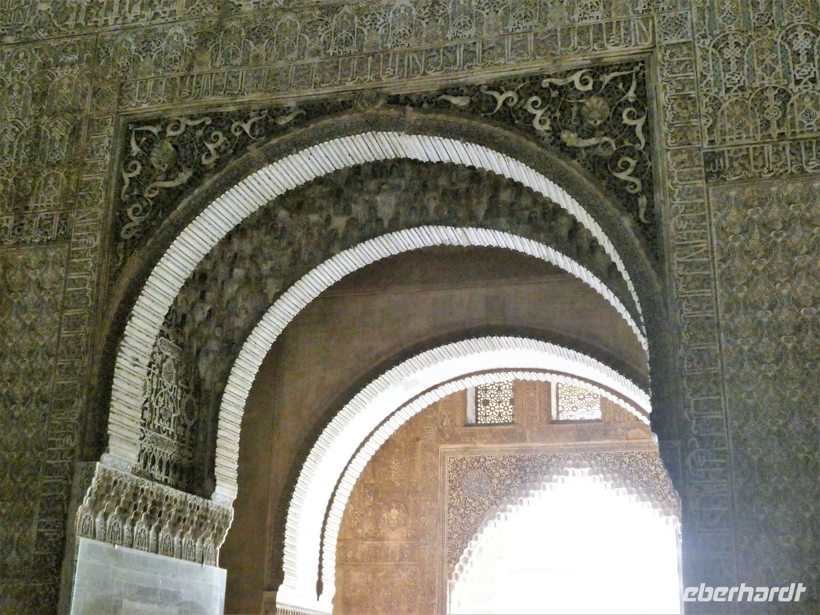 Marmorsäulen ausgestattet ist aber eine gewisse Kälte ausstrahlt. Er wurde allerdings erst lange nach dem endgültigen Untergang des Nasridenreiches im Jahr 1492 errichtet. Endlich betreten wir ihren Palast. Eine Pracht an geometrischen Formen, Säulen und Stuckgewölben empfängt uns. Ein Saal ist schöner als der vorhergehende. Alles ist eine raffinierte ästhetische Komposition die ihren Höhepunkt im Löwenhof mit dem schönen Springbrunnen hat.