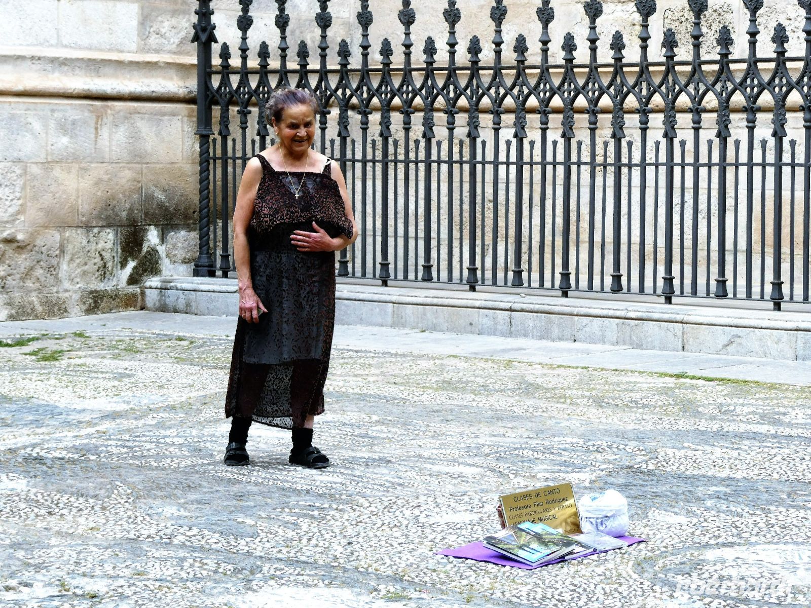 Am Nachmittag als es etwas kühler ist, beginnen wir unseren Spaziergang entlang der Alhambra hinunter zum Ausgangstor zur Stadt. Wir kommen an einem ehemaligen Tor der Nasriden vorbei und stehen am Eingang des Albaicin, dem Stadtviertel aus der arabischen Zeit. Allerdings wenden wir uns erst einmal in Richtung Kathedrale. Dort versucht eine ältere Dame, die wohl eine Gesangslehrerin ist, ihre Rentenkasse ein wenig aufzubessern. Ein rührender Anblick für uns.