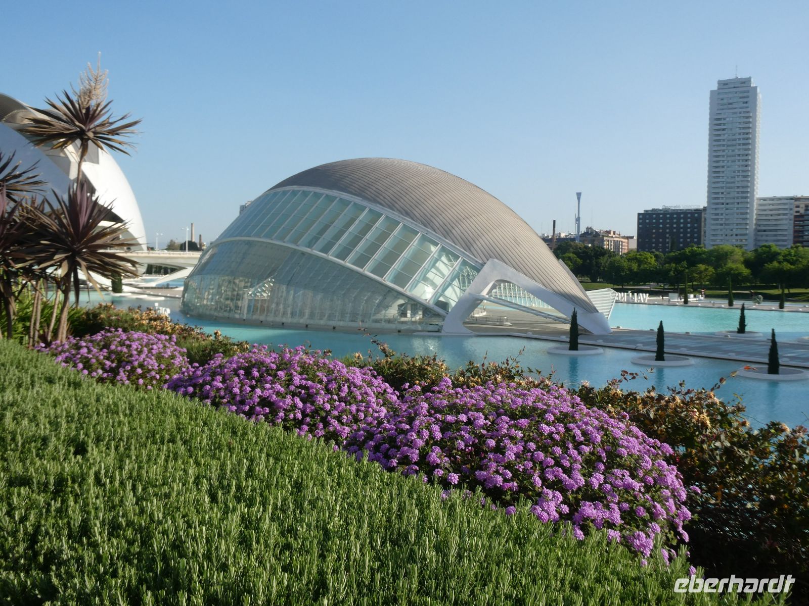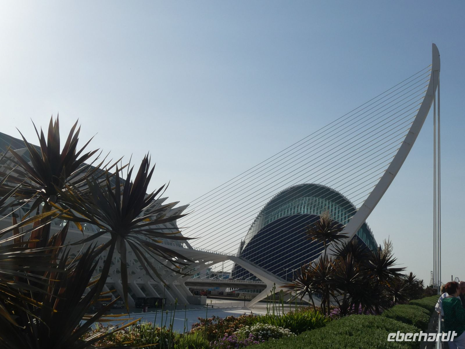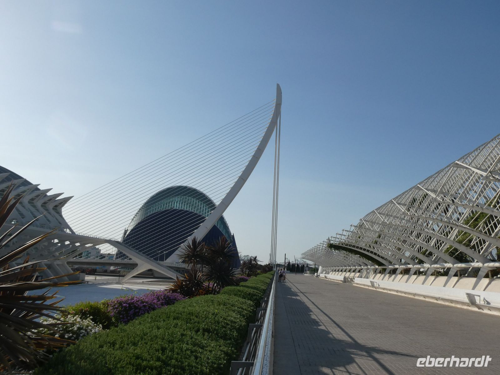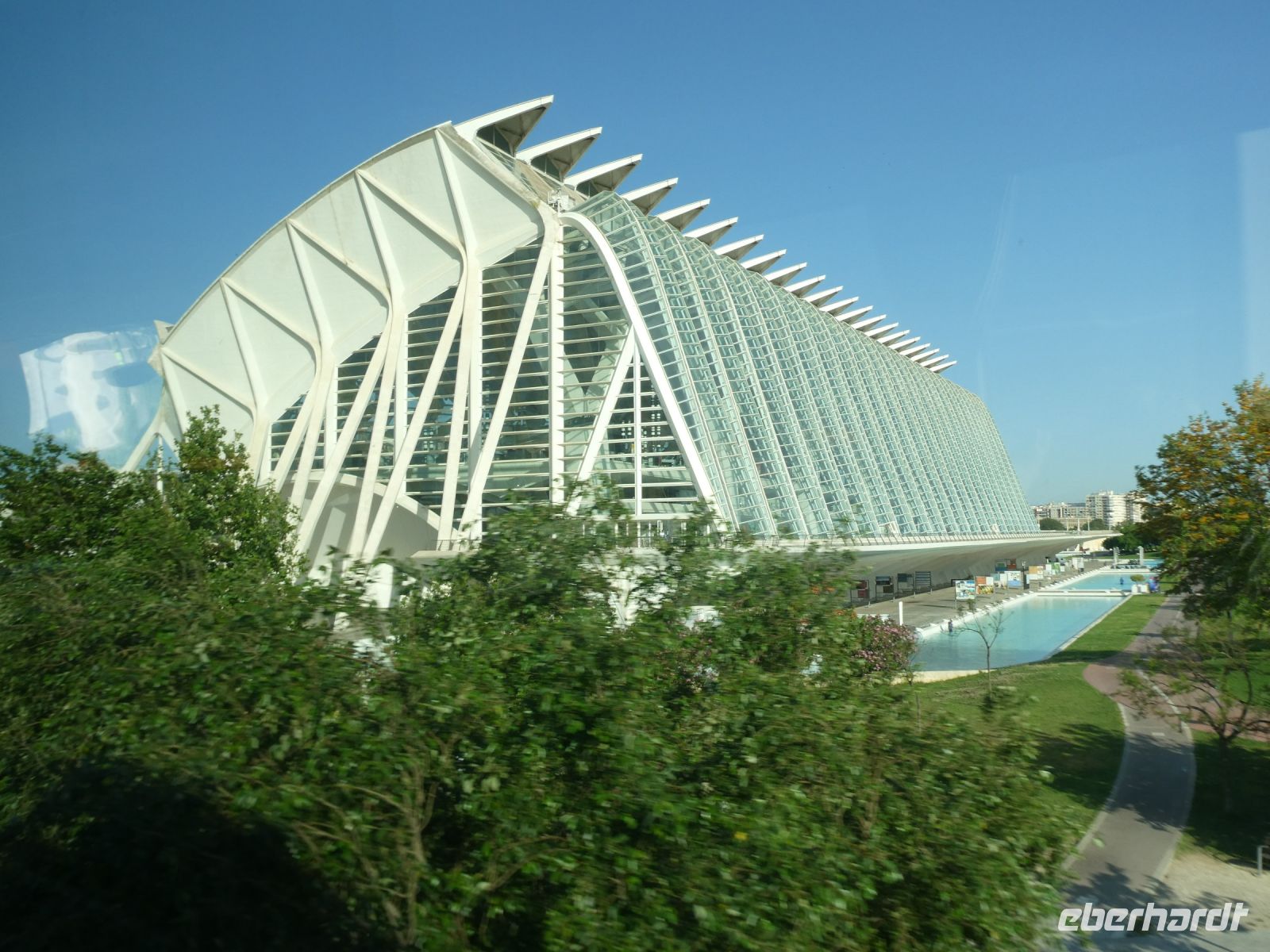 Dann aber müssen wir zurück, was gar nicht so einfach und schnell geht, denn es findet in Guadix ein Stadtlauf statt und die Straßen werden zeitweise abgesperrt. Unsere Abfahrt verzögert sich also ein wenig, was aber nichts macht, da es heute die einzige Besichtigung ist. Anschließen geht es auf direktem Weg nach Valencia, der Hauptstadt der gleichnamigen Region an der "Orangenküste". Bei der Einfahrt in die Stadt kommen wir an einer der Hauptattraktionen von Valencia vorbei, an der "Ciutat de les Arts i les Ciències" im valencianischen Dialekt ausgedrückt, was "Stadt der Künste und der Wissenschaften" bedeutet. Sie wurde vom spanischen zeitgenössischen Architekten "Santiago Calatrava" entworfen und liegt im ehemaligen Flussbett des "Turia", dem Fluss an dem die Stadt von den Römern gegründet wurde. Eine kühne moderne Architektur, die beeindruckt. Morgen werden wir mehr davon sehen.