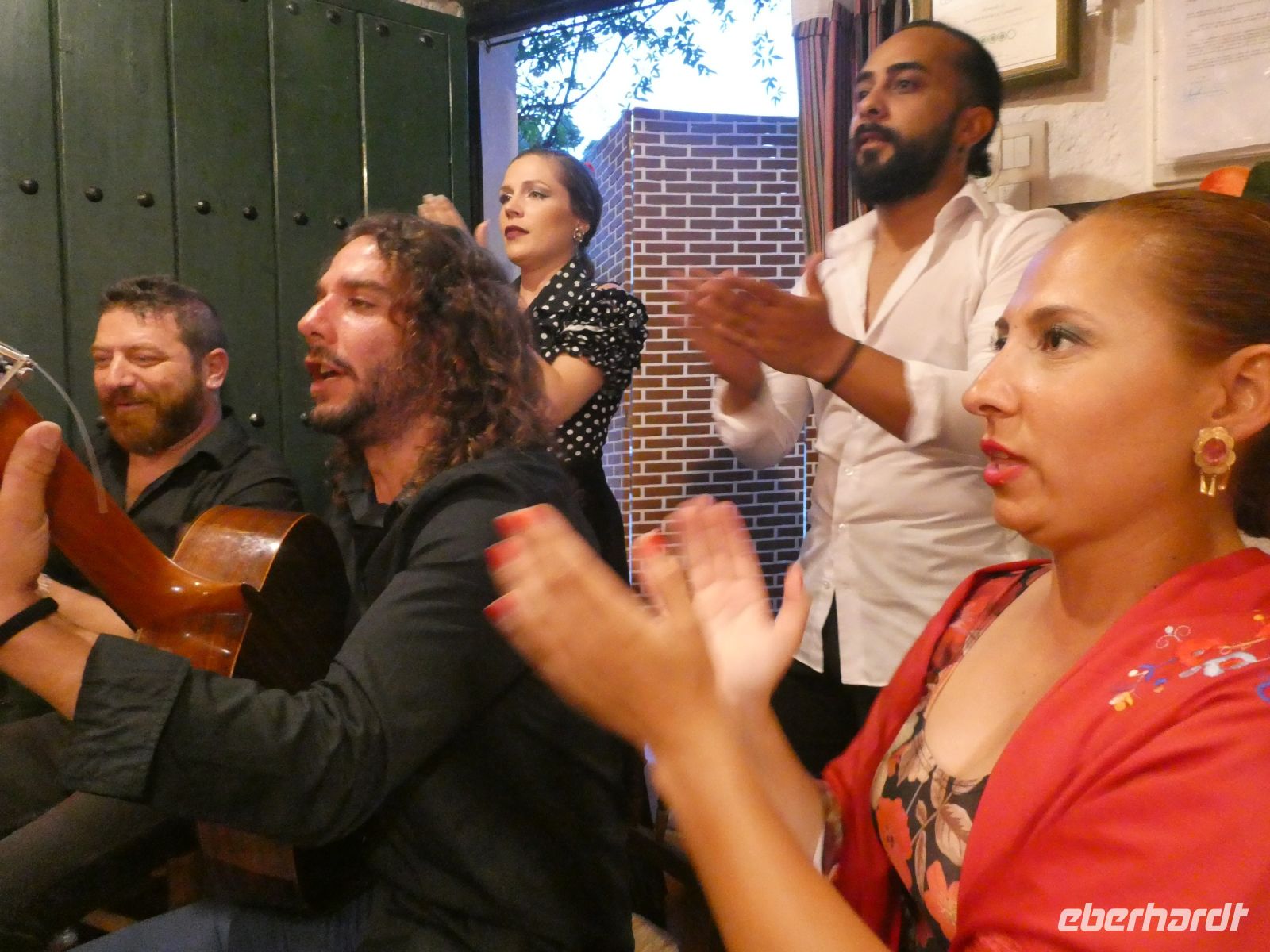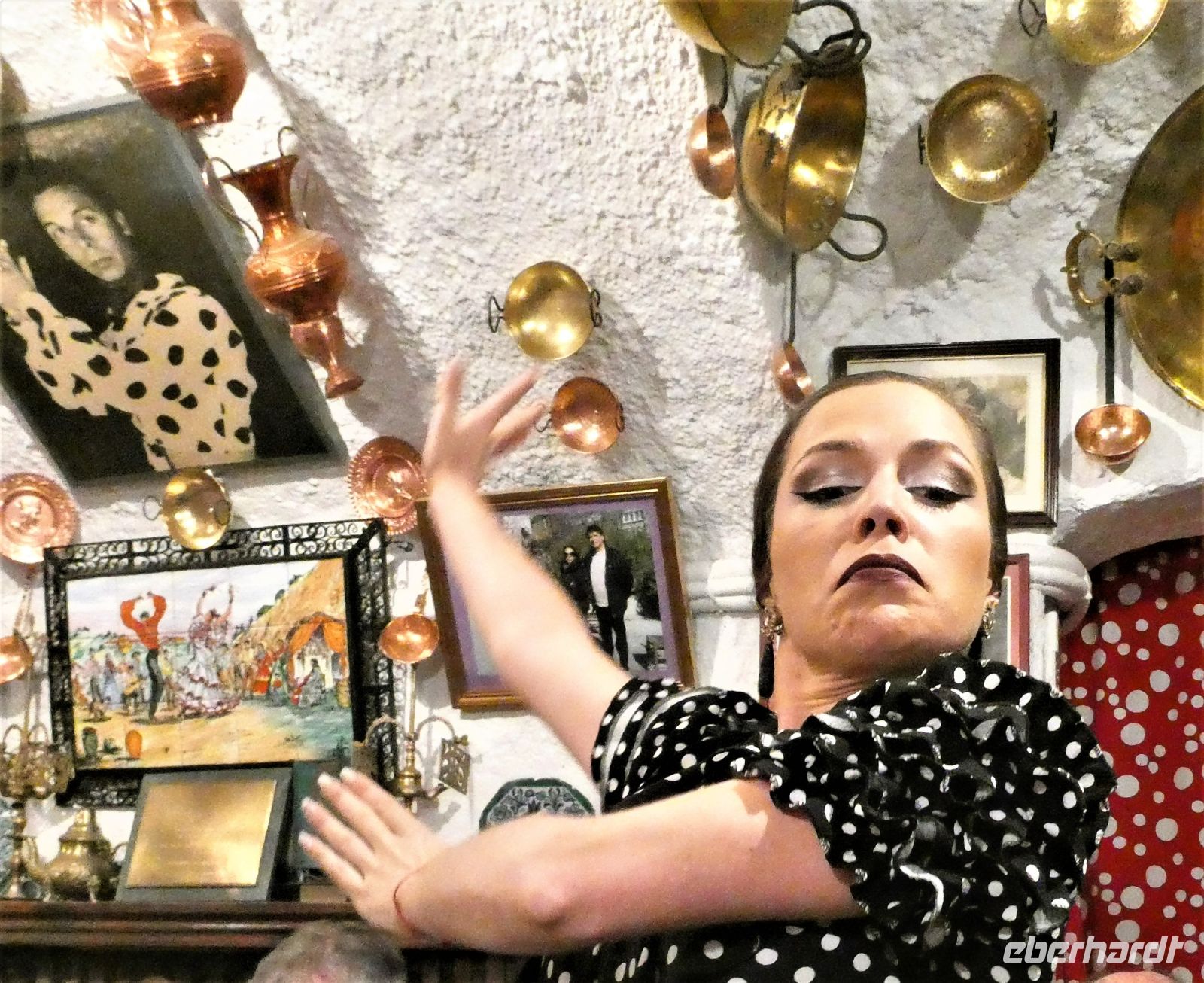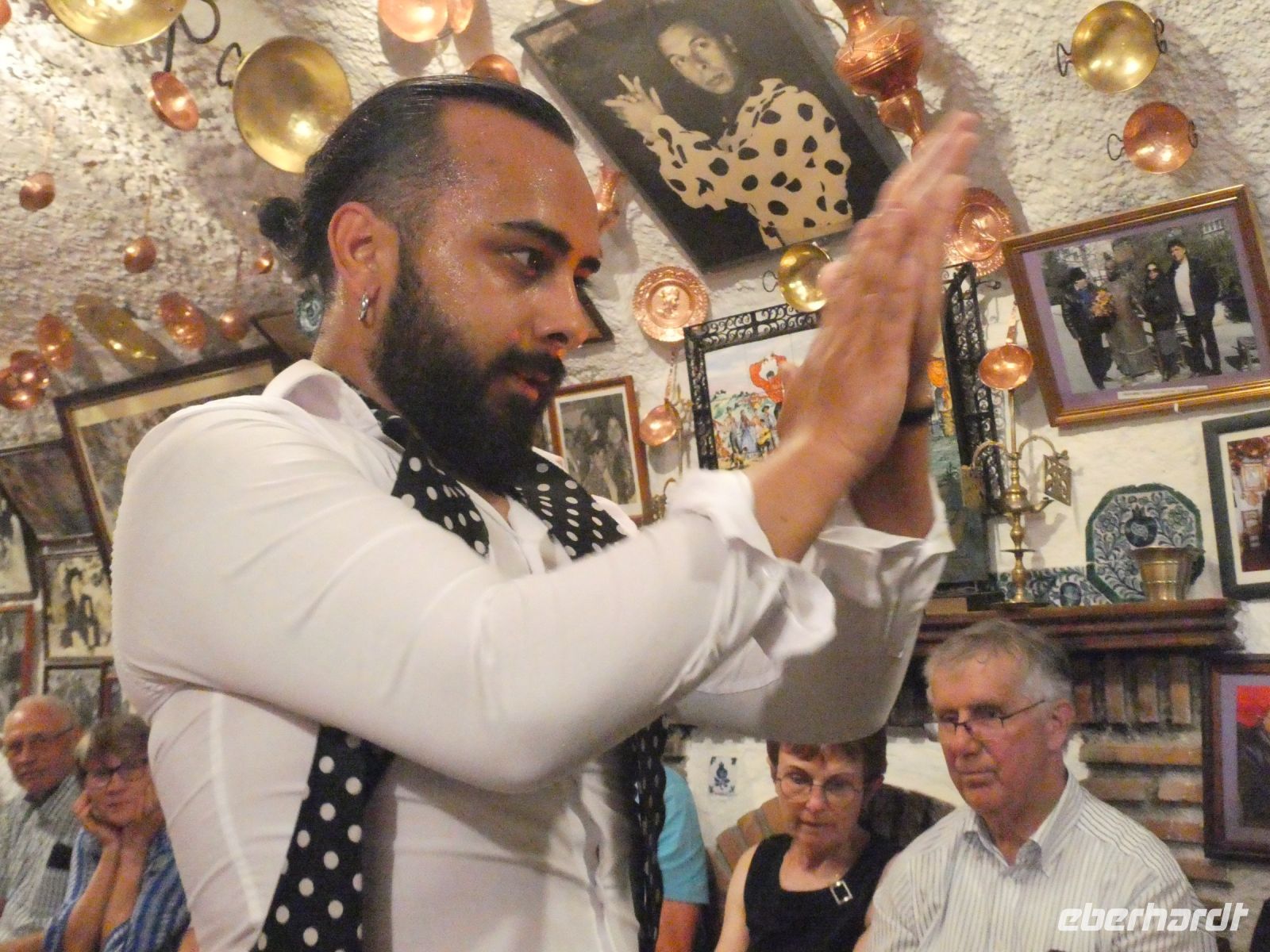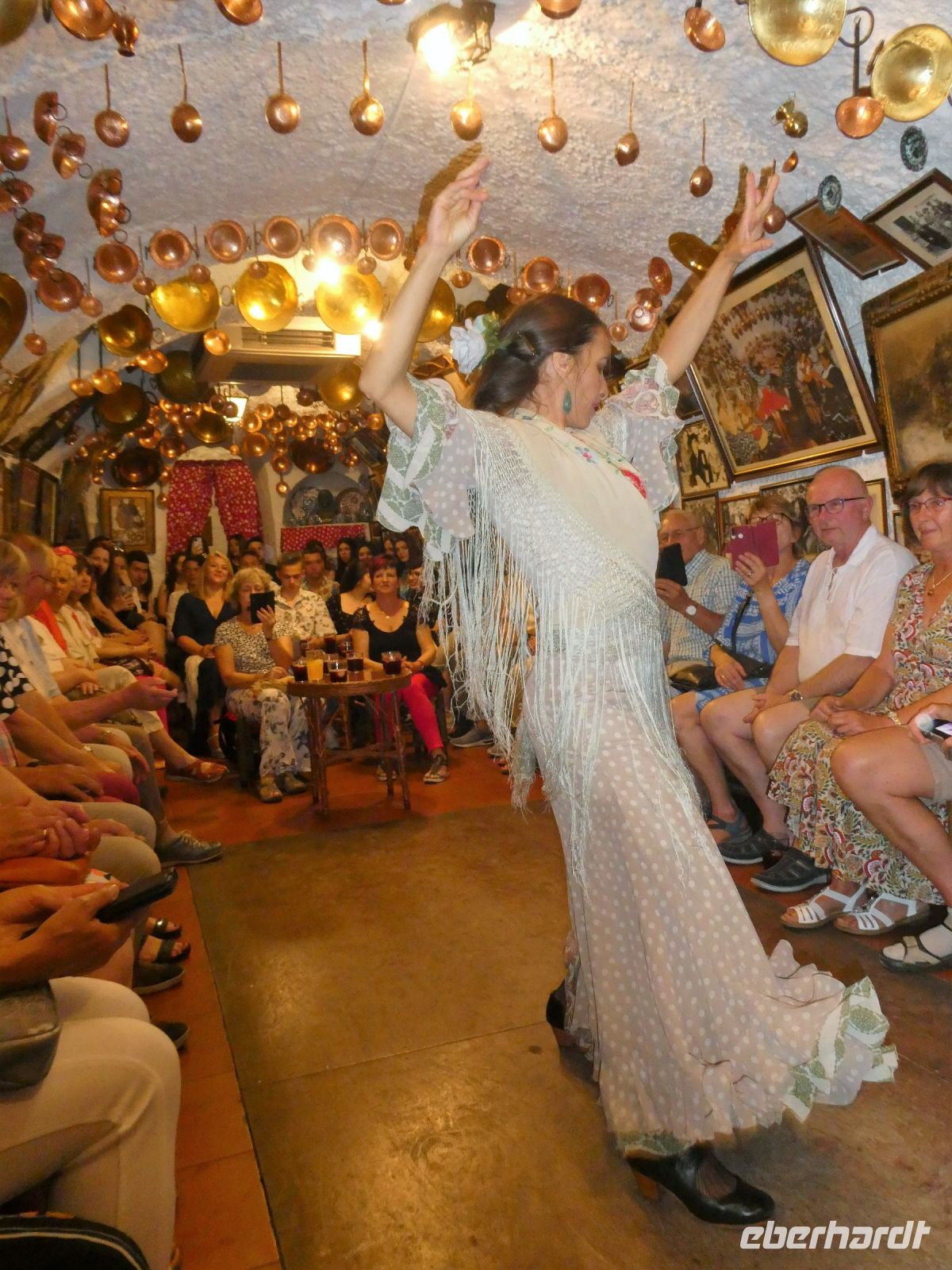 Nach dem Abendessen werden wir von einem Familienunternehmen der Roma Granadas abgeholt. Alles bleibt in der Familie. Wir fahren durch die spanische Nacht und kommen nach einer kurvenreichen Fahrt durch enge Gassen vor einem erleuchteten Haus an. Wir werden im Tablao von "Maria de Castaneda" empfangen, sitzen auf kleinen Stühlen entlang der Wand, die Bühne ist hautnah in der Mitte. Unspektakulär geht es los, als ob sich Freunde auf einen kleinen "Flamenco-Abend" getroffen haben. Man beginnt, Stiefelabsätze und die Sohlen der Damen knallen auf den Fußboden - im Takt - dazu wird geklatscht. Das erste Solo einer dunkelhaarigen Schönen, welches in Drehungen und im Steppen sich langsam steigert bis fast zur Extase. Jeder der Gruppe gibt was er kann. Irgendwann kommt ein männliches Familienmitglied an die Reihe. Mit Kraft und Leidenschaft tanzt er seinen Flamenco. Dazu spielt ein anderer junger Mann die Gitarre. Ein weiteres Damensolo, in dem wohl etwas bösartigere Emotionen im Spiel sein sollen.