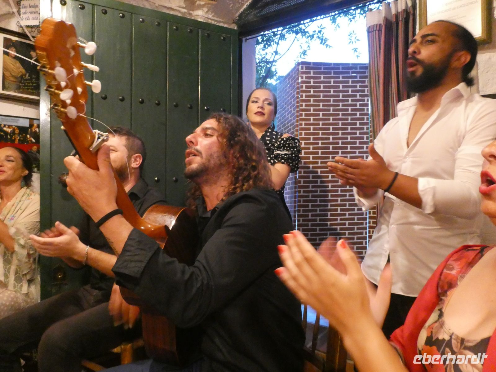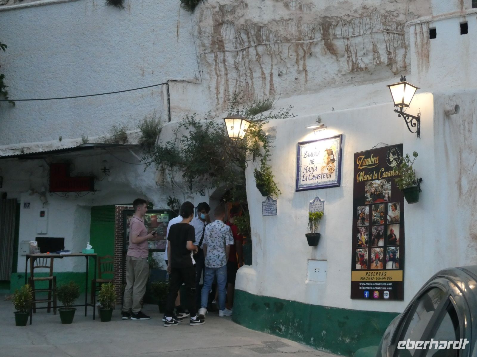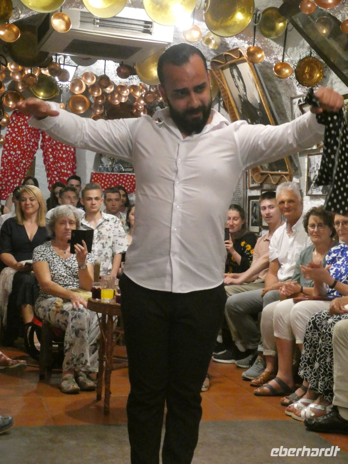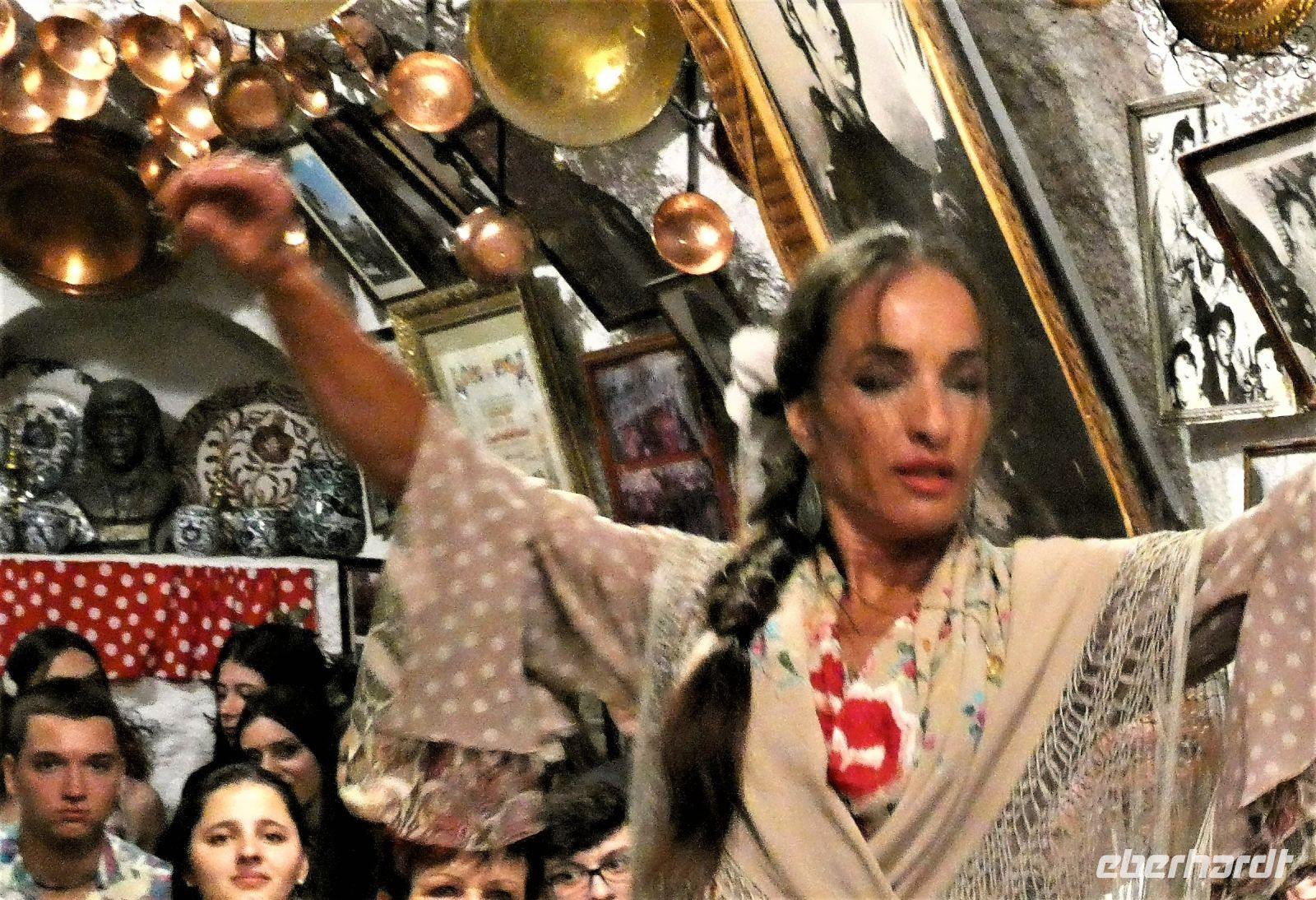 Nach dem Abendessen werden wir von einem Familienunternehmen der Roma Granadas abgeholt. Alles bleibt in der Familie. Wir fahren durch die spanische Nacht und kommen nach einer kurvenreichen Fahrt durch enge Gassen vor einem erleuchteten Haus an. Wir werden im Tablao von "Maria de Castaneda" empfangen, sitzen auf kleinen Stühlen entlang der Wand, die Bühne ist hautnah in der Mitte. Unspektakulär geht es los, als ob sich Freunde auf einen kleinen "Flamenco-Abend" getroffen haben. Man beginnt, Stiefelabsätze und die Sohlen der Damen knallen auf den Fußboden - im Takt - dazu wird geklatscht. Das erste Solo einer dunkelhaarigen Schönen, welches in Drehungen und im Steppen sich langsam steigert bis fast zur Extase. Jeder der Gruppe gibt was er kann. Irgendwann kommt ein männliches Familienmitglied an die Reihe. Mit Kraft und Leidenschaft tanzt er seinen Flamenco. Dazu spielt ein anderer junger Mann die Gitarre. Ein weiteres Damensolo, in dem wohl etwas bösartigere Emotionen im Spiel sein sollen.