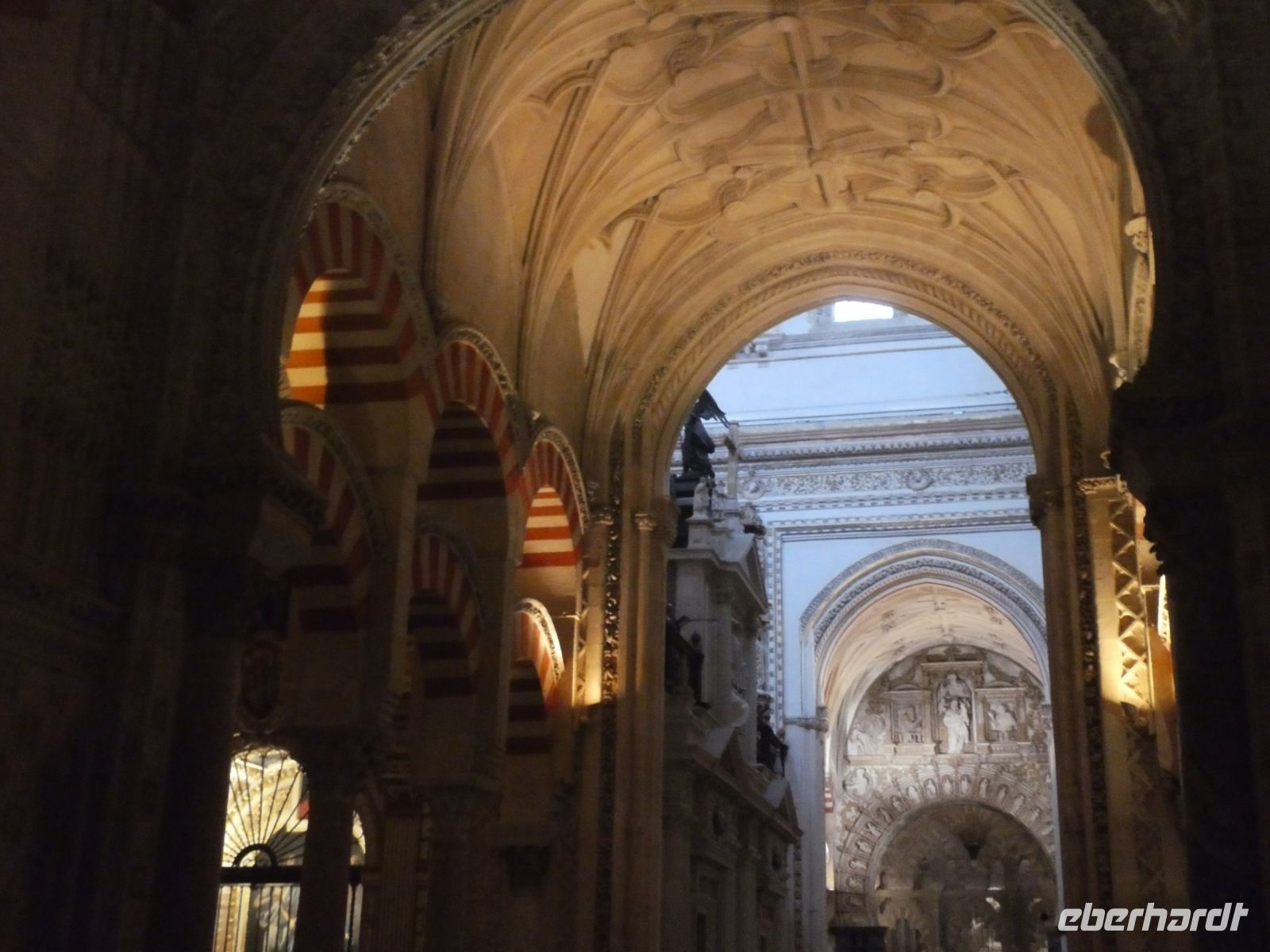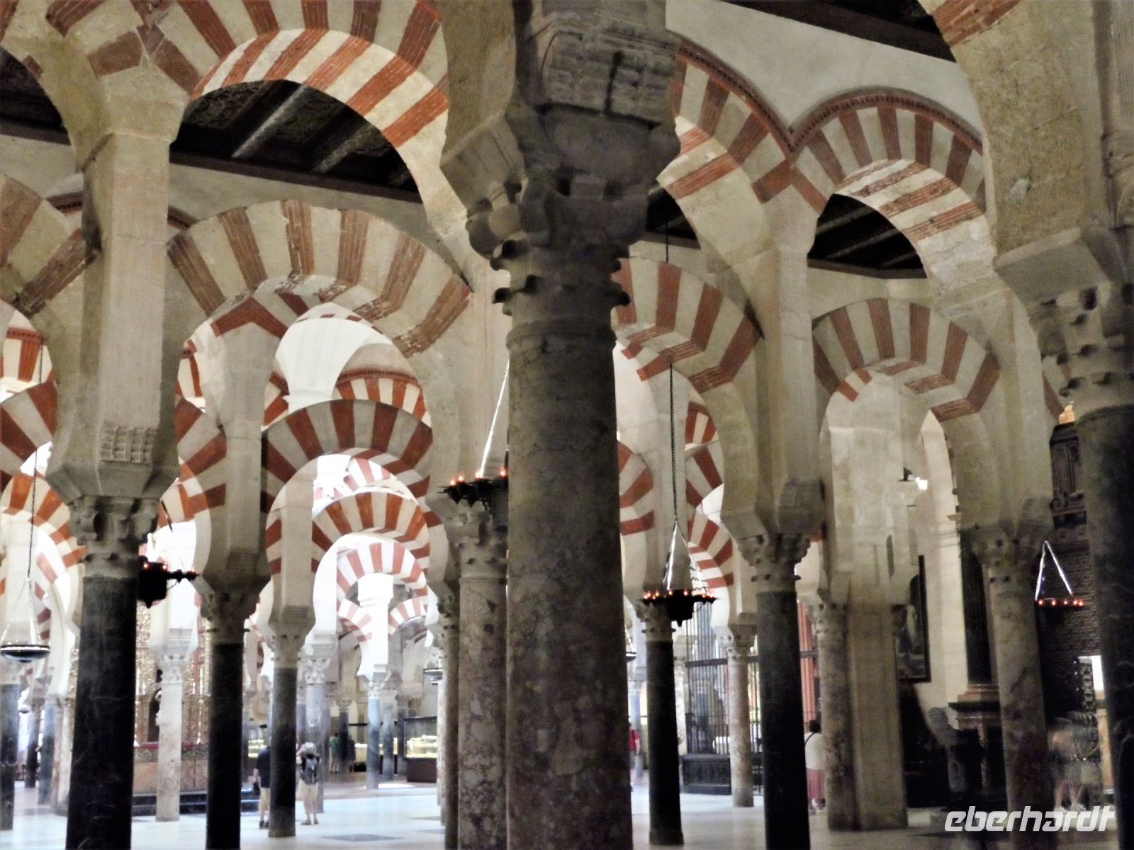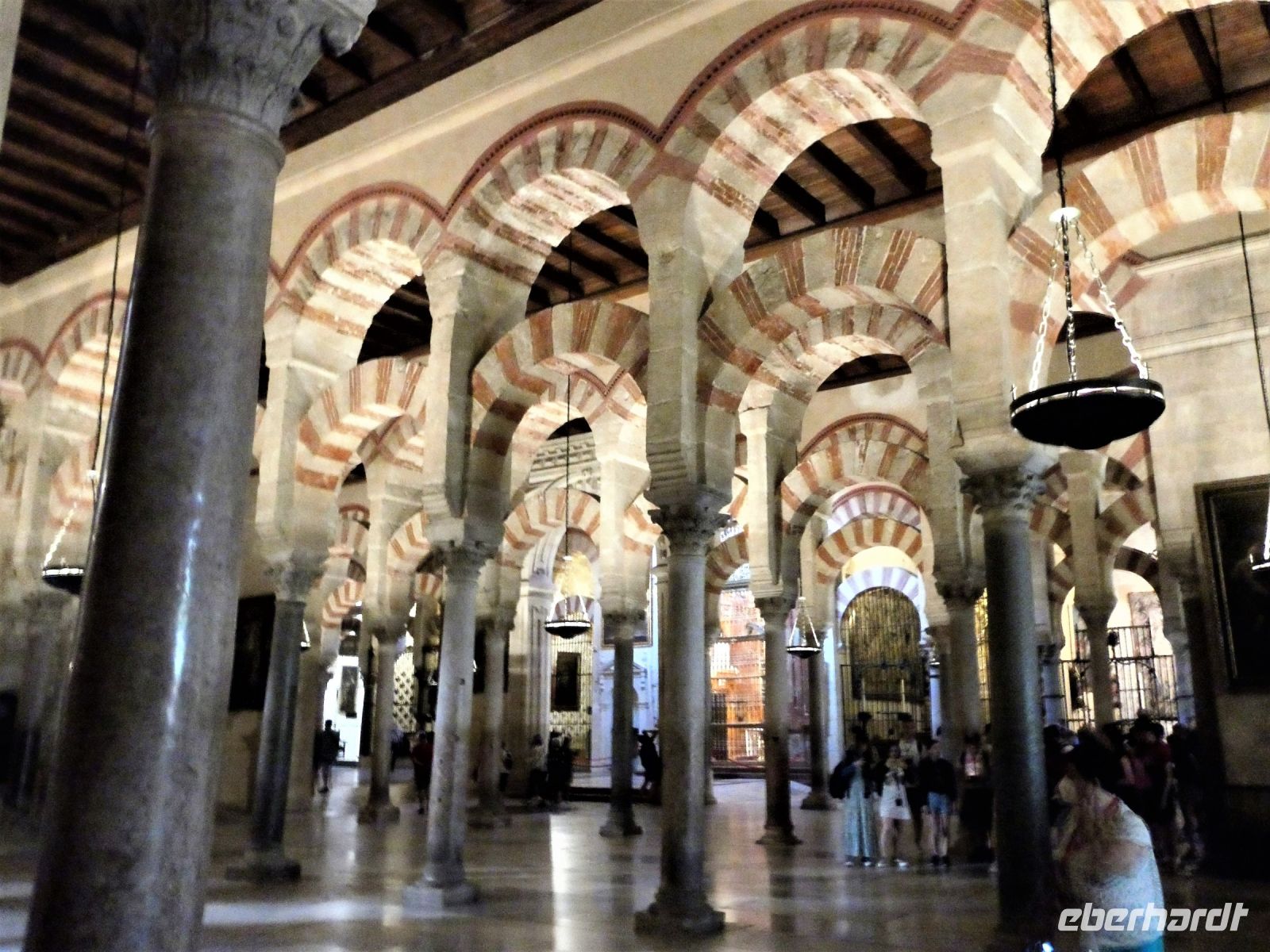 Übereinander liegende Hufeisenbögen und die 856 Säulen erzeugen eine Wirkung von Unendlichkeit und jeder der diese Halle das erste Mal betritt, hält ergriffen inne. Nach der Eroberung von den Christen im Jahr 1236 wurde die Moschee zur Kirche geweiht. Während der ersten ca.250 Jahre beschränkte man sich auf kleine Änderungen. Aber mit Billigung des Kaisers Karl V. wurden dann die mittleren Säulen, um eine Kirchengebäude zu errichten, entfernt. Das Minarett wurde durch einen Glockenturm ersetzt bzw. umgebaut.