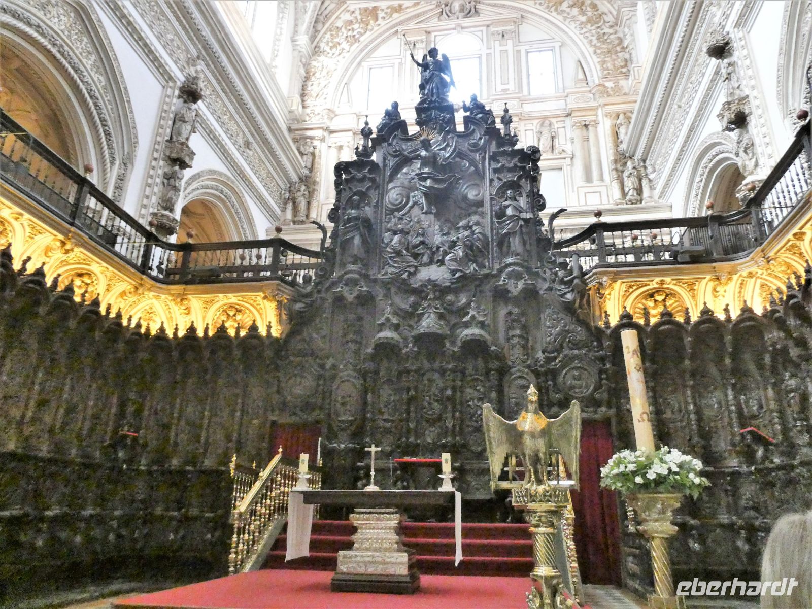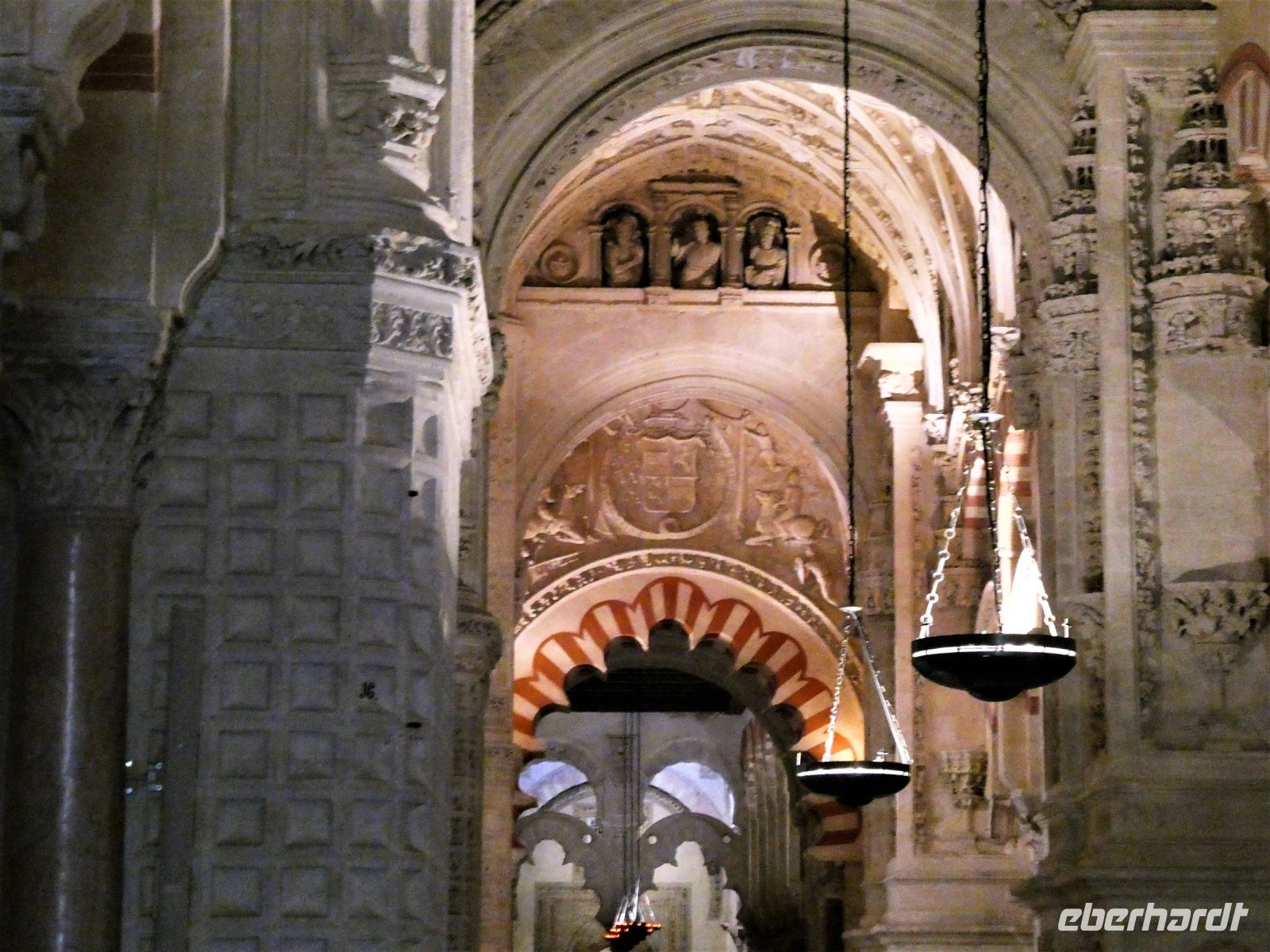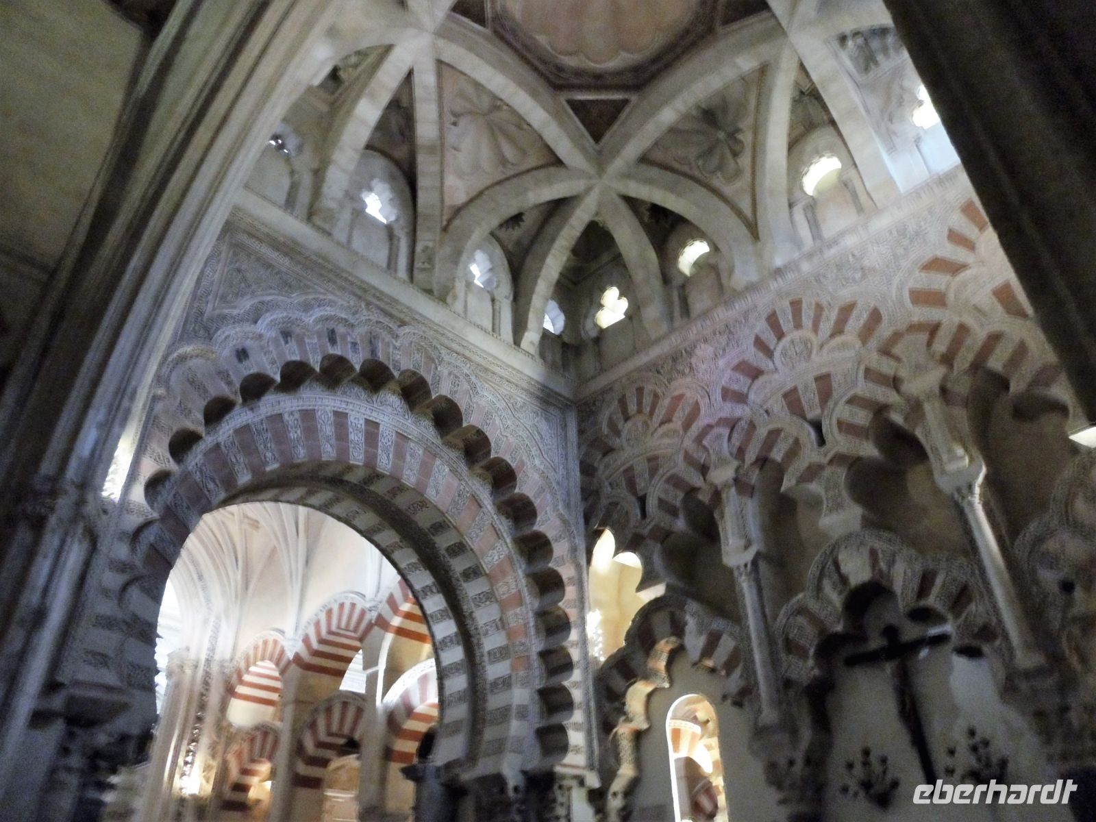 Übereinander liegende Hufeisenbögen und die 856 Säulen erzeugen eine Wirkung von Unendlichkeit und jeder der diese Halle das erste Mal betritt, hält ergriffen inne. Nach der Eroberung von den Christen im Jahr 1236 wurde die Moschee zur Kirche geweiht. Während der ersten ca.250 Jahre beschränkte man sich auf kleine Änderungen. Aber mit Billigung des Kaisers Karl V. wurden dann die mittleren Säulen, um eine Kirchengebäude zu errichten, entfernt. Das Minarett wurde durch einen Glockenturm ersetzt bzw. umgebaut.