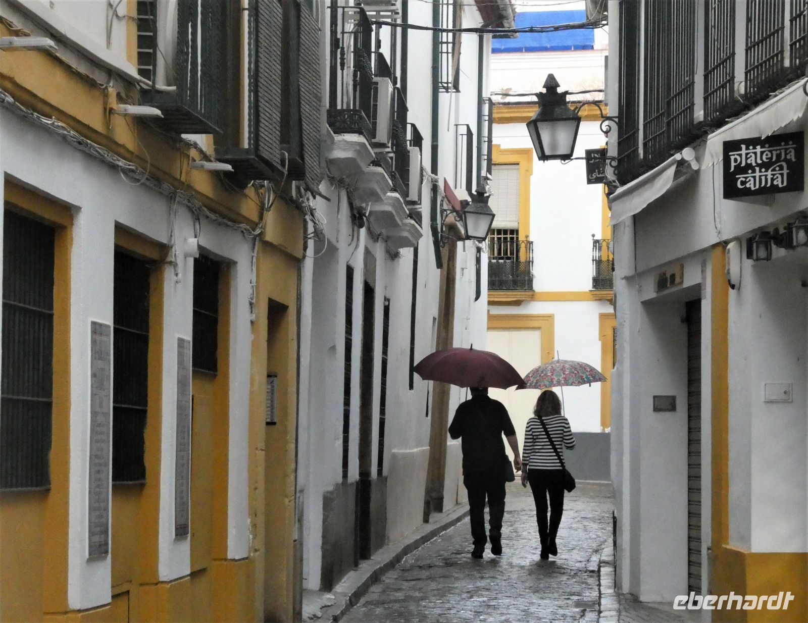 Nach dieser eindrücklichen Besichtigung müssen wir zum Bus, denn wir wollen heute noch nach Sevilla. Ein Wolkenbruch stürzt sich auf uns, der aber allmählich nachlässt. Wir haben so die Chance einigermaßen trocken zum Bus zu gelangen, der schon auf uns wartet. Wir fahren pünktlich los. Auf dem Weg zur Hauptstadt Andalusiens klart der Himmel auf und die Sonne scheint ab und an. ´