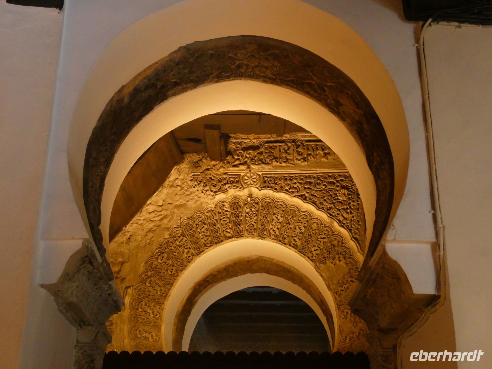 Hier an der Stelle eines einstigen römischen Tempels errichteten die Mauren eine neue Moschee. die im Laufe ihrer Herrschaft mehrfach vergrößert wurde. Für den Moscheebau wurden zahlreiche Säulen aus der Römerzeit in der Säulenhalle integriert. Das Ergebnis war eine Gebetshalle von gigantischem Ausmaß. Wir stellen uns vor wie in dieser damals von Licht durchfluteten Säulenhalle die Gläubigen zu dem rituellen Gebet der Muslime in einer Reihe sich gen Mekka vor Allah verneigten und ihr Gebet murmelten. Die heutige Ausdehnung, inklusive des Orangenhofs, erreichte die Moschee im 10.Jahrhundert und bedeckt heute eine Grundfläche von 23.000 qm.