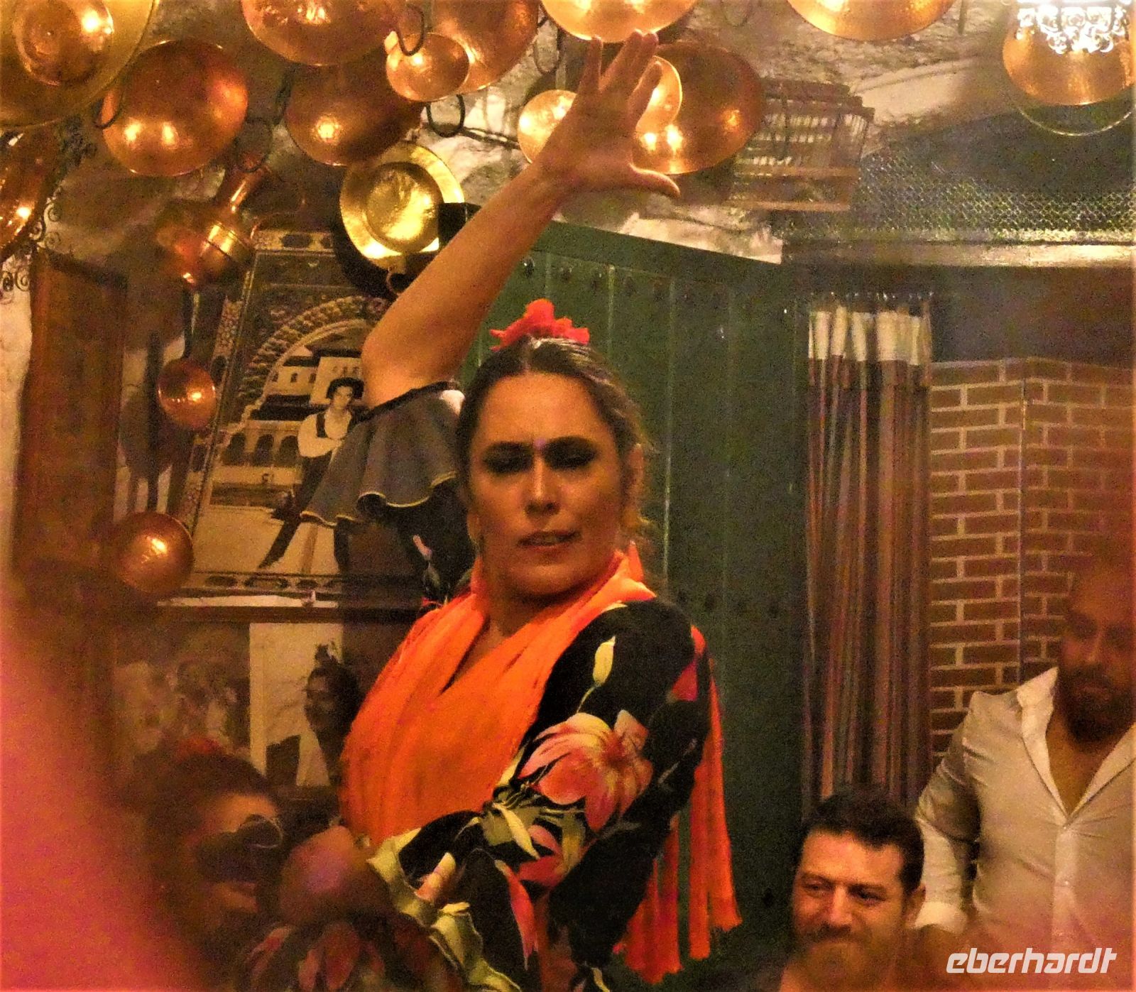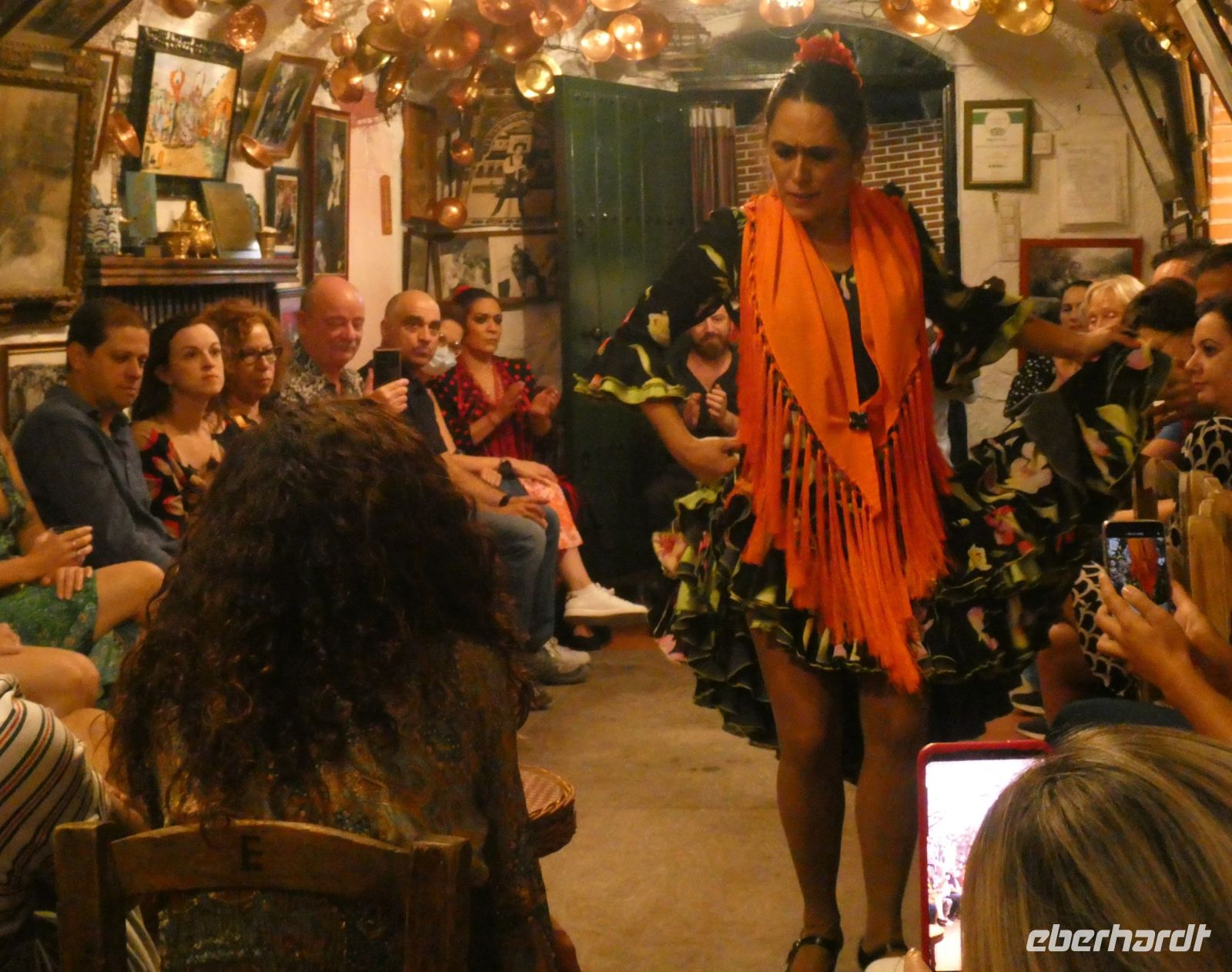 Nach dem Abendessen werden wir von einem Kleinbus abgeholt. Alles bleibt in der Familie. Wir fahren durch die spanische Nacht und kommen nach einer kurvenreichen Fahrt durch enge Gassen vor einem erleuchteten Haus an. Wir werden im Tablao von "Maria de Castaneda" empfangen, sitzen auf kleinen Stühlen, die Bühne ist hautnah in der Mitte. Unspektakulär geht es los, als ob sich Freunde auf einen kleinen "Flamenco-Abend" getroffen haben. Man beginnt, Stiefelabsätze und die Sohlen der Damen knallen auf den Fußboden - im Takt - dazu wird geklatscht. Das erste Solo einer dunkelhaarigen Schönen, welches in Drehungen und im Steppen sich langsam steigert.