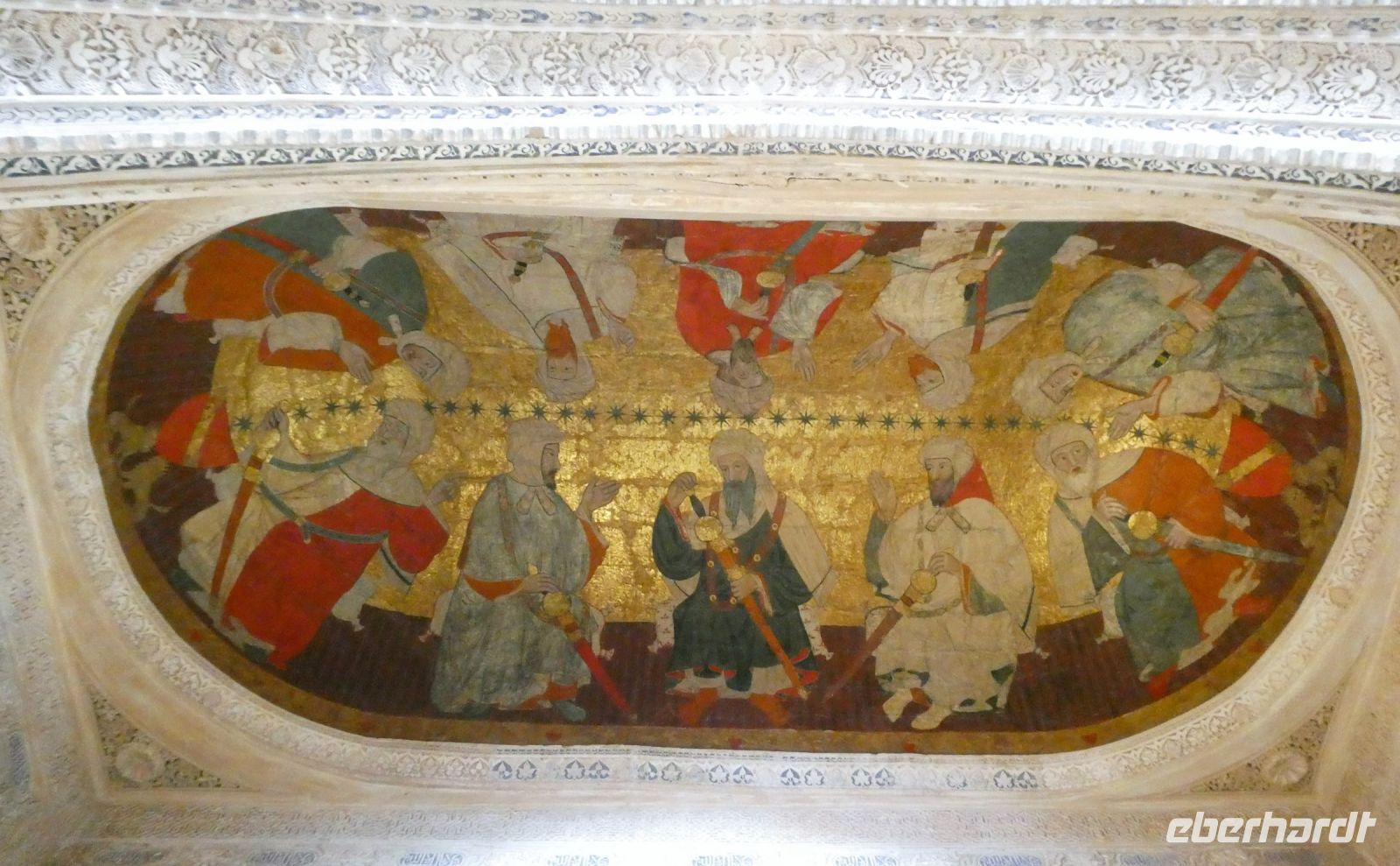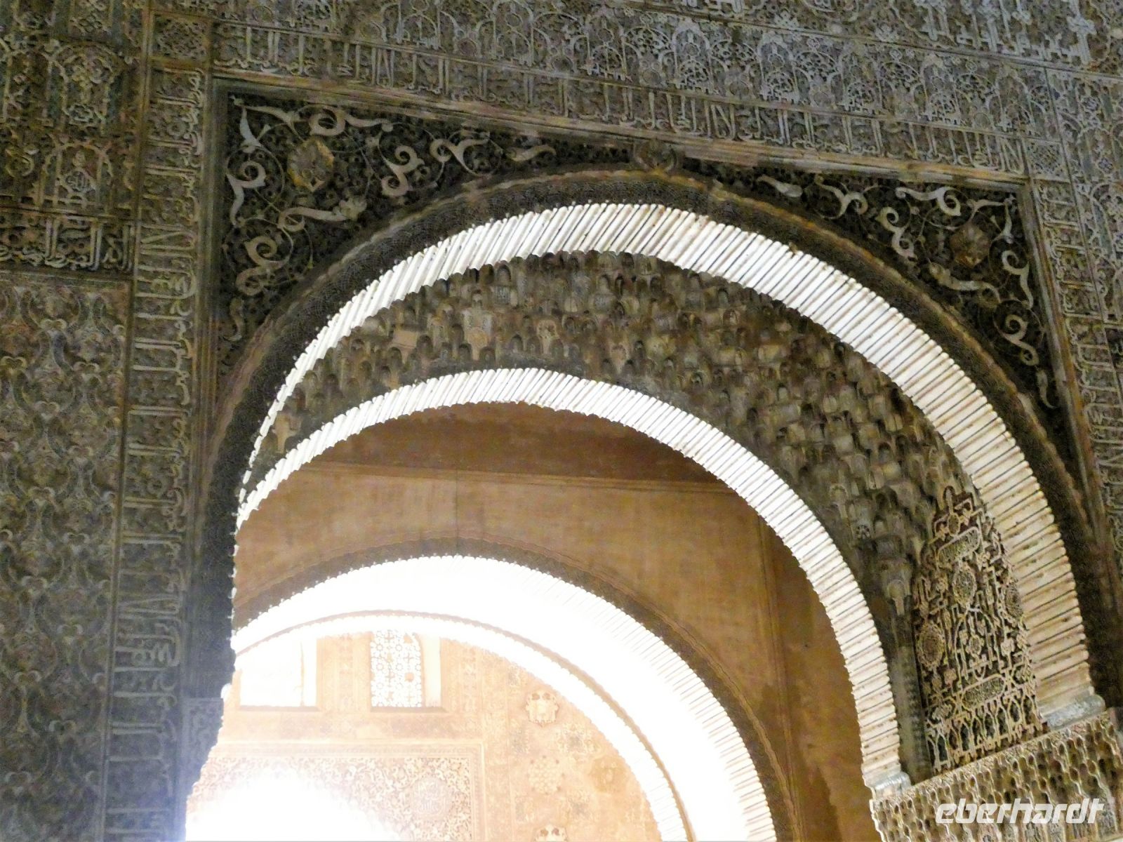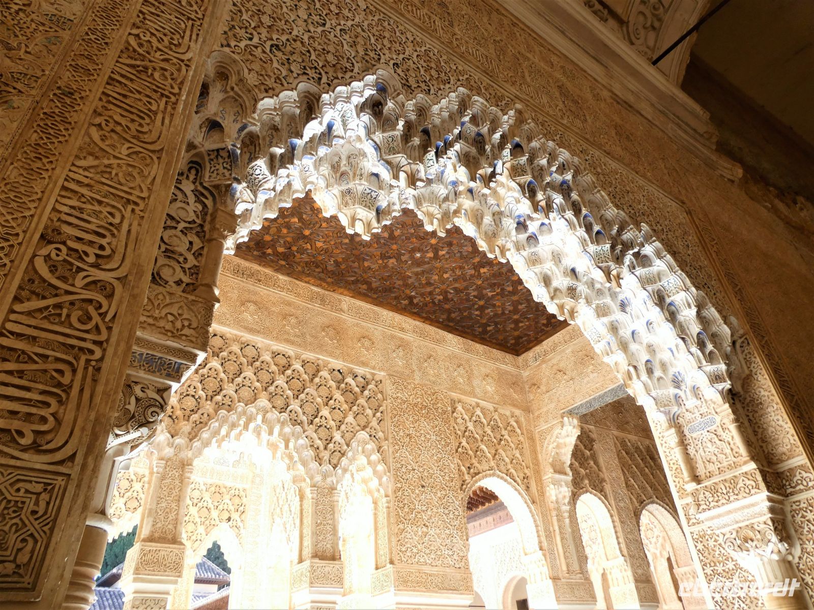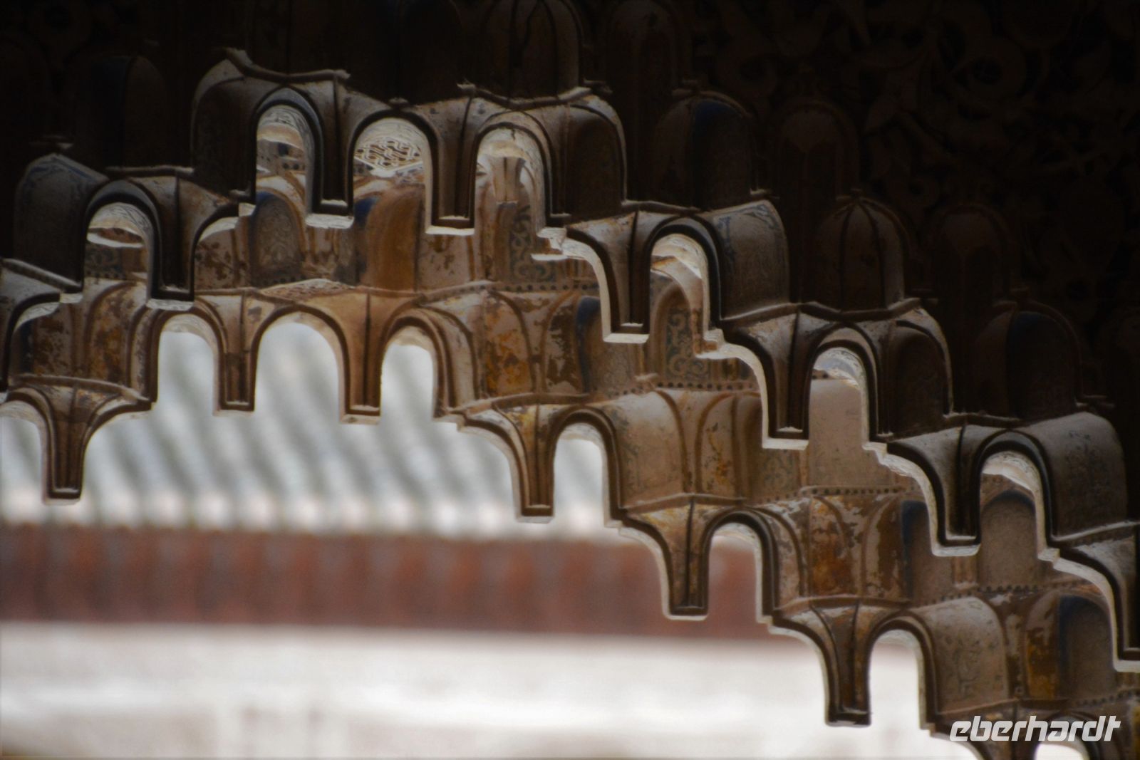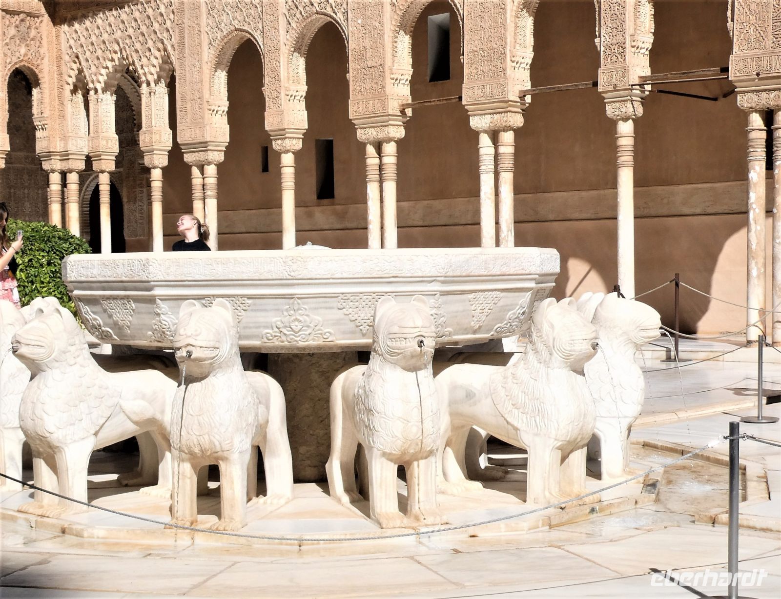 Endlich betreten wir ihren Palast. Eine Pracht an geometrischen Formen, Säulen und Stuckgewölben empfängt uns. Ein Saal ist schöner als der vorhergehende. Alles ist eine raffinierte ästhetische Komposition, die ihren Höhepunkt im Löwenhof mit dem schönen Springbrunnen hat.