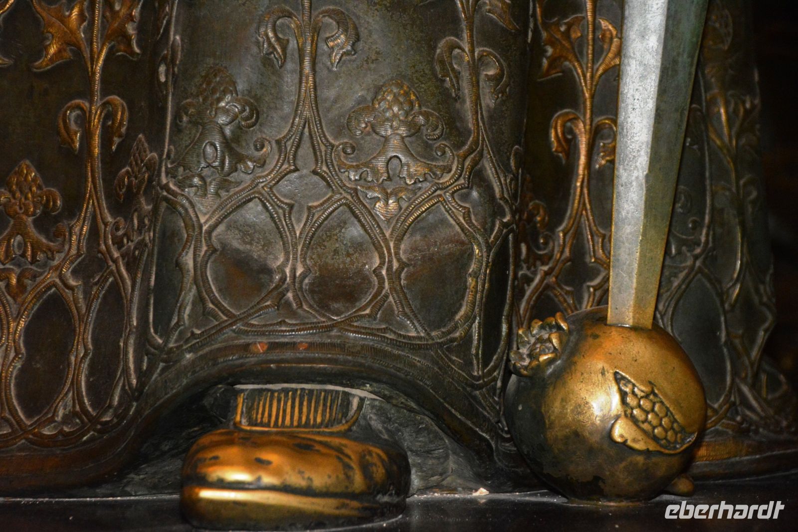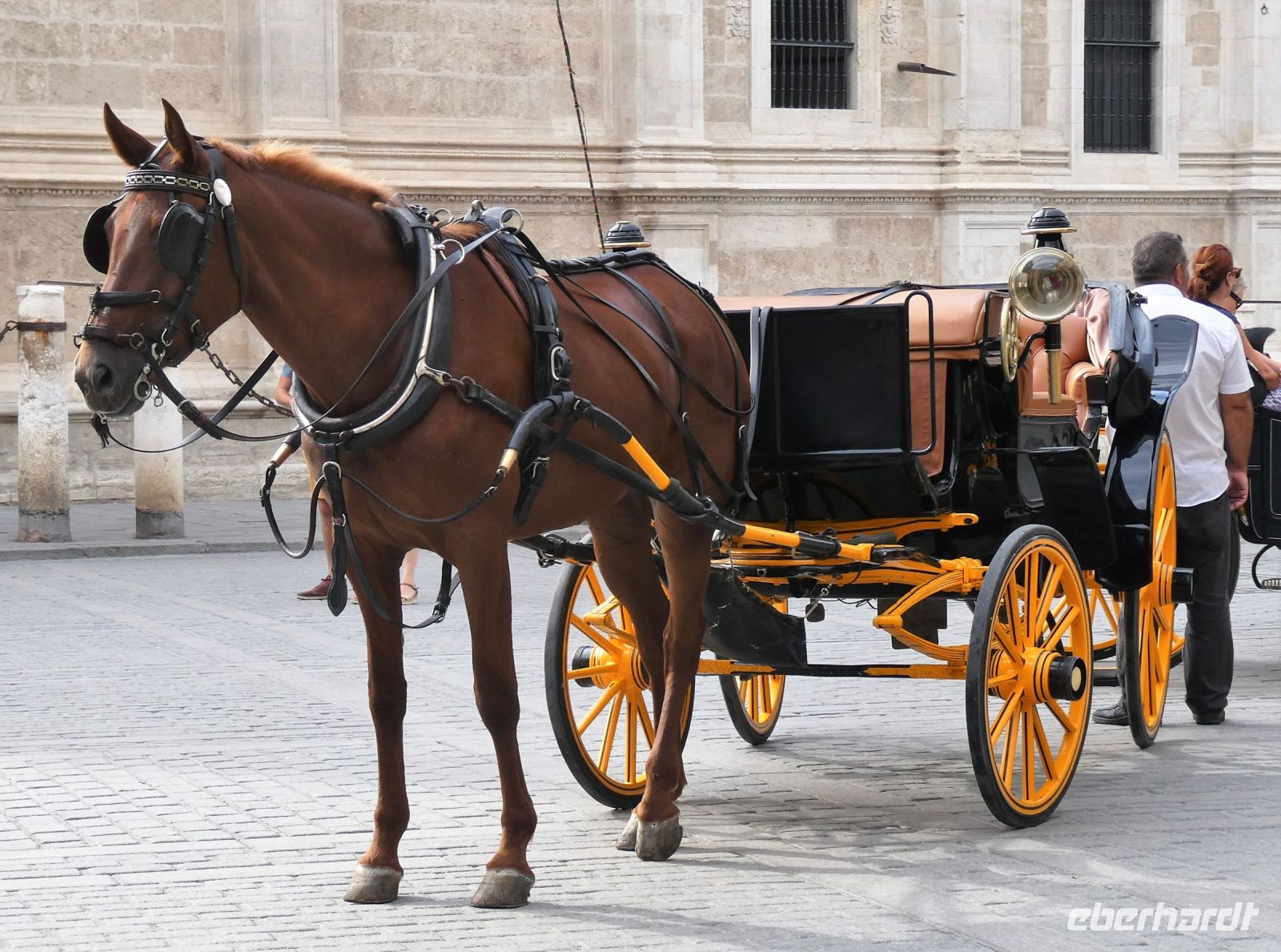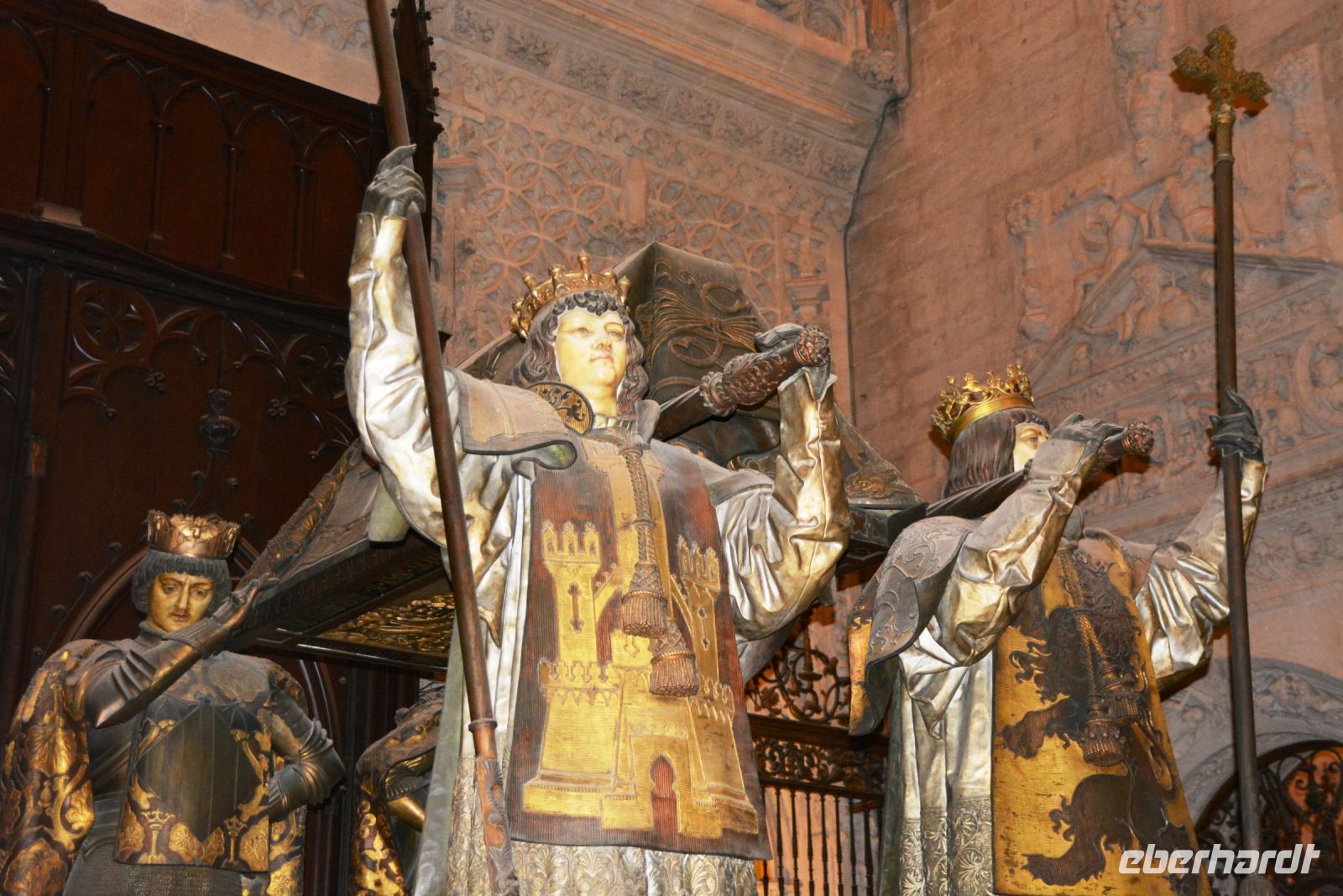 Der Hauptaltar der Kathedrale ist von Gold überbordend. Gold welches aus der sog. "Neuen Welt" stammte. In der Kathedrale ist auch das Grab von "Christobal Colon" dessen sterbliche Überreste wohl mehrfach zwischen Lateinamerika und Spanien hin und her wanderten. Hier befinden sich aber nach neuesten Untersuchungen die nachweislich "richtigen". Sein Grab ist beeindruckend, wird doch sein Sarg von vier Bronzefiguren getragen: sie repräsentieren die Königreiche Kastilien, León, Aragón und Navarra. Fast alle besteigen den Glockenturm um einen Überblick über Sevilla zu bekommen. Früher ritt hier der Muezzin 5 Mal am Tag nach oben um die Gläubigen zum Gebet zu rufen.