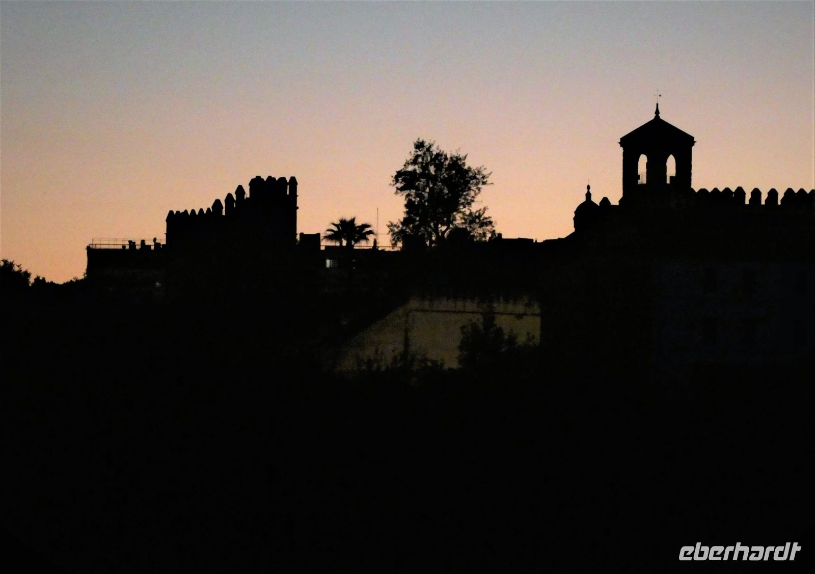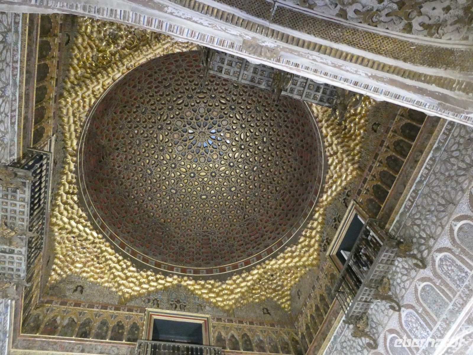 Jetzt geht es weiter zum zweitwichtigsten Bauwerk des alten Sevilla, dem "Real Alcazar". Den Palast im Stil des "Mudejar" ließ "Pedro I.", ein christlicher Herrscher, errichten. Er entstand innerhalb einer Palastanlage der "Almohaden", jener muslimischen Herrscher aus Nordafrika. Baumeister aus Granada und Toledo erschufen dieses prachtvolle Bauwerk. Spätere Monarchen wie Isabella I und Karl V. ergänzten und erweiterten es. Azulejos (Fliesen) und Stuck zieren den Botschaftersaal. Die Kuppel ist eine Stalaktiten Kuppel und besteht aus vergoldeten Holzintarsien. Im "Mädchenhof" einem Patio im Palast bewundern wir die kunstvollen Verzierungen. Es bleibt noch ein wenig Zeit um in den wunderbaren Gärten zu spazieren. Unsere Stadtführerin spaziert mit uns noch durch das jüdische Viertel entlang lauschiger Plätze die sich am Abend wieder mit Menschen füllen. Wir kommen voll der Eindrücke und Informationen in unser Hotel zurück und entspannen uns beim Abendessen, was nicht lange auf sich warten lässt. Ein interessanter Tag geht zu Ende.