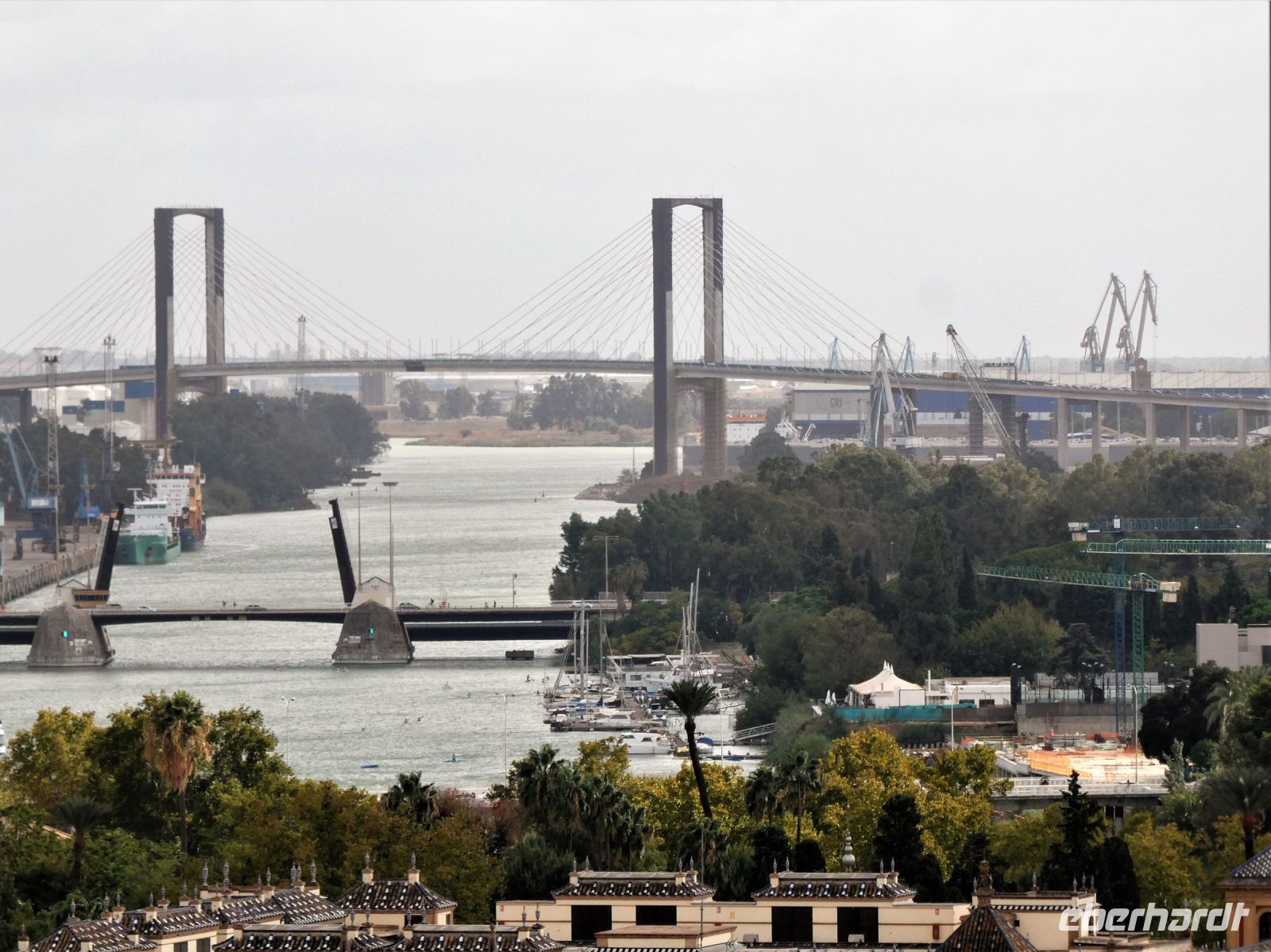 Nach einer kurzen Erholung im Bus während unserer Weiterfahrt an die Küste kommt schon bald die verhältnismäßig neue "Puente da la Constitución" in Sicht. Sie verbindet Cádiz direkt mit dem Festland und hat eine Gesamtlänge von über 3000 m. Sie hat die größte Spannweite der spanischen Schrägseilbrücken und sie ist die drittgrößte in Europa. Jetzt auf der Hinfahrt überqueren wir aber die alte Brücke und haben so einen schönen Blick auf die diese sog. Neue Brücke.