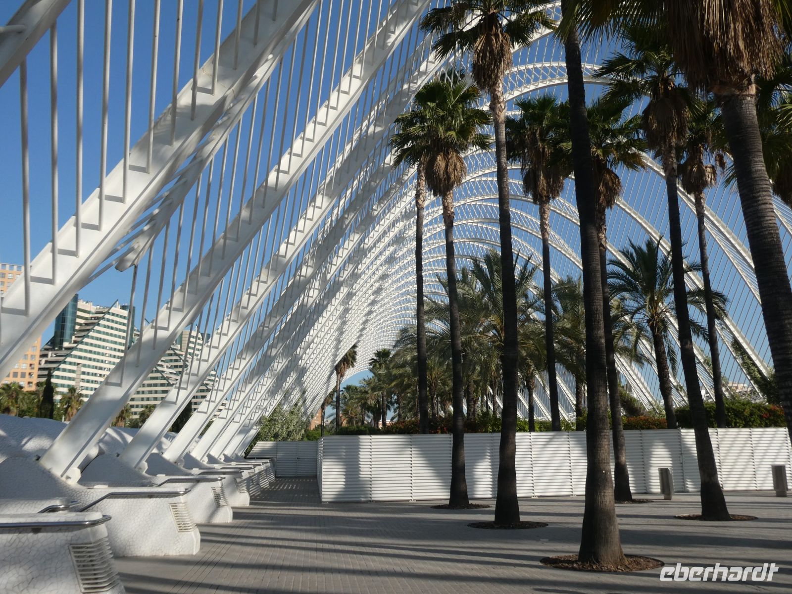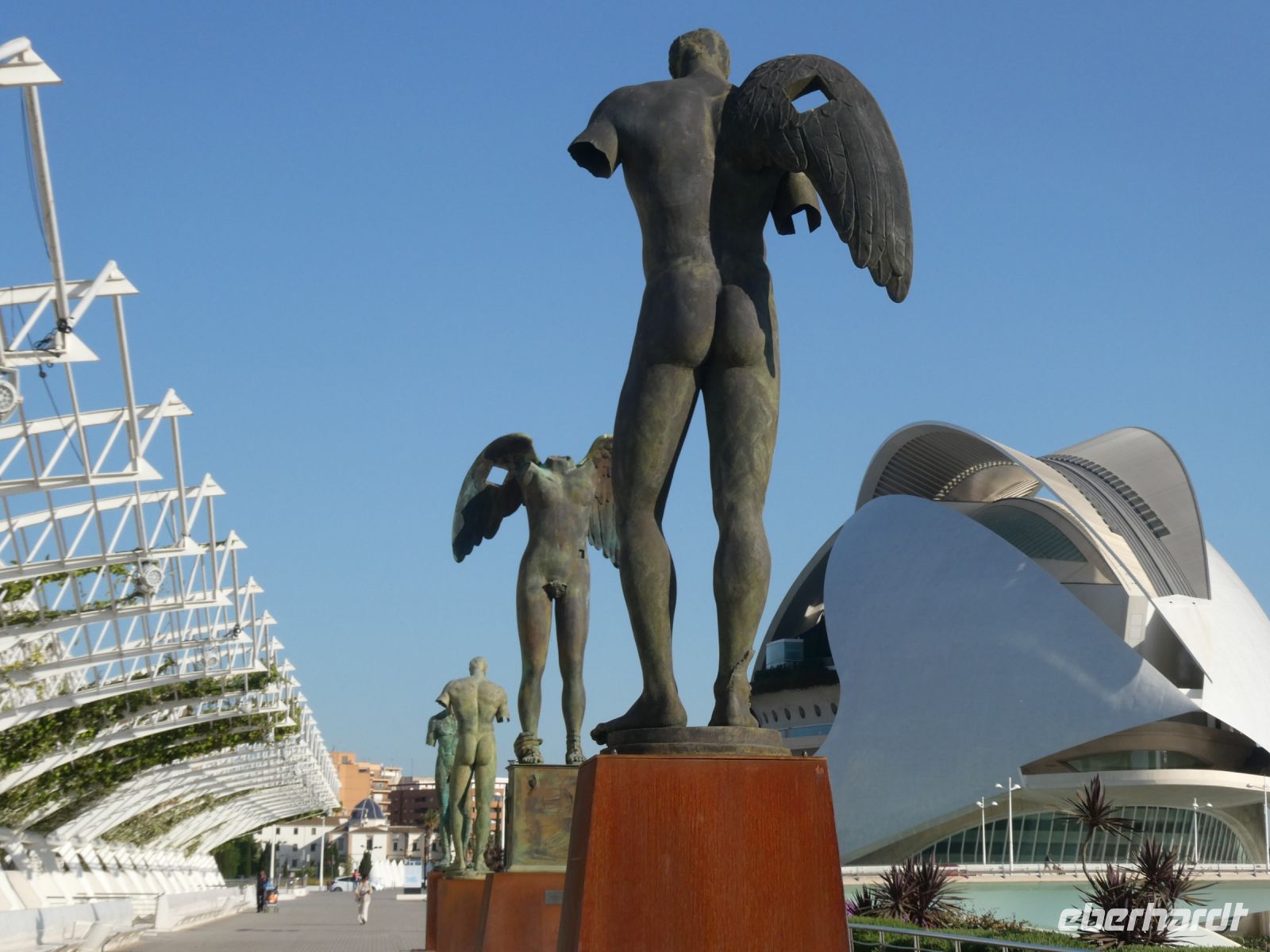 Für uns geht es auf direktem Weg nach Valencia, der Hauptstadt der gleichnamigen Region an der "Orangenküste". Bei der Einfahrt in die Stadt kommen wir an einer der Hauptattraktionen von Valencia vorbei, an der "Ciutat de les Arts i les Ciències" im valencianischen Dialekt ausgedrückt, was "Stadt der Künste und der Wissenschaften" bedeutet. Sie wurde vom spanischen, zeitgenössischen Architekten "Santiago Calatrava" entworfen und liegt im ehemaligen Flussbett des "Turia", dem Fluss an dem die Stadt von den Römern gegründet wurde. Eine kühne moderne Architektur, die beeindruckt. Wir steigen aus und betrachten die monumentalen Bronzeskulpturen des polnischen Künstlers und Bildhauers "Igor Mitoraj" welche die moderne Architektur unterstreichen. Auch die Architektur von Calatrava ist kühn und angelehnt an das Meer. So kann man in den Gebäuden Fische, Flossen oder aufgesperrte Mäuler erkennen oder phantasieren. Leider ist die Beleuchtung der Gebäude, aufgrund der von den Spaniern und Europa beschlossenen Energiesparmaßnahmen, abgeschaltet, was wir aber noch nicht wissen, Einige bemerken es bei ihrem Abendspaziergang. Unser Hotel liegt im modernen Hotelviertel, welches leider etwas abseits des Zentrums liegt.