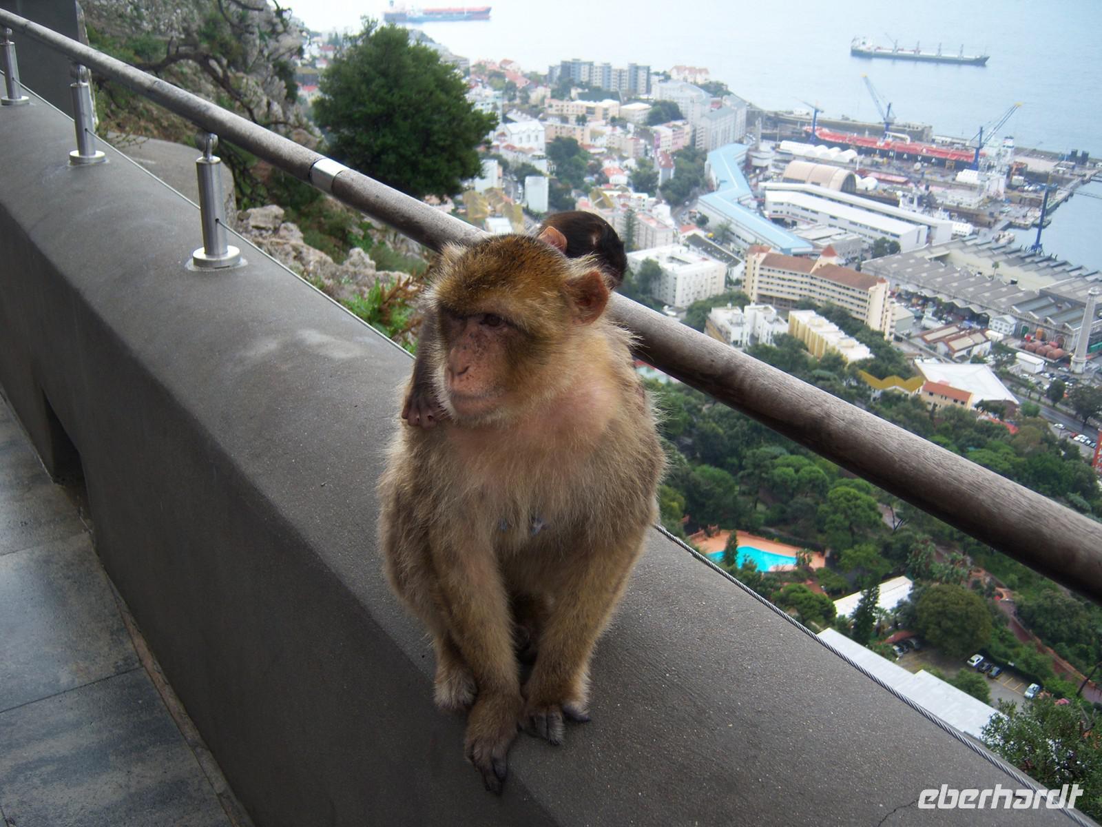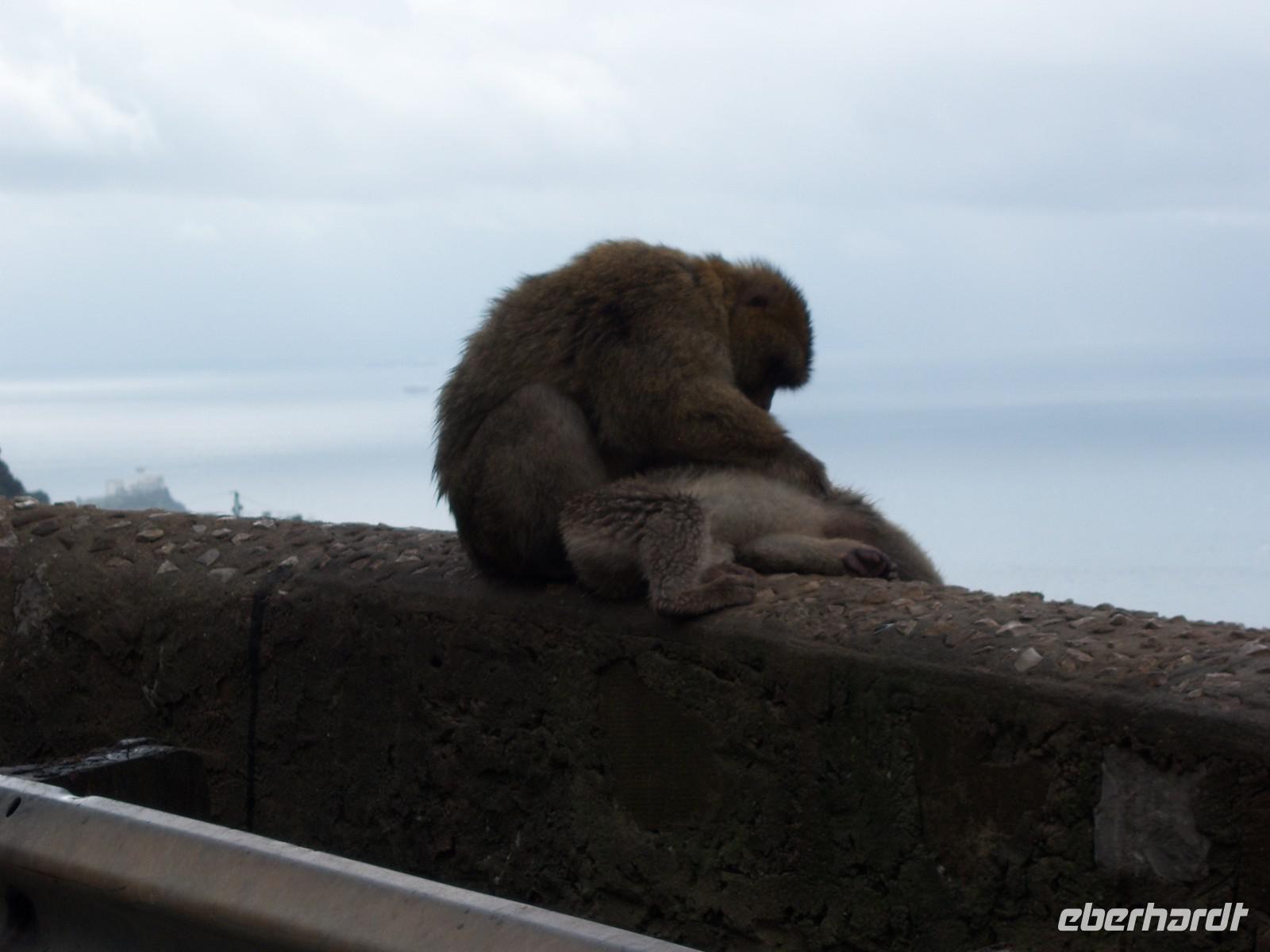 Heute ging es auf die Halbinsel Gibraltar. Nach den Ausweiskontrollen an der spanisch-britischen Grenze erreichten wir nach der Fahrt über das Flughafenrollfeld den Busparkplatz. Von dort aus starteten wir in 2 Kleinbussen Richtung Europa-Point und Affenfelsen. Wegen Überflutung waren die Straßen entlang der Küste gesperrt. Deshalb konnten wir bei der Fahrt durch den Stadtkern die schönen schmalen Straßen und Gässchen bewundern. Trotz Nebels war am Europa-Point Marokko sichtbar. Langsam kam die Sonne hervor und wir hatten vom 425m hohen Affenfelsen einen guten Blick auf die Stadt. Die Berberaffen begrüßten uns schon am Bus und kamen uns sehr nahe. Wie Kay prophezeite, sprangen die Affen einige von uns an. Der Rest der Gruppe fand dies natürlich sehr amüsant. Die Führung durch die Tunnel vom 2. Weltkrieg ließ uns demütig werden, auf welchem engsten Raum die Soldaten damals lebten und arbeiteten.