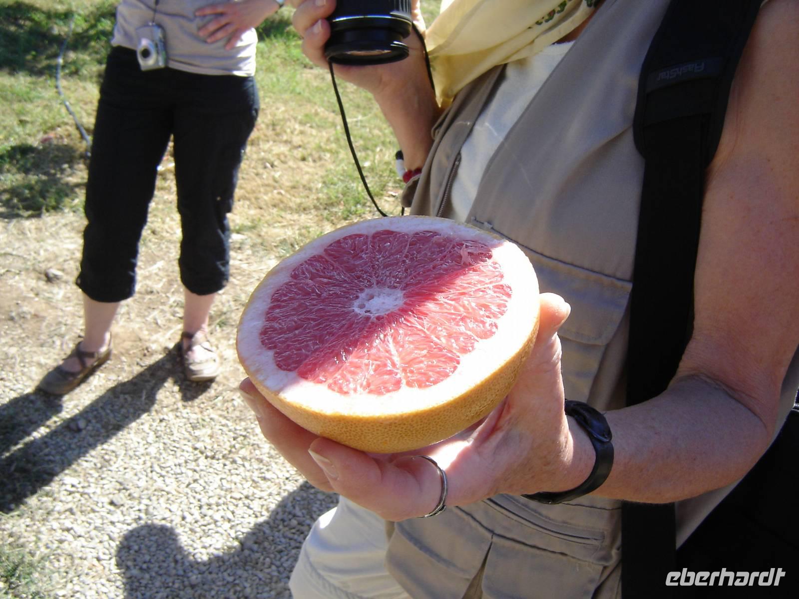 Mit dem Besuch der hübschen Zitrusplantage „Juanito Orange" setzten wir unser Programm fort. Dort trafen wir auf die witzigen Farmer Juan der uns durch ihre Plantage führte und uns mit viel Charme und Humor den Anbau der Zitrusfrüchte näher brachte. Beim Rundgang bekamen wir leckere Kostproben der safttigen Orangen, Zitronen, Pamelmusen, Feigen und Kumquats. Damit wir uns nicht zu lange in der heißen Sonne aufhalten, luden uns unsere Gastgeber zum„Kaffe, Orangensaft und kleinen Tapas" in ein kleines gemütliches Häuschen der Finka ein.