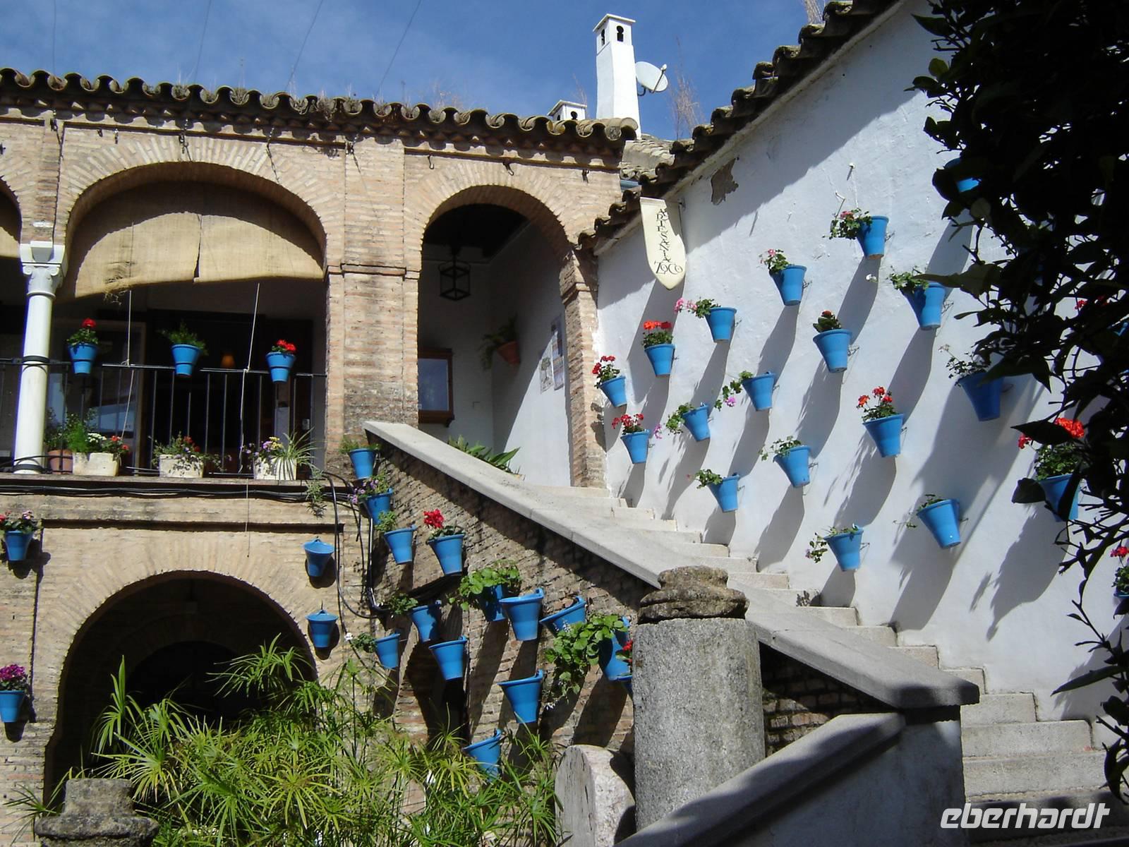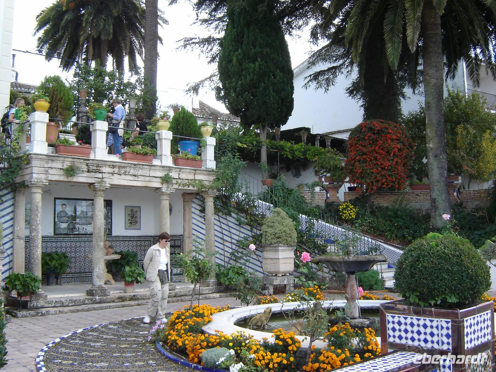 Wir überquerten die Puento Nuevo (Neue Brücke), von der wir einen atemberaubenden Blick auf die 160 Meter tiefe Schlucht El Tajo haben. Die aus dem 18. Jahrhundert stammende Brücke spannt sich in einer Höhe von knapp 100 Metern über den Tajo-Fluss und ähnelt ein römisches Aquädukt. Sie ist heute das Symbol der Stadt Ronda. Begeistert von der spektakulären Lage Rondas spazierten wir in die Altstadt „La Ciudad". Gleich als erstes statteten wir dem Haus „Casa de Don Bosco" einen Besuch ab, ein heerrliches Anwesen mit lieblichem Patio (Innenhof), gigantischem Panoramablick und wunderschöner Gartenanlage.