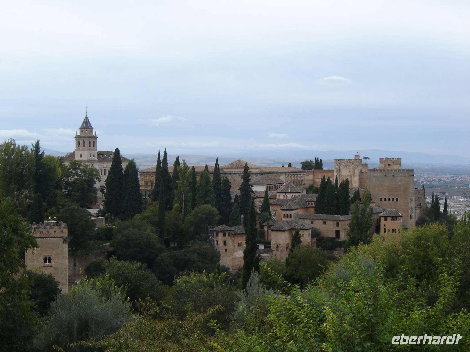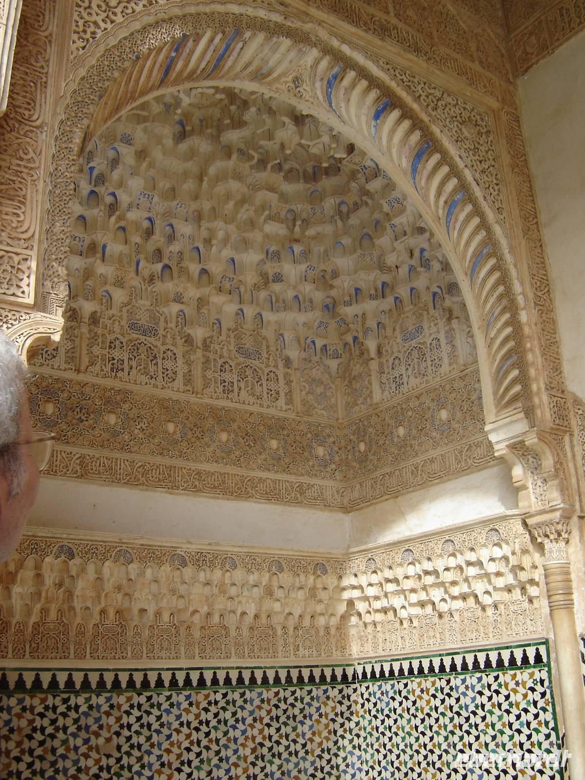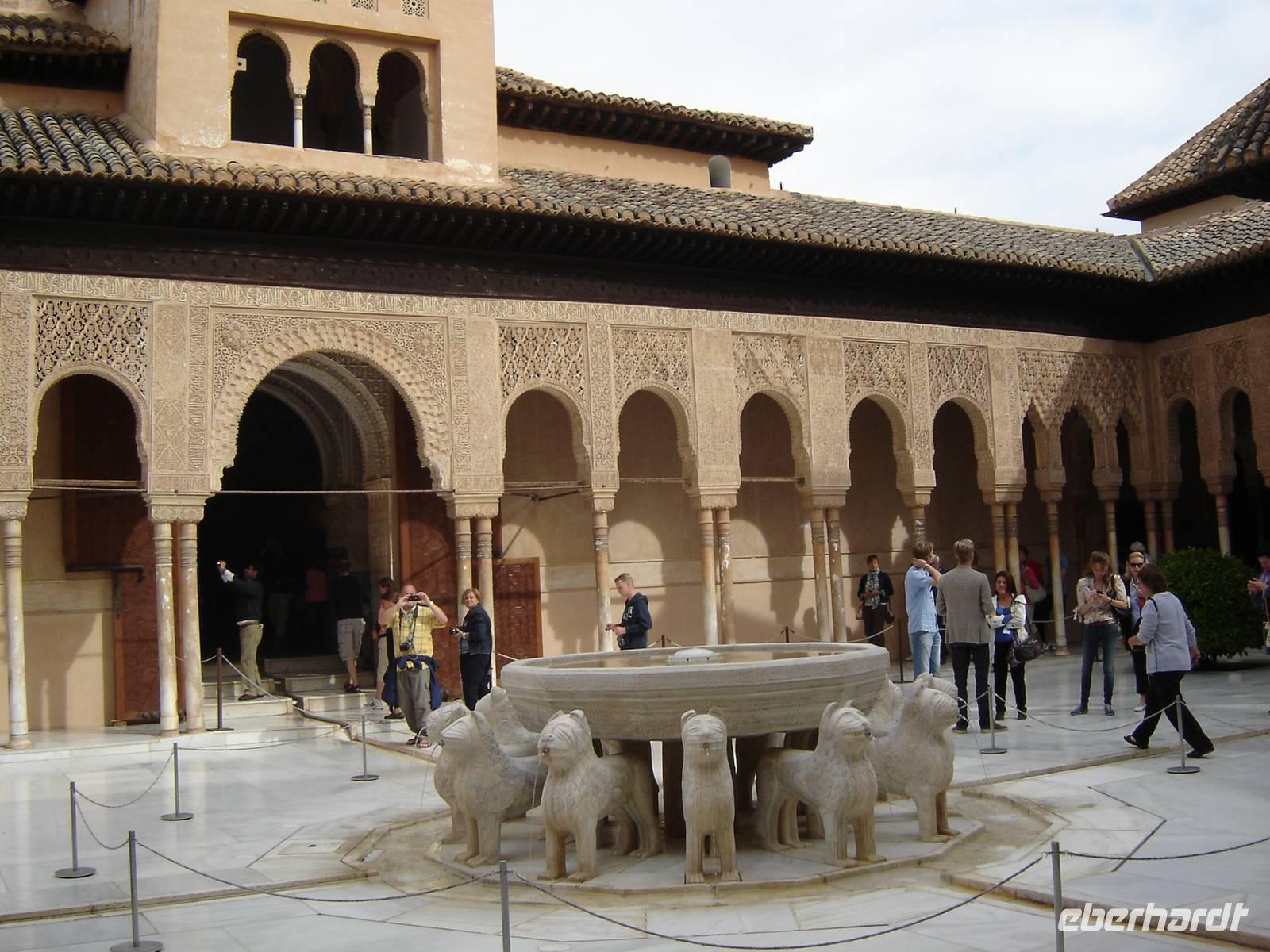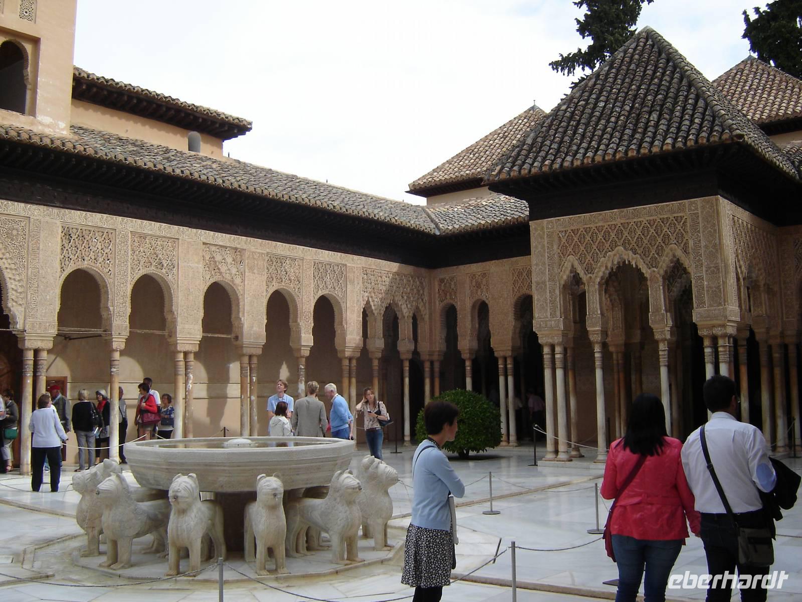 Nun besuchten wir die berühmte und von uns lang ersehnte Alhambra (zu Deutsch „Rote Burg"). Sie ist eine der meist besuchten Monumente Spaniens. Der Name rührt von der Farbe des Hügels, auf dem sie errichtet wurde, wodurch ihre Mauern im Licht der Abendsonne rot erstrahlen. Die Alhambra ist nicht nur der bedeutendste, sondern zugleich der älteste und besterhaltene arabische Palast seiner Ära. Unsere lokale Führerin ging mit uns durch die Generalife, die Gärten der Alhambra, mit ihren labyrintharigen Wegen, Teichen und herrlichen Pflanzen. Die Anlage war gigantisch groß. Noch beeindruckender waren die Paläste: der Palast der Nasriden (ein klassisches Beispiel für den islamischen Palastbau und Wohnsitz der Könige von Granada), der Myrtenhof (Patio de los Arrayanes) waren mit vielen kunstvoll eingefassten Pforten, Zwillingsfenstern und Nischen, der Löwenhof (Patio de Leones), der Saal der zwei Schwestern (Sala de las dos Hermanas) in der Form eines achtzackigen Sterns ist die größte aller arabischen Stalaktitenwölbungen und der Saal der Könige (Sala de los Reyes). Deren atemberaubende Architektur und Liebe zum Detail verschlug uns allen die Sprache - kein Fleck blieb unverziert. - Für uns war das wie ein Traum aus Tausendundeiner Nacht.
