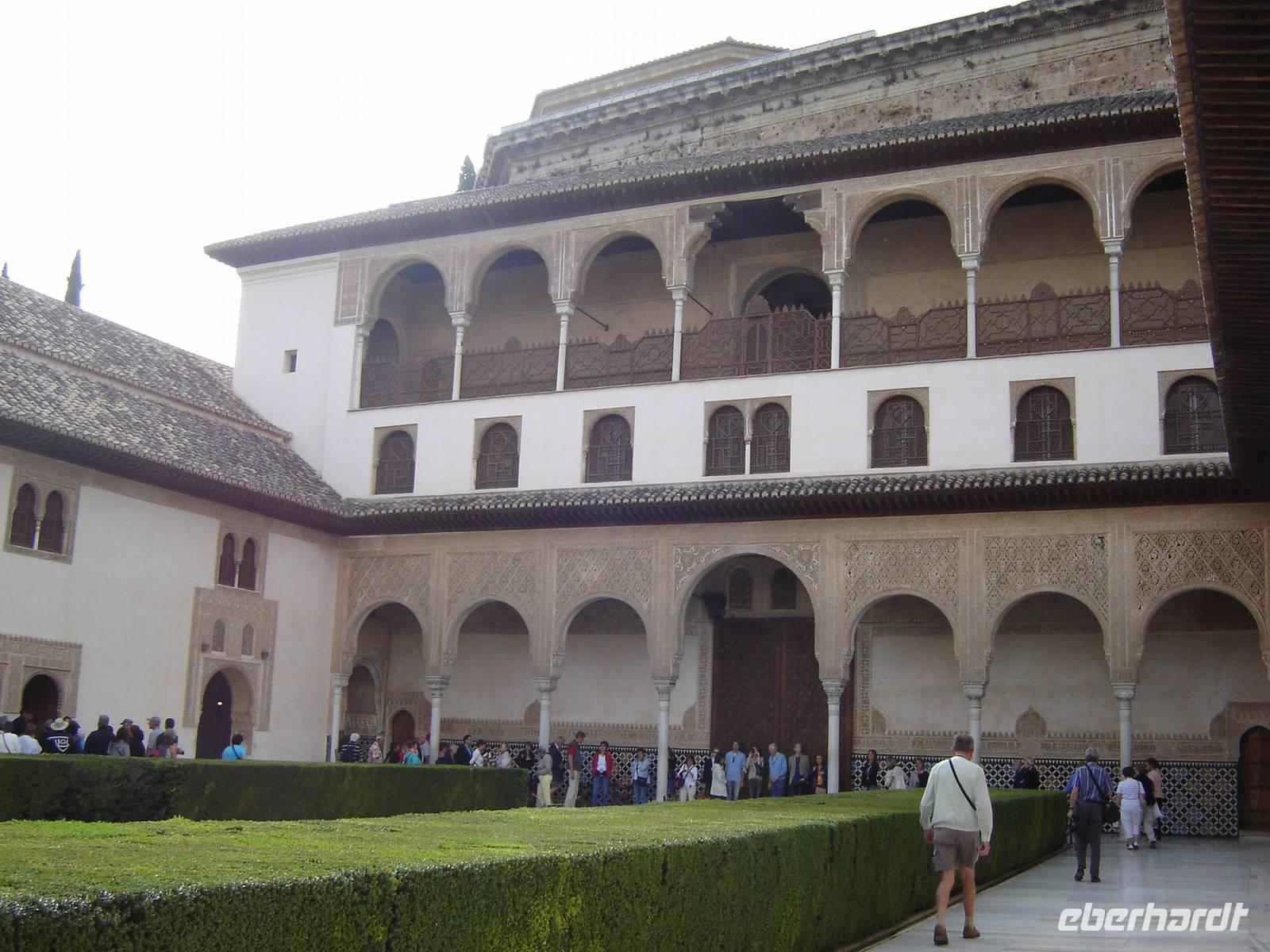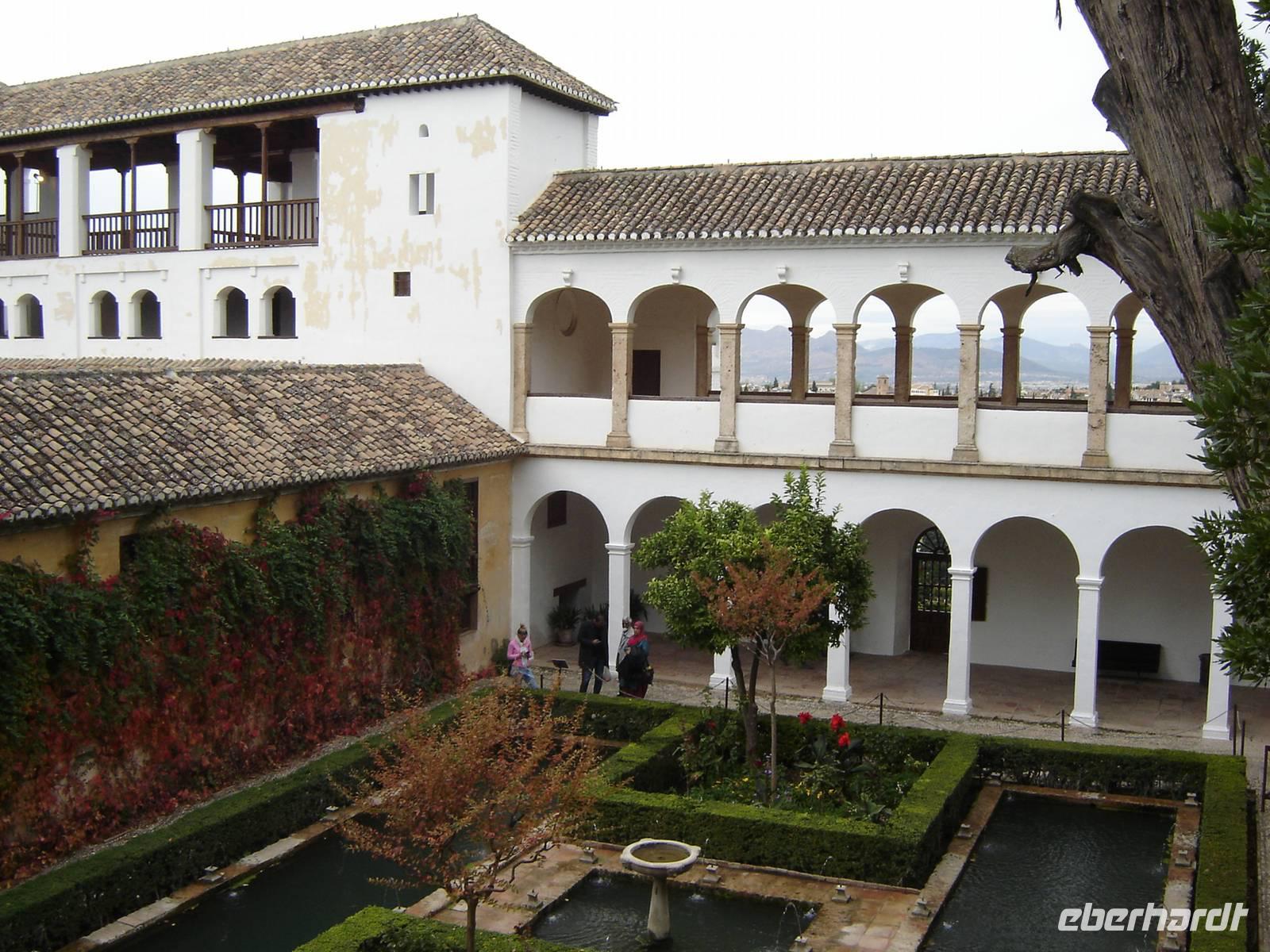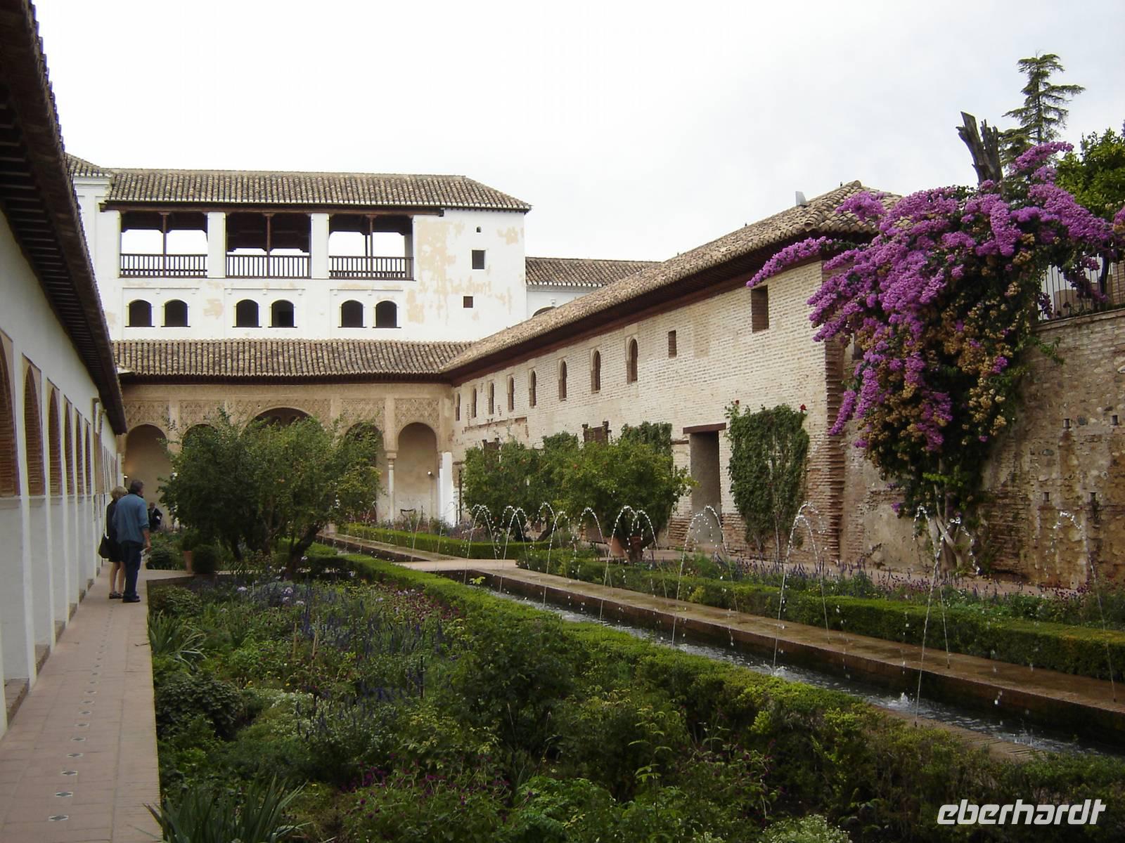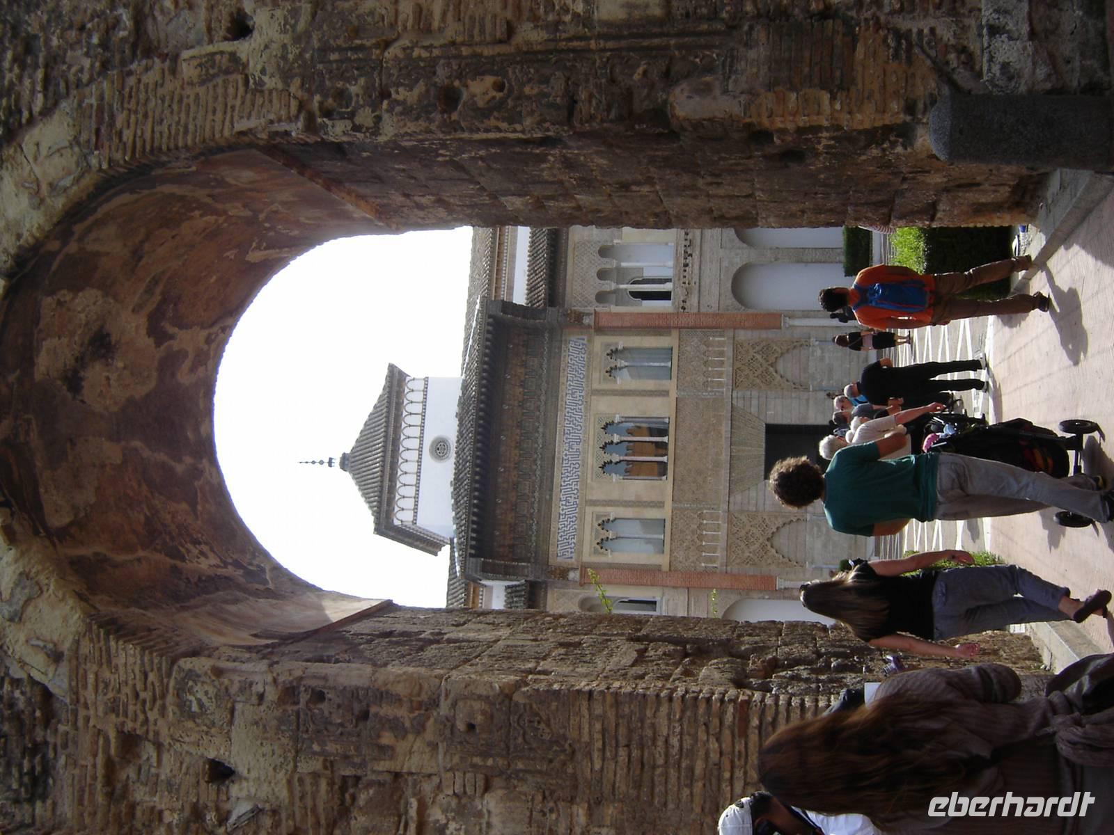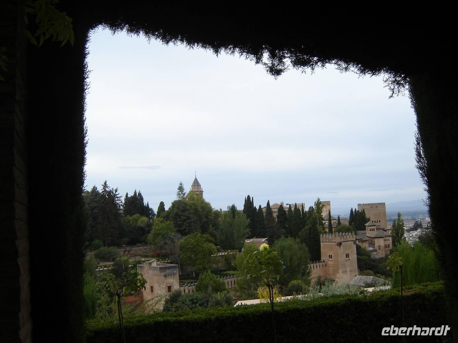 Nun besuchten wir die berühmte und von uns lang ersehnte Alhambra (zu Deutsch „Rote Burg"). Sie ist eine der meist besuchten Monumente Spaniens. Der Name rührt von der Farbe des Hügels, auf dem sie errichtet wurde, wodurch ihre Mauern im Licht der Abendsonne rot erstrahlen. Die Alhambra ist nicht nur der bedeutendste, sondern zugleich der älteste und besterhaltene arabische Palast seiner Ära. Unsere lokale Führerin ging mit uns durch die Generalife, die Gärten der Alhambra, mit ihren labyrintharigen Wegen, Teichen und herrlichen Pflanzen. Die Anlage war gigantisch groß. Noch beeindruckender waren die Paläste: der Palast der Nasriden (ein klassisches Beispiel für den islamischen Palastbau und Wohnsitz der Könige von Granada), der Myrtenhof (Patio de los Arrayanes) waren mit vielen kunstvoll eingefassten Pforten, Zwillingsfenstern und Nischen, der Löwenhof (Patio de Leones), der Saal der zwei Schwestern (Sala de las dos Hermanas) in der Form eines achtzackigen Sterns ist die größte aller arabischen Stalaktitenwölbungen und der Saal der Könige (Sala de los Reyes). Deren atemberaubende Architektur und Liebe zum Detail verschlug uns allen die Sprache - kein Fleck blieb unverziert. - Für uns war das wie ein Traum aus Tausendundeiner Nacht.