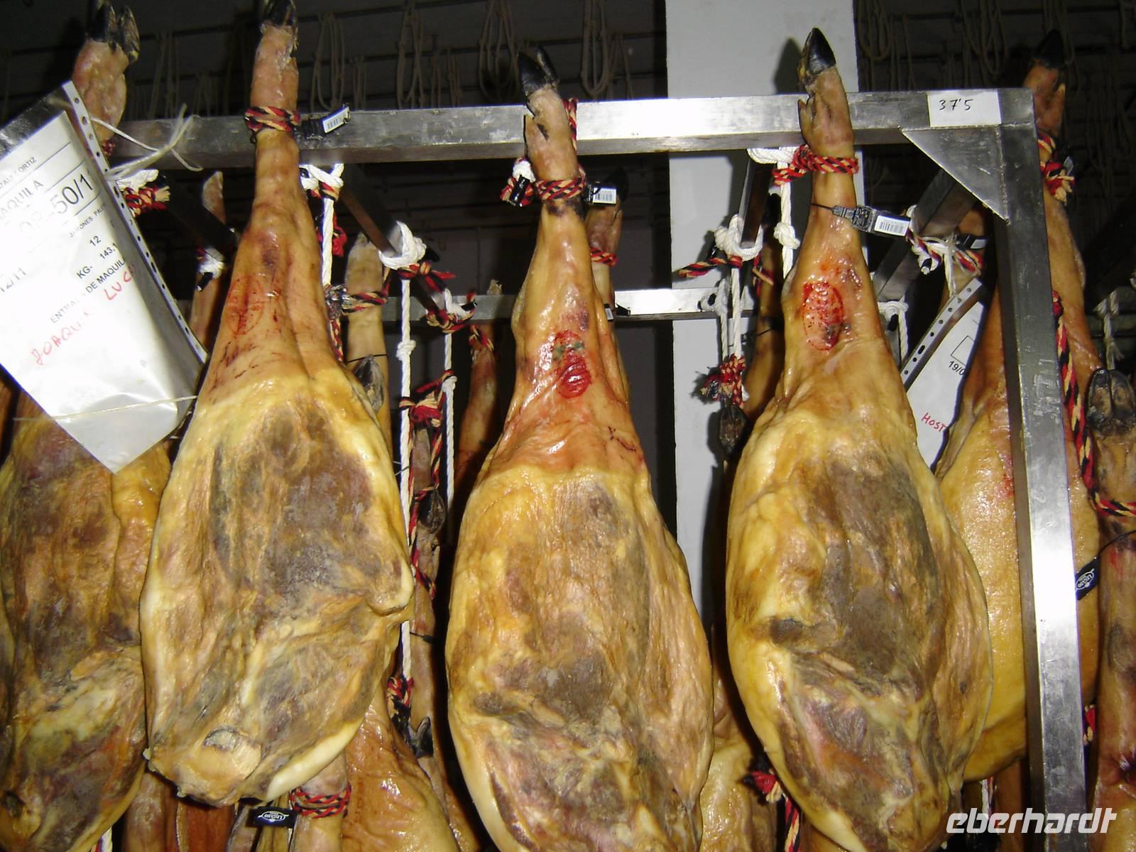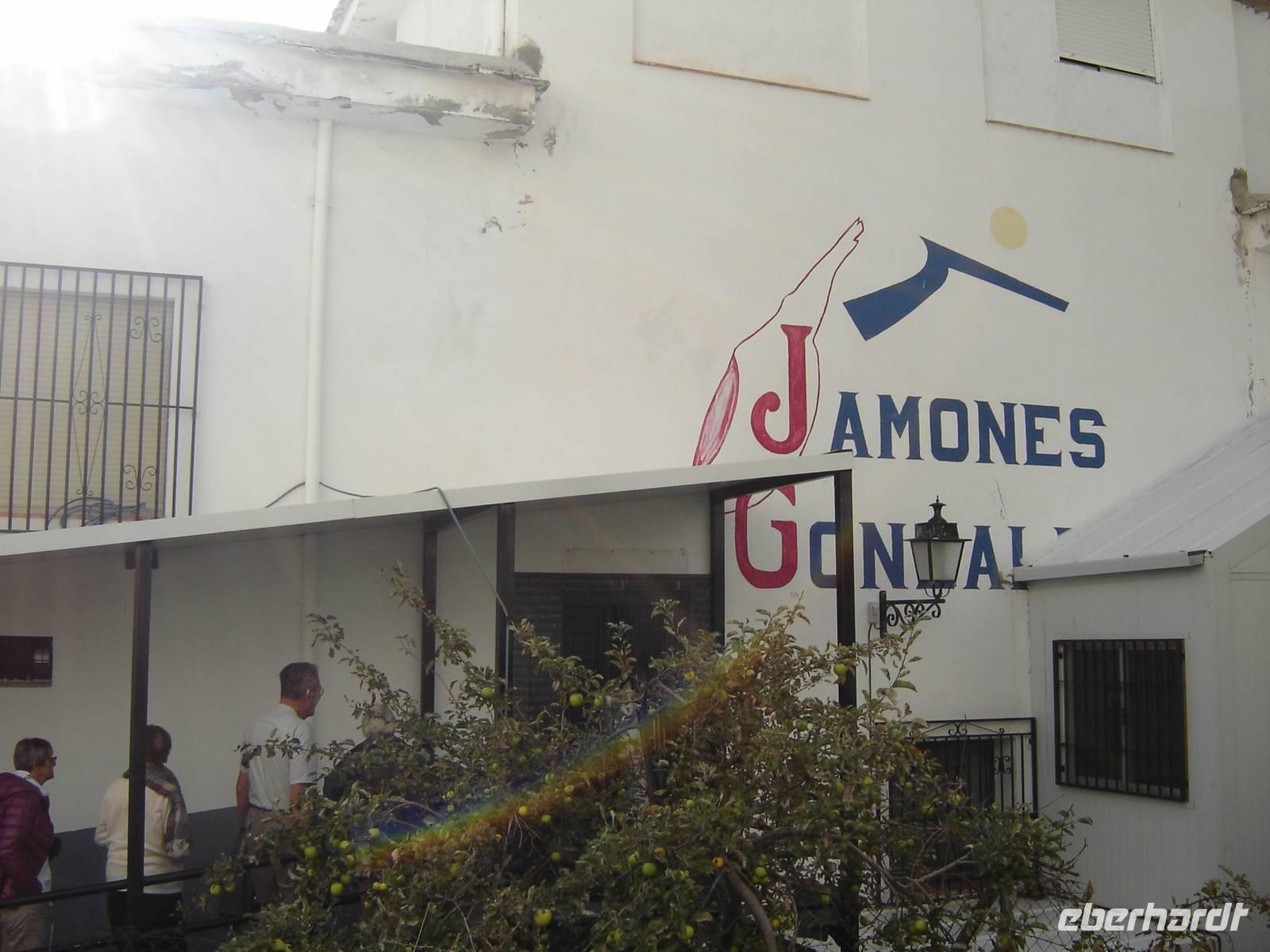 Bei blauem Himmel machten wir uns mit Kay auf, die Berge der Alpujarra-Region zu erklimmen. Entlang enger Bergstraßen genossen wir alle den atemberaubenden Anblick der wunderbaren grünen Bergwelt. Das Gebiet südlich von Granda und der Sierra Nevada steht unter Naturschutz und diente damals als Zufluchtsort der Banditen. Seit den 60er Jahren lebten hier viele Hippies, die bis heute ihren Unterhalt mit der Herstellung handgewebter Teppiche und handgemachter Schmuck. Doch nicht nur Textilien sind bekannte Produkte, sondern auch der beste Serrano-Schinken soll aus dieser Gegend kommen. So besuchten wir die Schinkentrocknerei „Gonzalez Ortiz" in Trevélez, dem höchsten Dorf der gesamten iberischen Halbinsel (Höhe zwischen 1.500 und 1.750 Metern). Der typisch salzige Geruch und die Säulenvorbauten, hinter denen sich getrocknete Schinken verbergen, zeichnen das Dörfchen aus. Was genau die Besonderheit des „Jamón serrano" ausmacht, erfuhren wir aus erster Hand von Dani, einem Angestellten der Trocknerei, der sich bestens mit der Schinkenherstellung auskennt. Erstaunt waren wir, dass die Prozedur von der Lieferung der frischen Schweinekeulen bis zum perfekt getrockneten Schinken bis zu zwei Jahren dauerte. Nach dem Film über die Herstellung, durften wir den beliebten Schinken mit einem Stückchen Brot, Chorizo-Wurst und einem Glächen Sherry kosten. - Ein wahrlicher Gaumenschmaus!