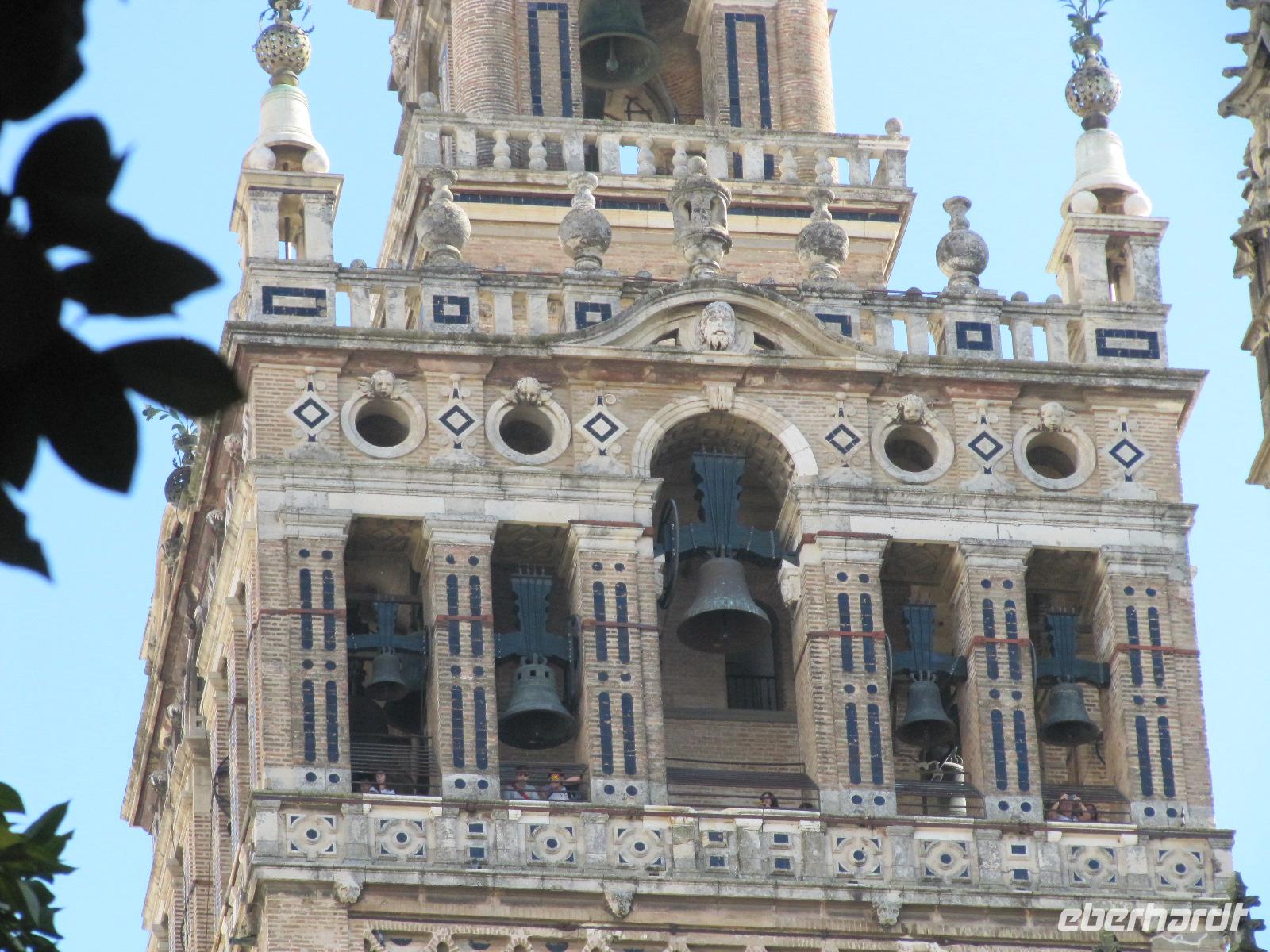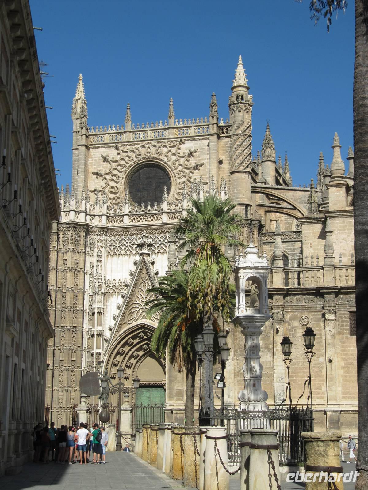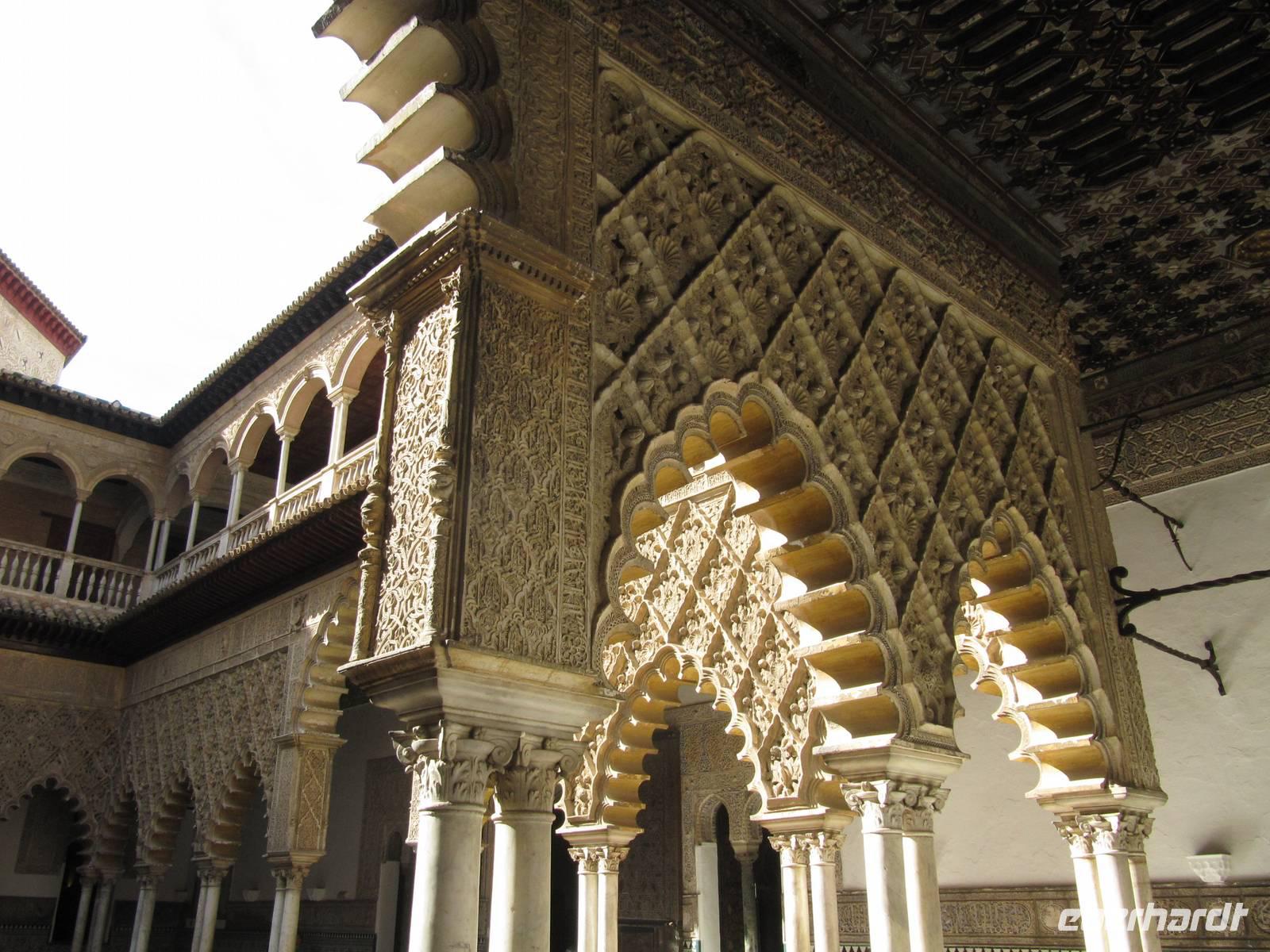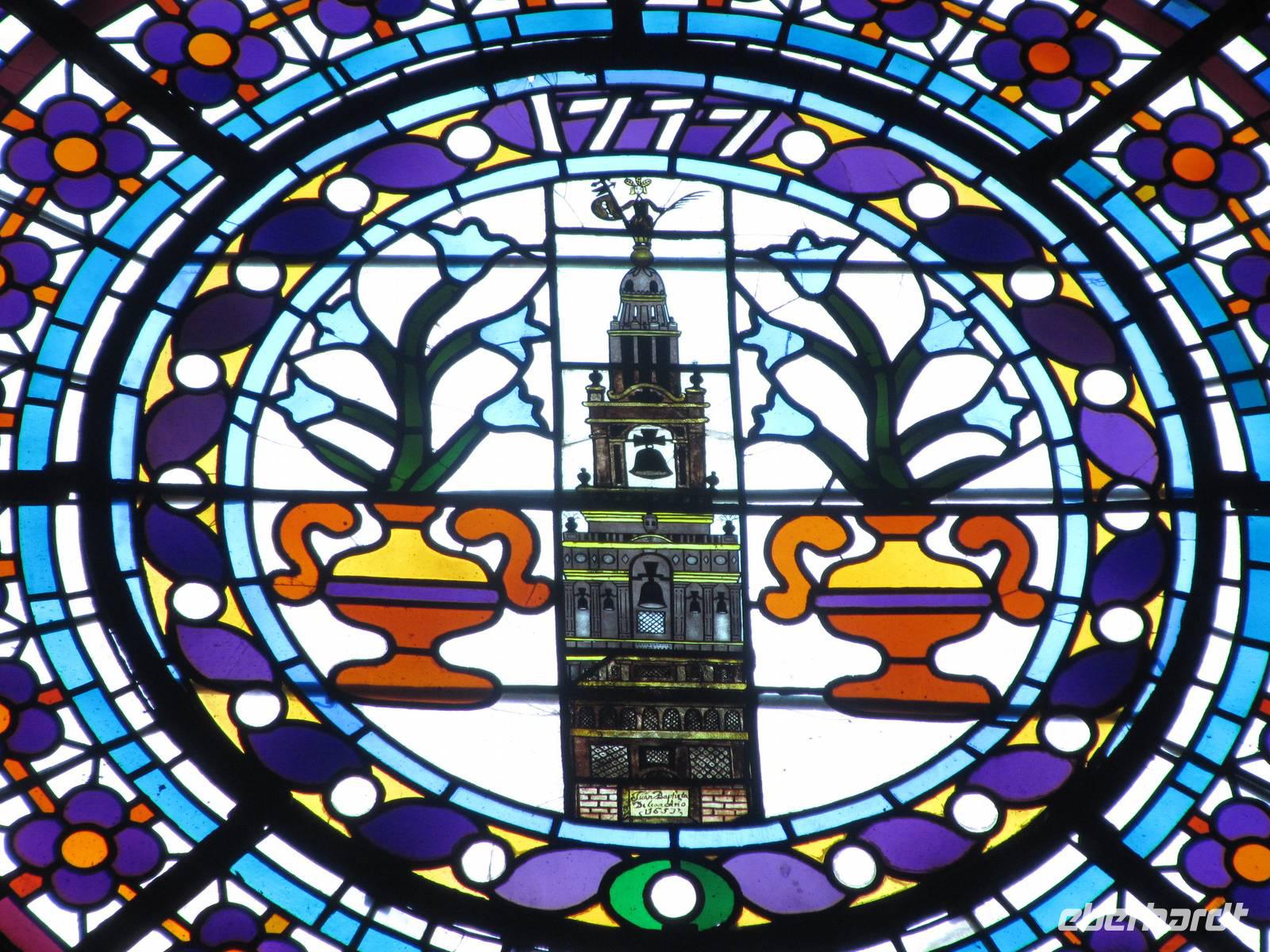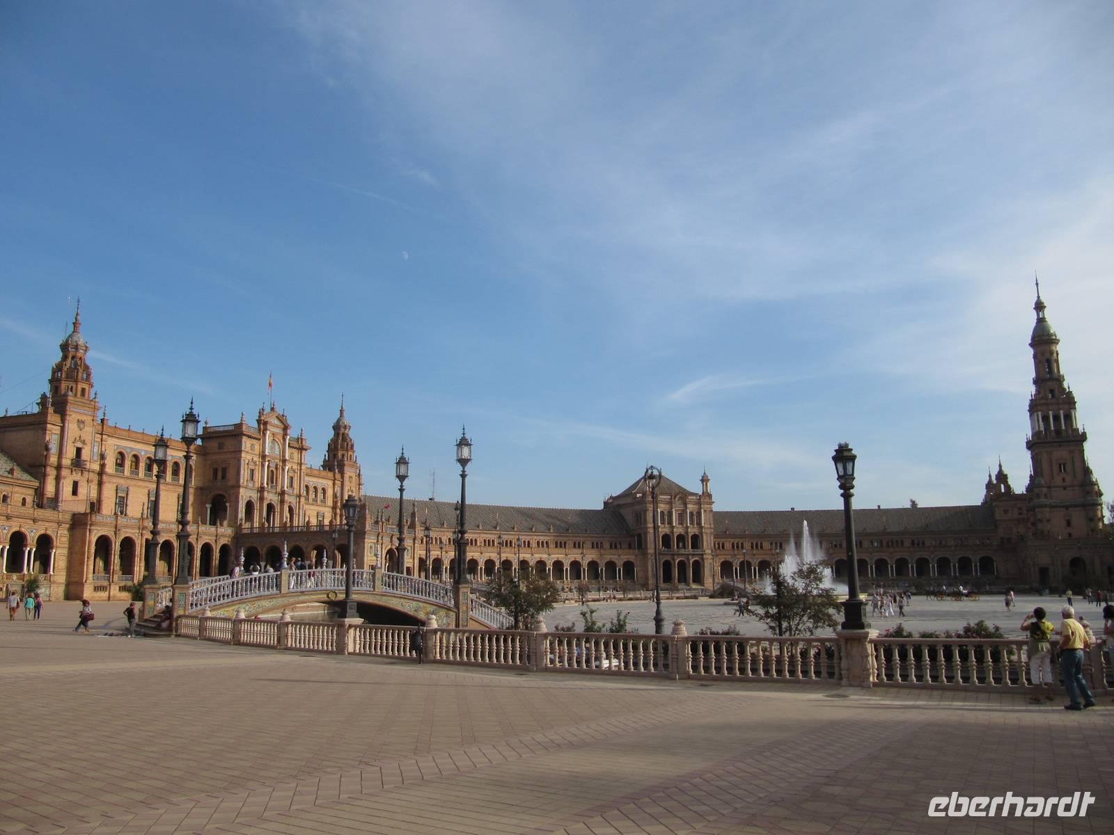 Der sechste Tag unserer Reise führte uns durch unendliche Olivenplantagen bis nach Sevilla, der größten Stadt Andalusiens und Hauptstadt der autonomen Region Andalusien. Während der Zeit bis zu unserem Treffen mit dem örtlichen Reiseleiter zur Besichtigung der der größten gotischen Kirche der Welt genossen wir einen Spaziergang durch die breiten, auf beiden Seiten von Orangenbäumen gesäumten Alleen und Straßen. Das 95 m hohe Giralda, Wahrzeichen Sevillas war einst das Minarett der Moschee, ist aber heute der Glockenturm der Kathedrale. Kunstvoll und beeindruckend fanden wir auch das Grabmal des Kolombus (in Valladolid gestorben), den größten Hochaltar der Welt und den Orangenhof „Patio de los Naranjos". Danach begaben wir uns zur Palastburg der Almohaden „El Alcázar". Maurische Kuppeln, Stilelemente der islamischen Architektur wie die Al Muqarnas und die Schönheit von großartigen Gärten des Álcazar faszinierten uns sehr. Danach probierten wir sehr leckere Tapas in der Nähe des alten Judenviertels, bekannt als „Barrio de Santa Cruz". Der sehr spannende Bummel durch die engen Gässchen führte uns vorbei an mit Ornamenten verzierten Gebäuden in Richtung des markanten „Plaza de España". Der mit neomaurischen Elementen geschmückte Platz zeigte eine Azulejo-Darstellungen aller 50 spanischen Provinzen.