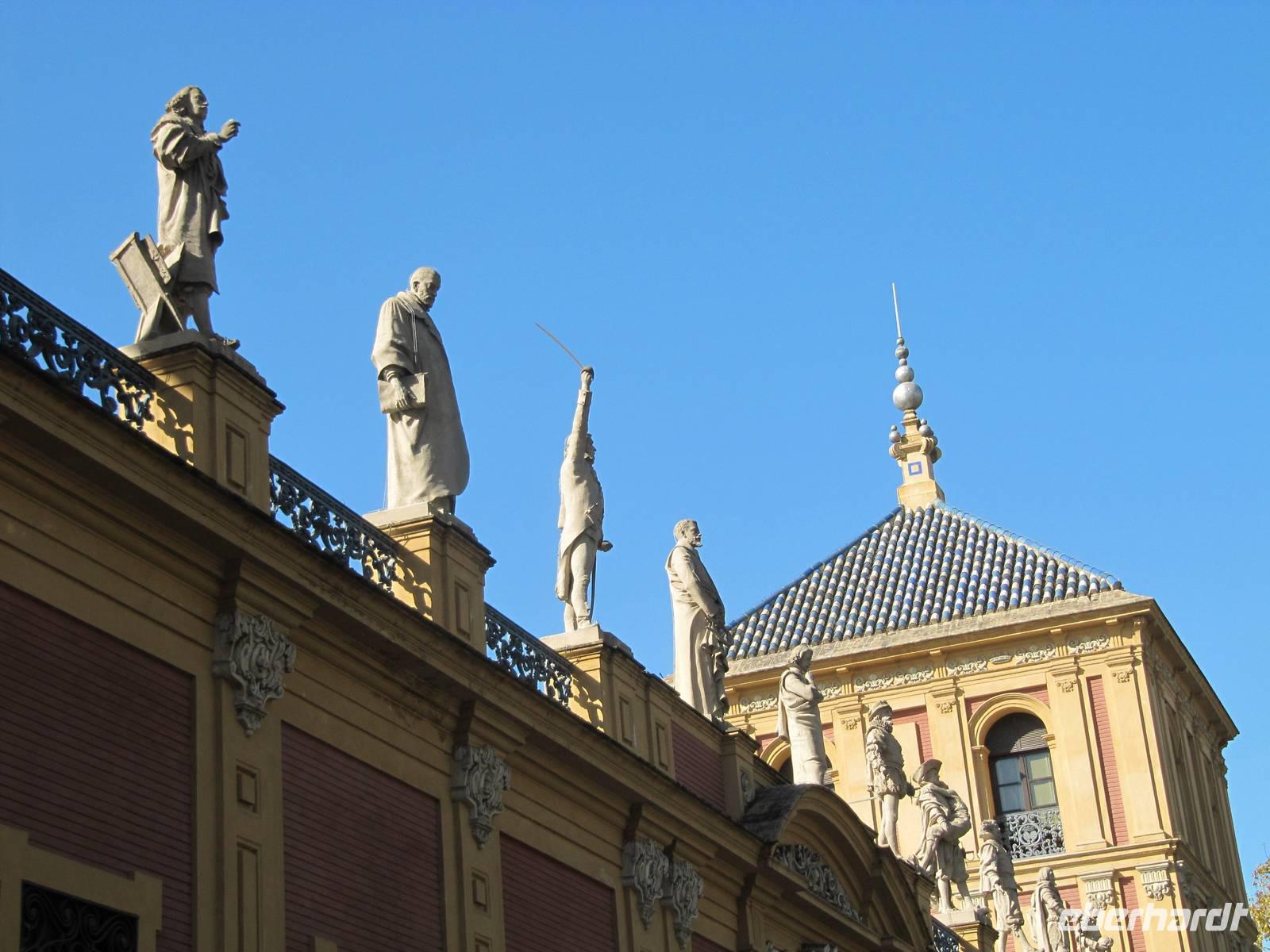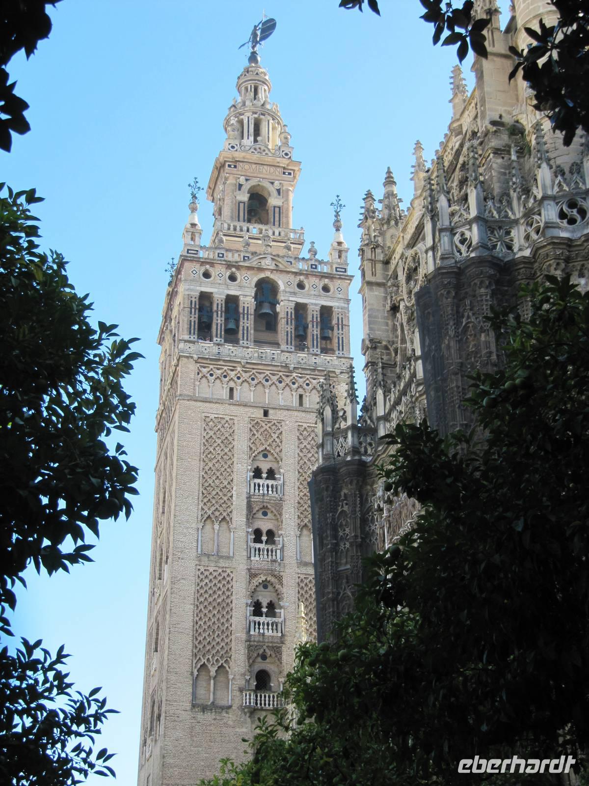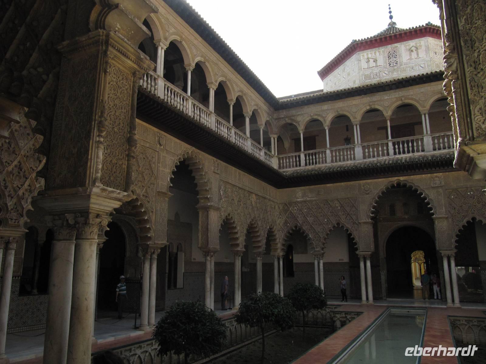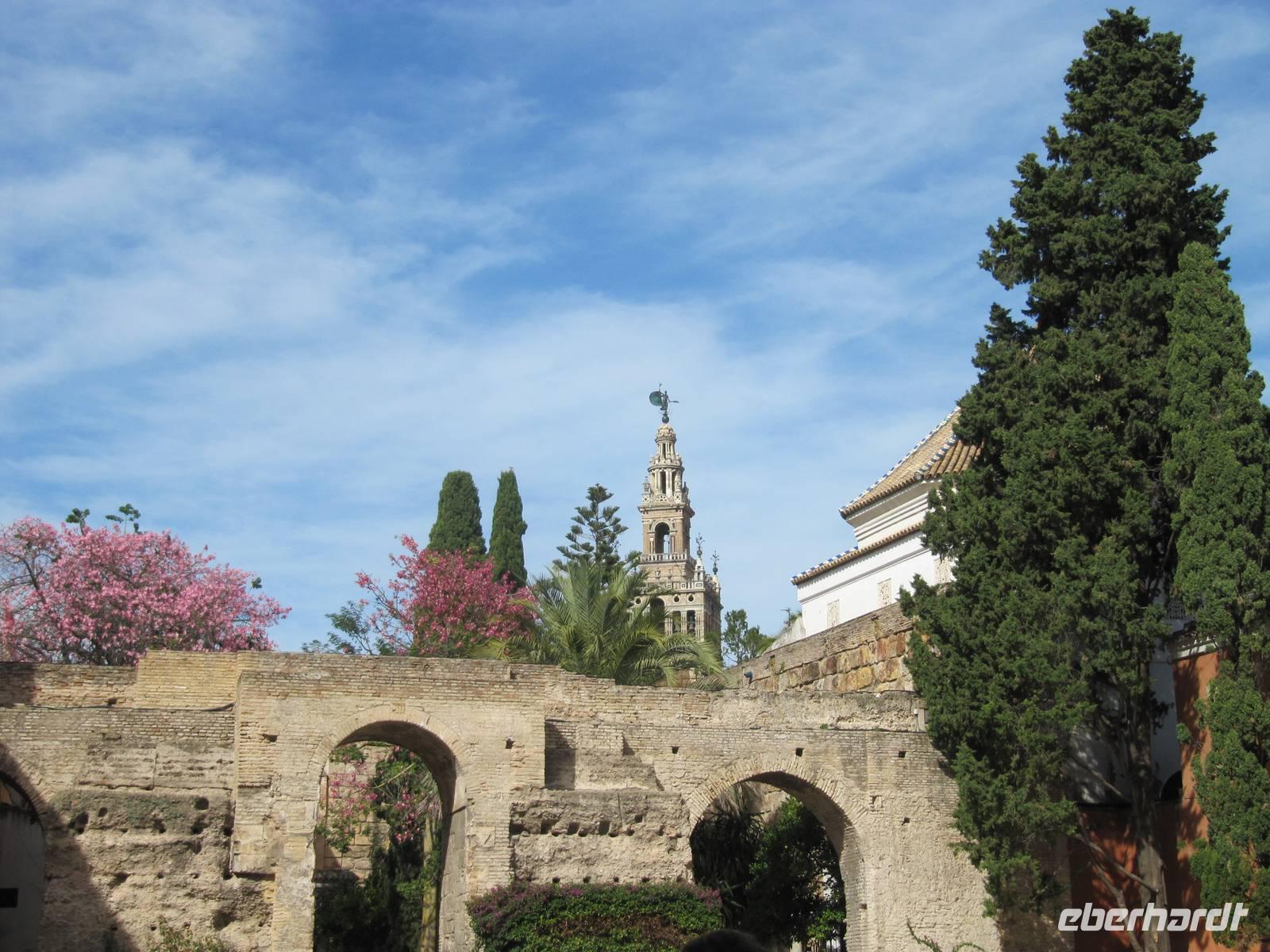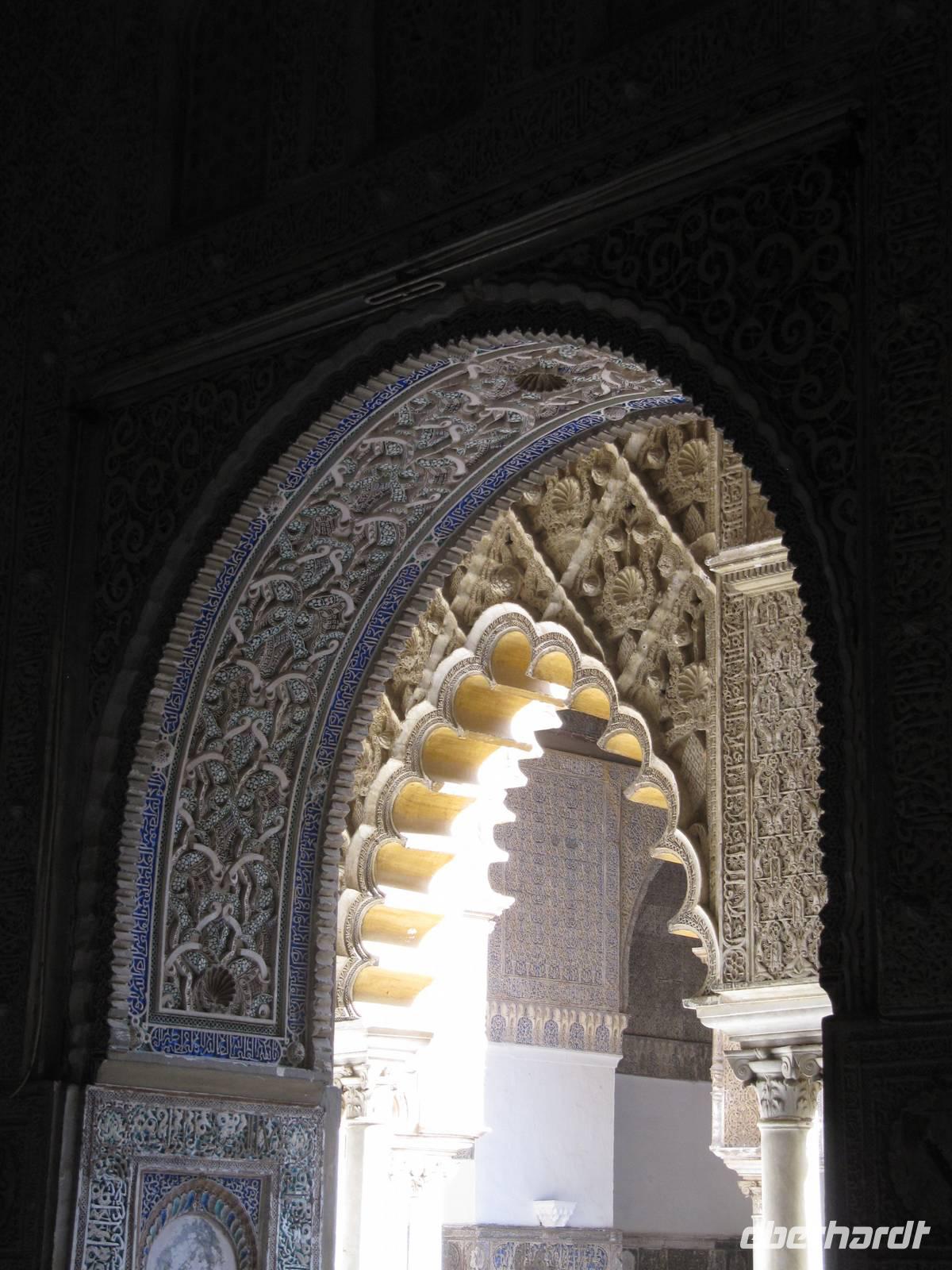 Der sechste Tag unserer Reise führte uns durch unendliche Olivenplantagen bis nach Sevilla, der größten Stadt Andalusiens und Hauptstadt der autonomen Region Andalusien. Während der Zeit bis zu unserem Treffen mit dem örtlichen Reiseleiter zur Besichtigung der der größten gotischen Kirche der Welt genossen wir einen Spaziergang durch die breiten, auf beiden Seiten von Orangenbäumen gesäumten Alleen und Straßen. Das 95 m hohe Giralda, Wahrzeichen Sevillas war einst das Minarett der Moschee, ist aber heute der Glockenturm der Kathedrale. Kunstvoll und beeindruckend fanden wir auch das Grabmal des Kolombus (in Valladolid gestorben), den größten Hochaltar der Welt und den Orangenhof „Patio de los Naranjos". Danach begaben wir uns zur Palastburg der Almohaden „El Alcázar". Maurische Kuppeln, Stilelemente der islamischen Architektur wie die Al Muqarnas und die Schönheit von großartigen Gärten des Álcazar faszinierten uns sehr. Danach probierten wir sehr leckere Tapas in der Nähe des alten Judenviertels, bekannt als „Barrio de Santa Cruz". Der sehr spannende Bummel durch die engen Gässchen führte uns vorbei an mit Ornamenten verzierten Gebäuden in Richtung des markanten „Plaza de España". Der mit neomaurischen Elementen geschmückte Platz zeigte eine Azulejo-Darstellungen aller 50 spanischen Provinzen.