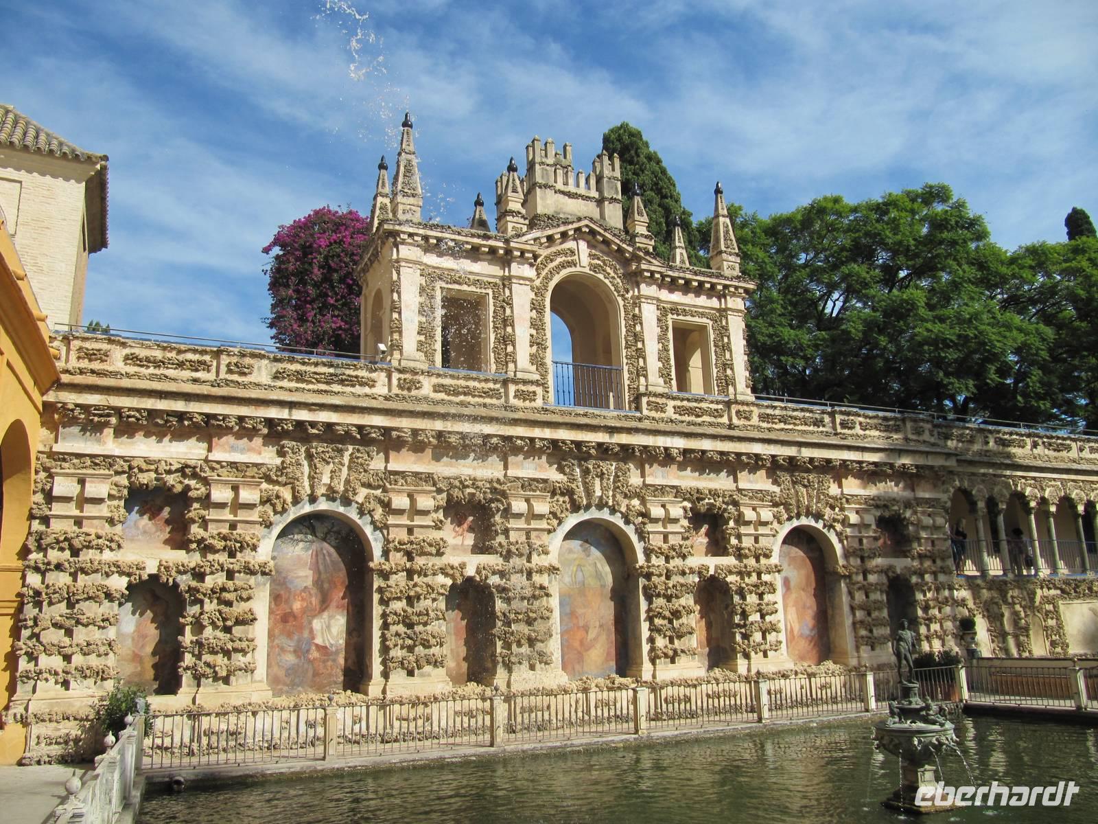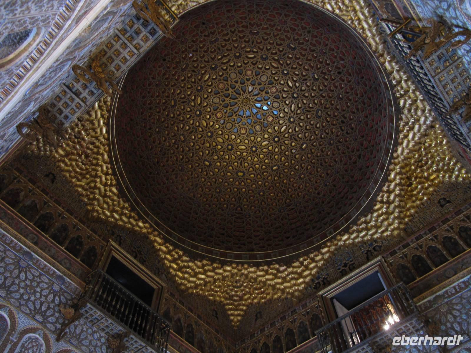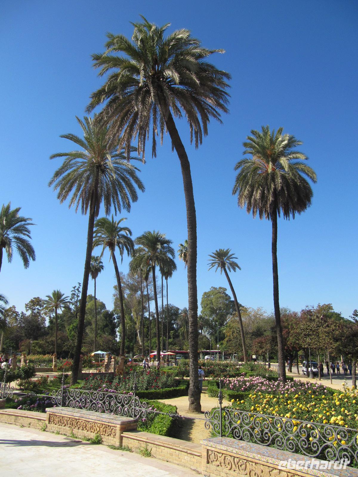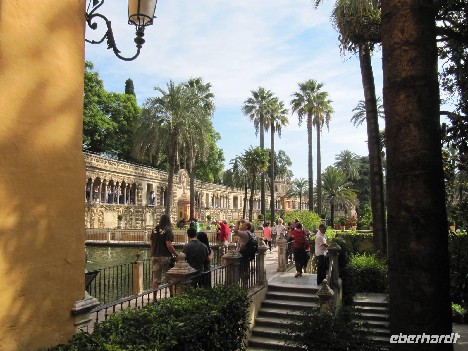 Der sechste Tag unserer Reise führte uns durch unendliche Olivenplantagen bis nach Sevilla, der größten Stadt Andalusiens und Hauptstadt der autonomen Region Andalusien. Während der Zeit bis zu unserem Treffen mit dem örtlichen Reiseleiter zur Besichtigung der der größten gotischen Kirche der Welt genossen wir einen Spaziergang durch die breiten, auf beiden Seiten von Orangenbäumen gesäumten Alleen und Straßen. Das 95 m hohe Giralda, Wahrzeichen Sevillas war einst das Minarett der Moschee, ist aber heute der Glockenturm der Kathedrale. Kunstvoll und beeindruckend fanden wir auch das Grabmal des Kolombus (in Valladolid gestorben), den größten Hochaltar der Welt und den Orangenhof „Patio de los Naranjos". Danach begaben wir uns zur Palastburg der Almohaden „El Alcázar". Maurische Kuppeln, Stilelemente der islamischen Architektur wie die Al Muqarnas und die Schönheit von großartigen Gärten des Álcazar faszinierten uns sehr. Danach probierten wir sehr leckere Tapas in der Nähe des alten Judenviertels, bekannt als „Barrio de Santa Cruz". Der sehr spannende Bummel durch die engen Gässchen führte uns vorbei an mit Ornamenten verzierten Gebäuden in Richtung des markanten „Plaza de España". Der mit neomaurischen Elementen geschmückte Platz zeigte eine Azulejo-Darstellungen aller 50 spanischen Provinzen.