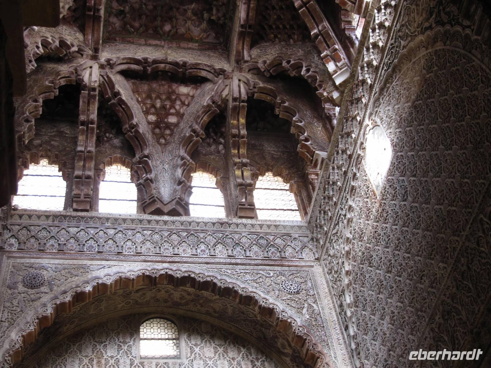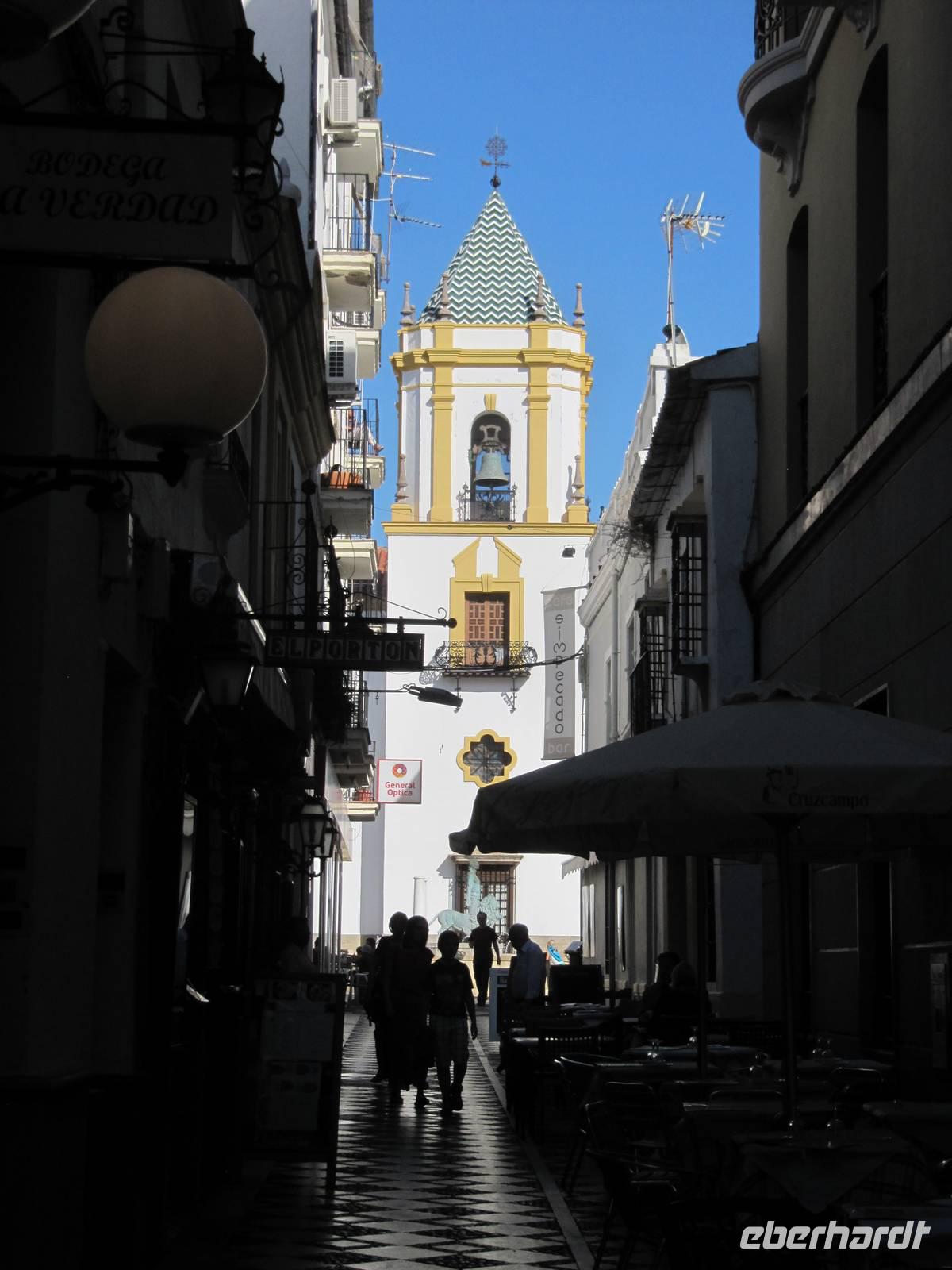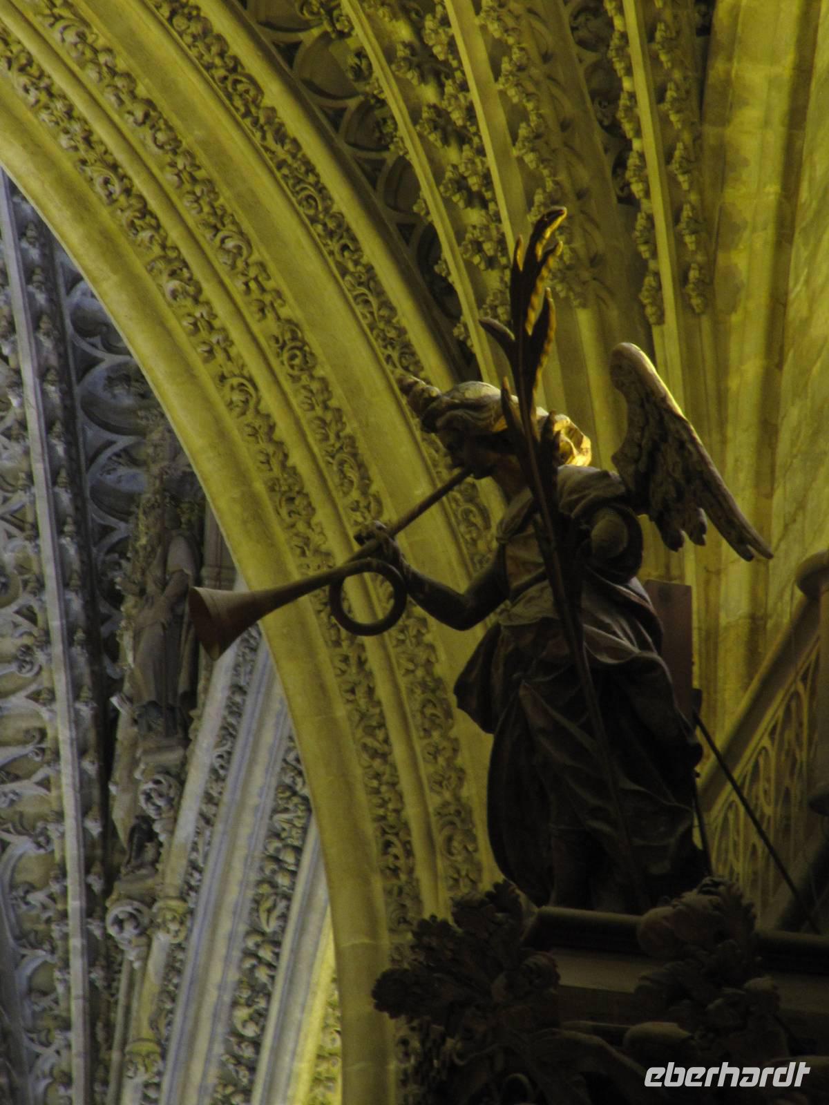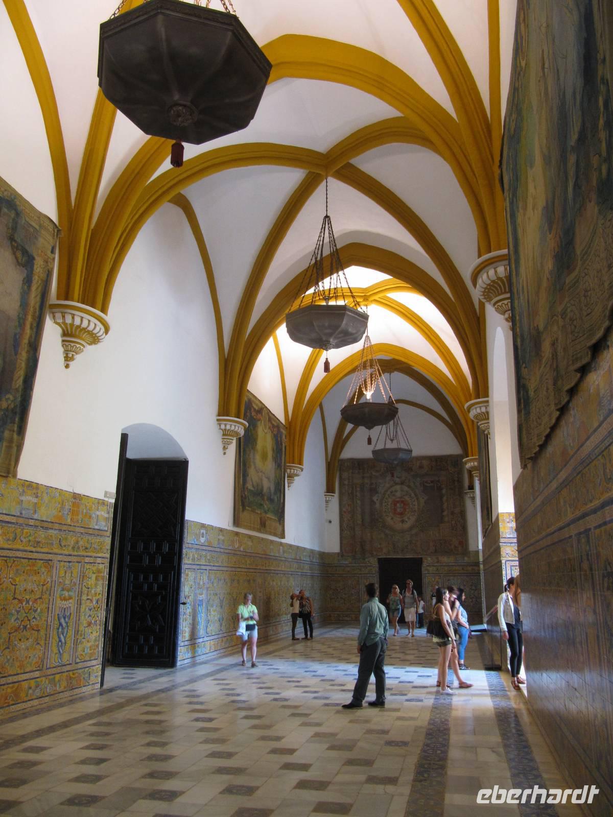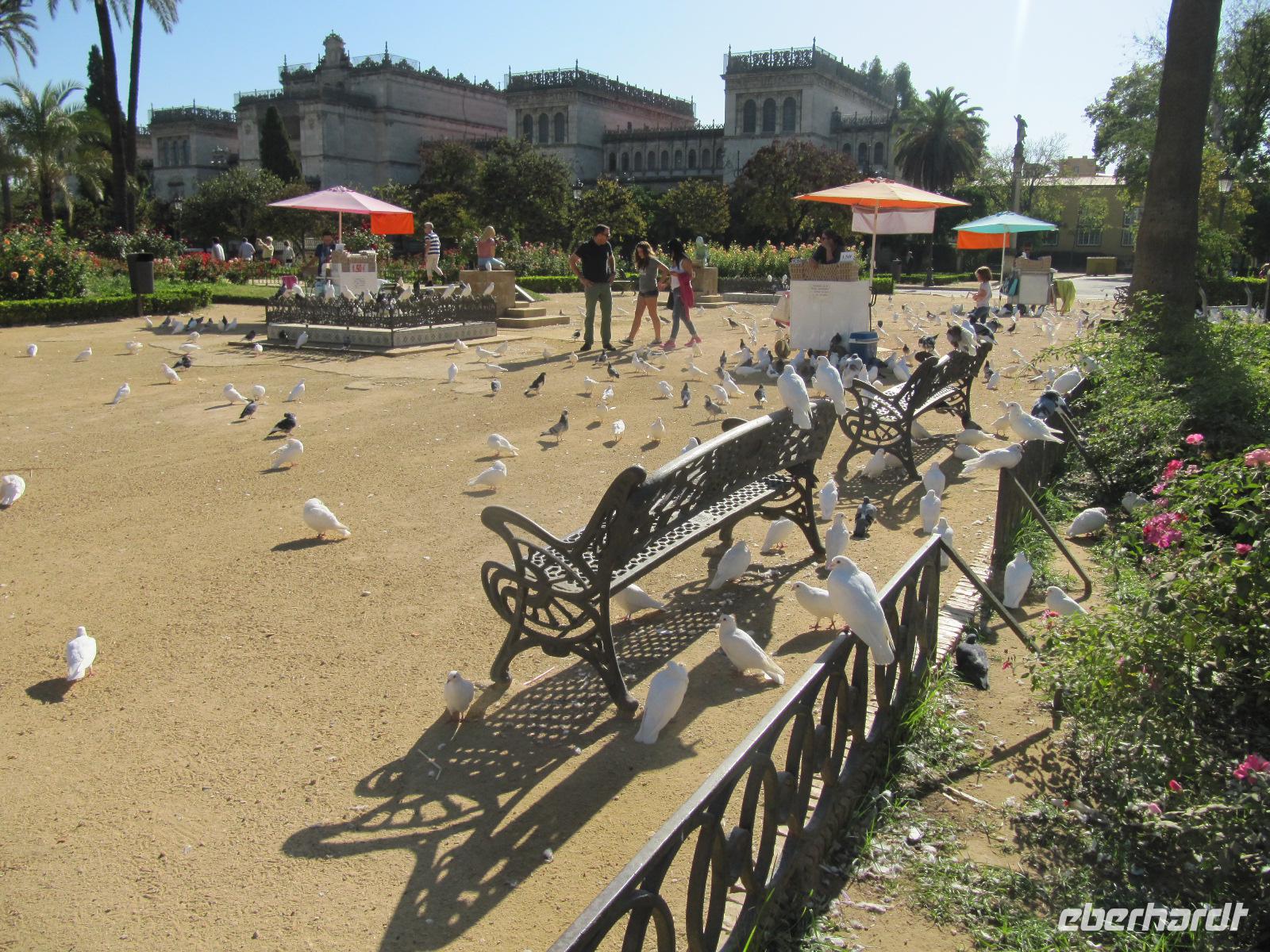 Der sechste Tag unserer Reise führte uns durch unendliche Olivenplantagen bis nach Sevilla, der größten Stadt Andalusiens und Hauptstadt der autonomen Region Andalusien. Während der Zeit bis zu unserem Treffen mit dem örtlichen Reiseleiter zur Besichtigung der der größten gotischen Kirche der Welt genossen wir einen Spaziergang durch die breiten, auf beiden Seiten von Orangenbäumen gesäumten Alleen und Straßen. Das 95 m hohe Giralda, Wahrzeichen Sevillas war einst das Minarett der Moschee, ist aber heute der Glockenturm der Kathedrale. Kunstvoll und beeindruckend fanden wir auch das Grabmal des Kolombus (in Valladolid gestorben), den größten Hochaltar der Welt und den Orangenhof „Patio de los Naranjos". Danach begaben wir uns zur Palastburg der Almohaden „El Alcázar". Maurische Kuppeln, Stilelemente der islamischen Architektur wie die Al Muqarnas und die Schönheit von großartigen Gärten des Álcazar faszinierten uns sehr. Danach probierten wir sehr leckere Tapas in der Nähe des alten Judenviertels, bekannt als „Barrio de Santa Cruz". Der sehr spannende Bummel durch die engen Gässchen führte uns vorbei an mit Ornamenten verzierten Gebäuden in Richtung des markanten „Plaza de España". Der mit neomaurischen Elementen geschmückte Platz zeigte eine Azulejo-Darstellungen aller 50 spanischen Provinzen.