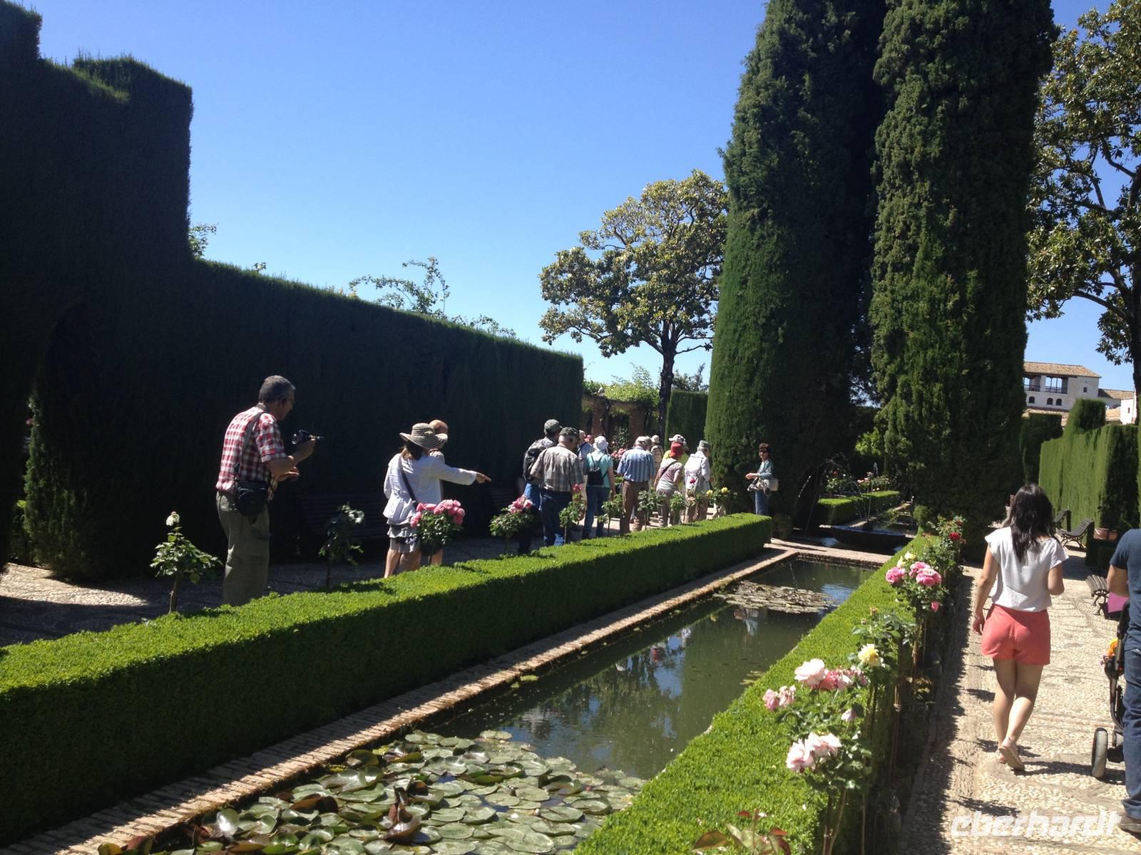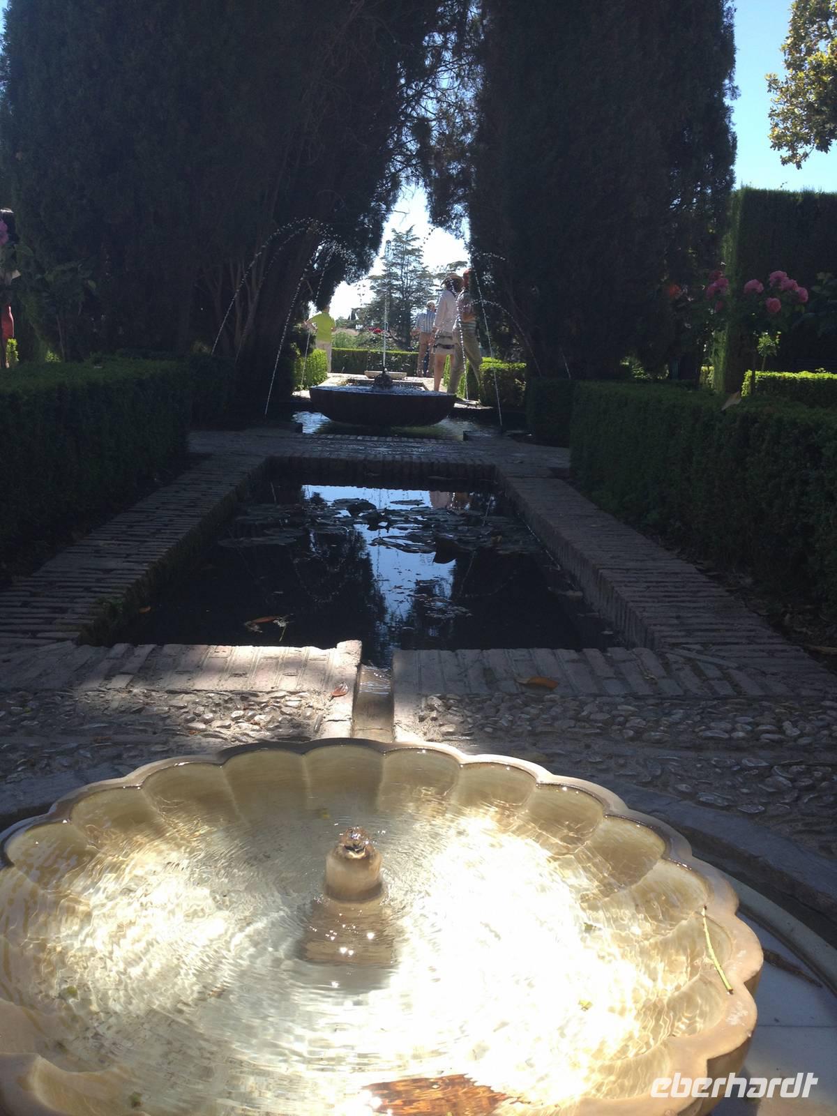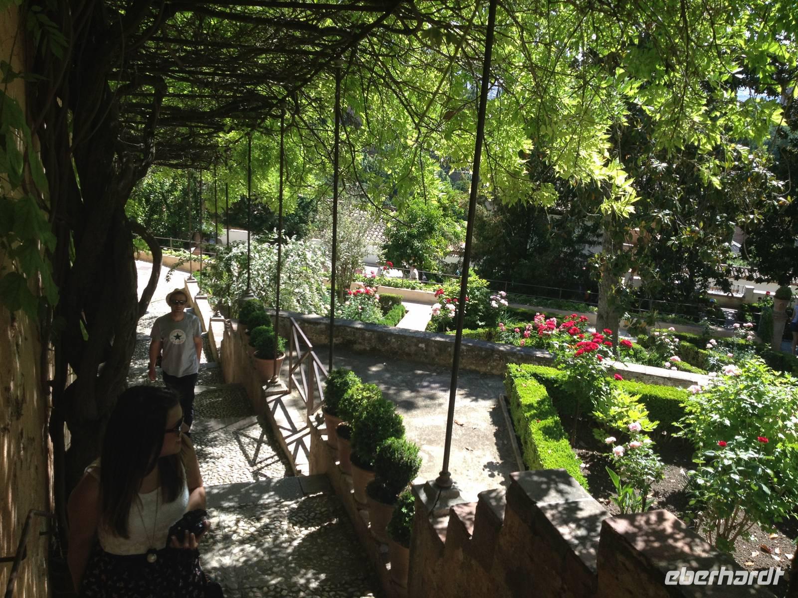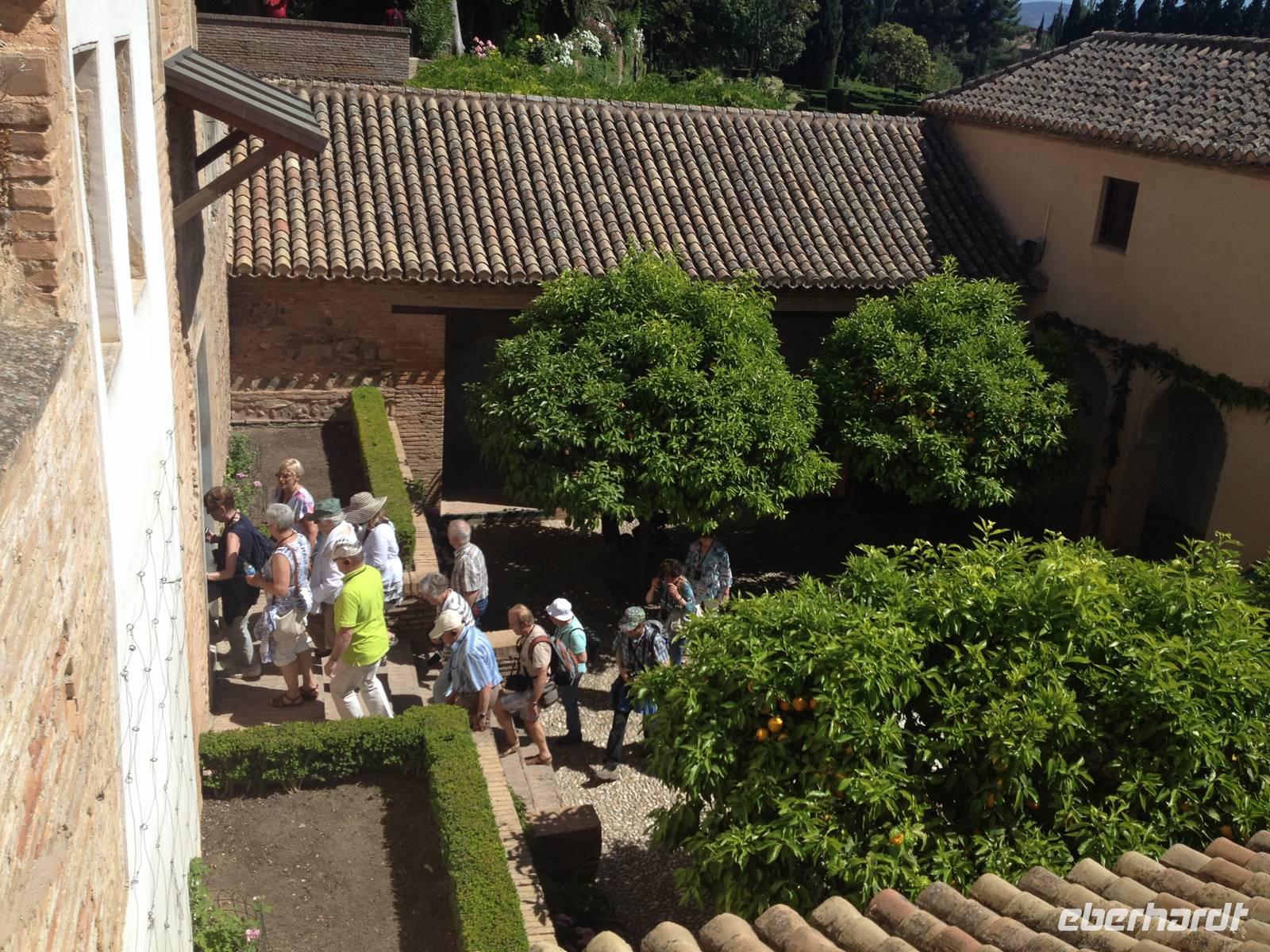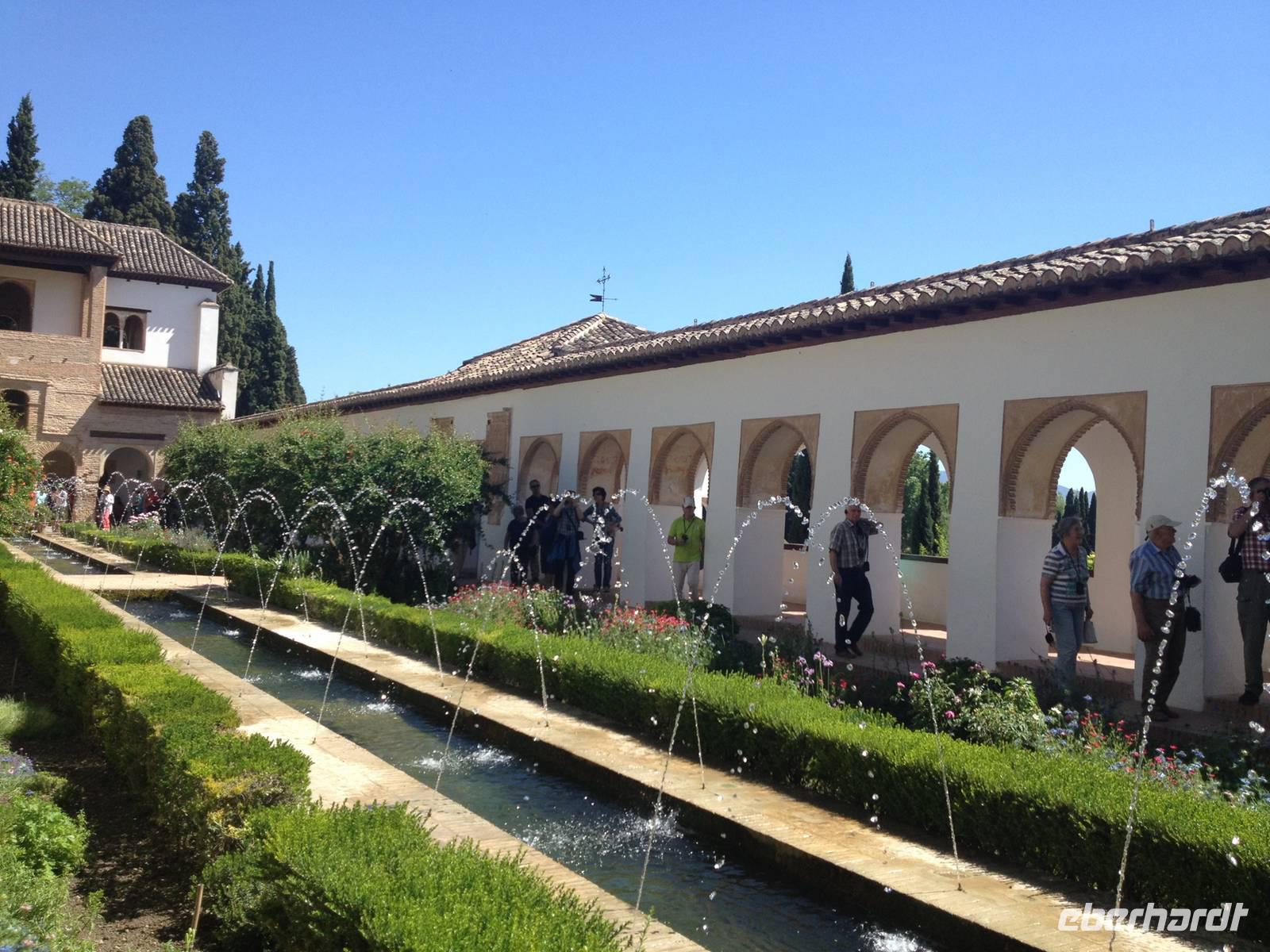 Nun endlich beginnt unsere Besichtigung durch die Gärten der Alhambra mit Toñi und dem Spezialisten Pedro. Anschließend besichtigen wir die ehemalige maurische Festungsanlage, die 1492 im Zuge der Rekatholisierung Spaniens an die Reyes Catolicos übergeben wurde. Hier bekommen wir einen faszinierenden Eindruck von der maurischen Pracht, den arabischen Zeichen und den kobaldblau verzierten Wänden und Decken. Des Weiteren ergötzen wir uns an dem wundervollen Ausblick auf die Sacromonte, der Albayzín, der Altstadt von Granada und die Sierra Nevada, die sogar noch mit Schnee bedeckt sind. Entlang der ältesten Mauren der Festung setzen wir unsere Tour fort zum Palast des Karl V bis zum Nazaríen- Palast, ein authentisches Wunderwerk. Jedes Zimmer möchtet uns etwas erzählen und bringt uns zum Träumen. Wir fühlen nicht nur die Elemente der Natur und dessen Farben, sondern lauschen auch den Geräuschen, das Singen der Vögel und spüren das Licht der Sterne sowie das Sonnenlicht am Tag.