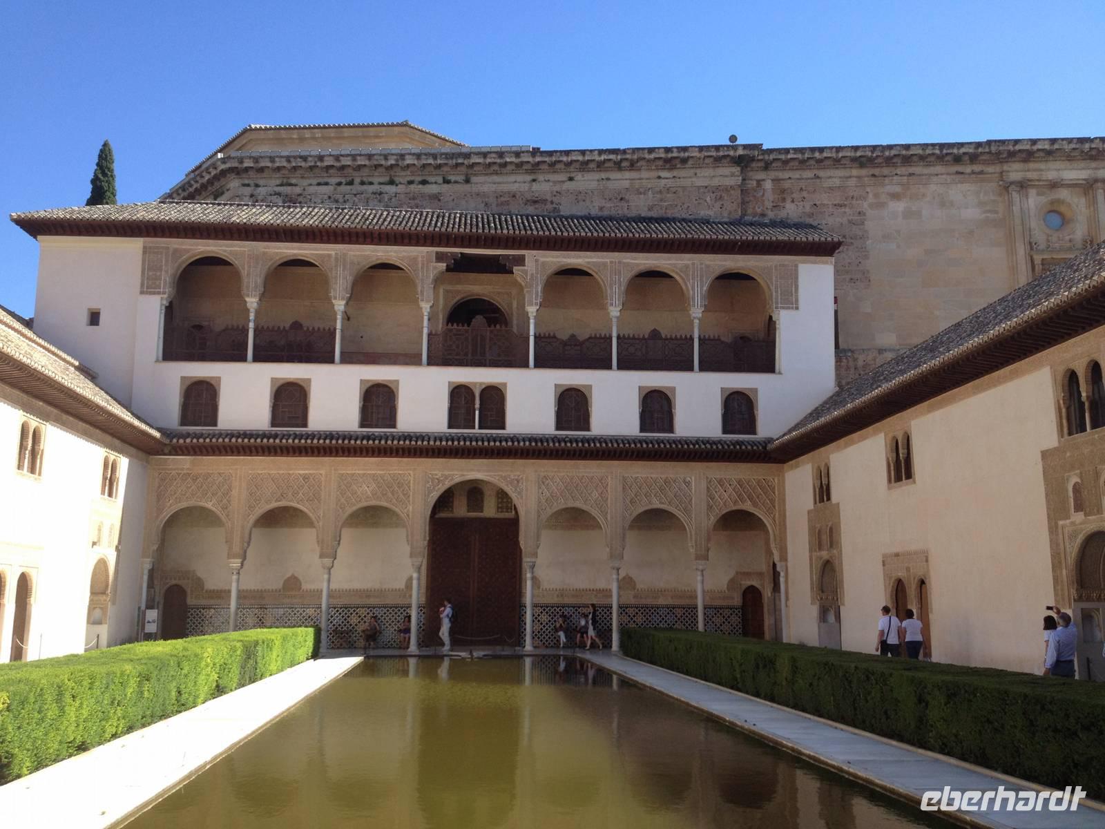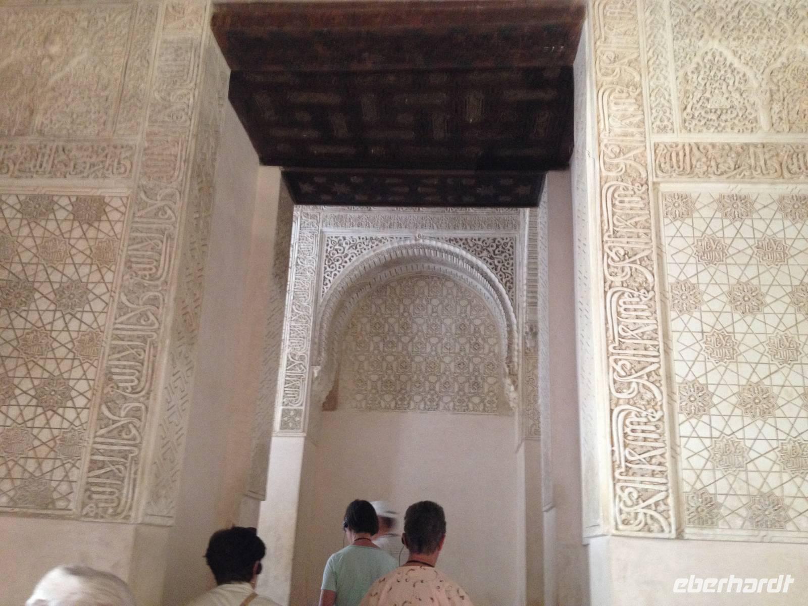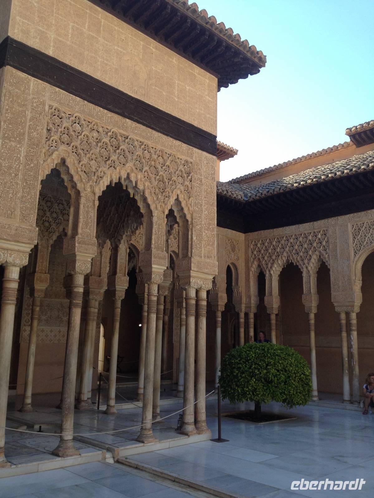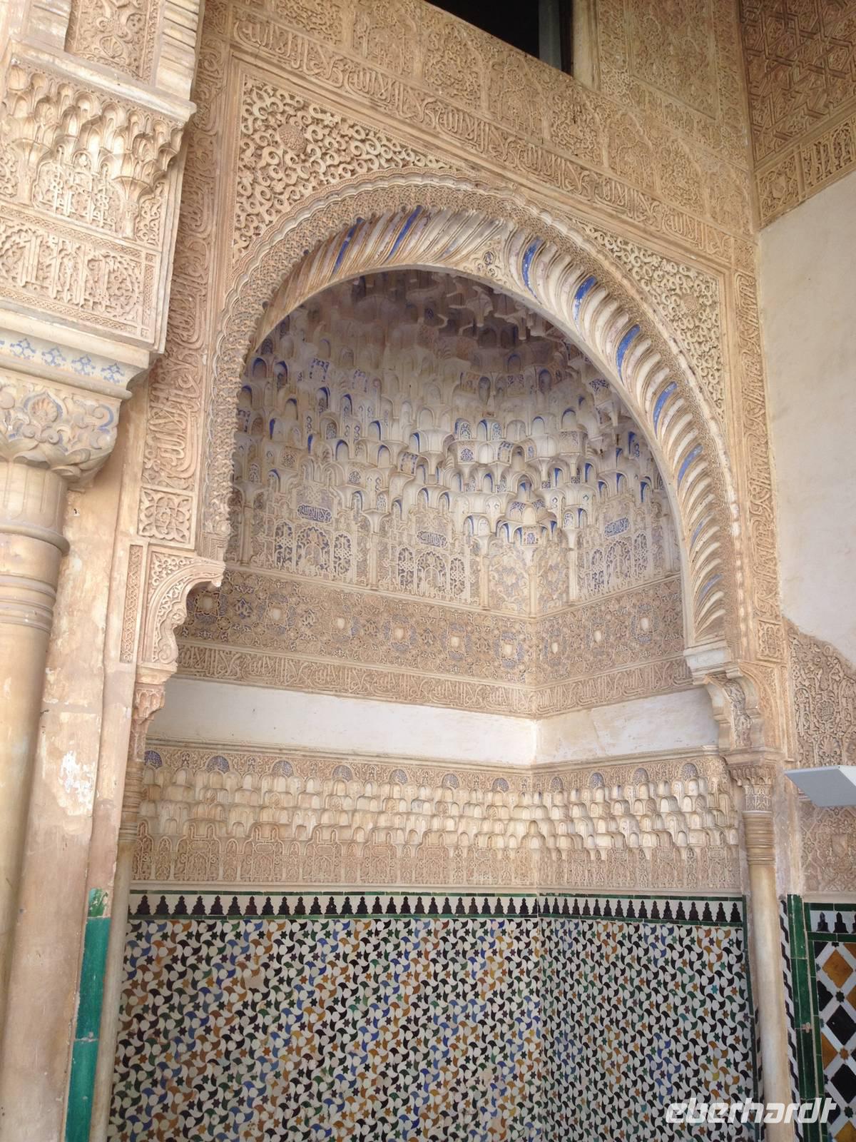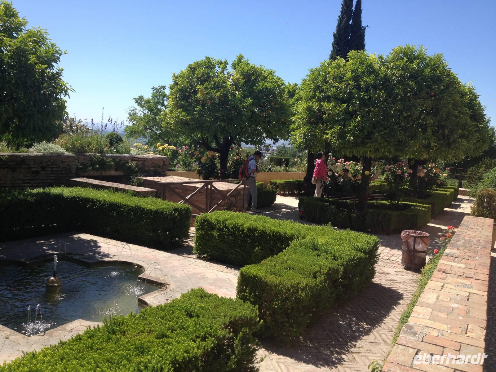 Nun endlich beginnt unsere Besichtigung durch die Gärten der Alhambra mit Toñi und dem Spezialisten Pedro. Anschließend besichtigen wir die ehemalige maurische Festungsanlage, die 1492 im Zuge der Rekatholisierung Spaniens an die Reyes Catolicos übergeben wurde. Hier bekommen wir einen faszinierenden Eindruck von der maurischen Pracht, den arabischen Zeichen und den kobaldblau verzierten Wänden und Decken. Des Weiteren ergötzen wir uns an dem wundervollen Ausblick auf die Sacromonte, der Albayzín, der Altstadt von Granada und die Sierra Nevada, die sogar noch mit Schnee bedeckt sind. Entlang der ältesten Mauren der Festung setzen wir unsere Tour fort zum Palast des Karl V bis zum Nazaríen- Palast, ein authentisches Wunderwerk. Jedes Zimmer möchtet uns etwas erzählen und bringt uns zum Träumen. Wir fühlen nicht nur die Elemente der Natur und dessen Farben, sondern lauschen auch den Geräuschen, das Singen der Vögel und spüren das Licht der Sterne sowie das Sonnenlicht am Tag.
