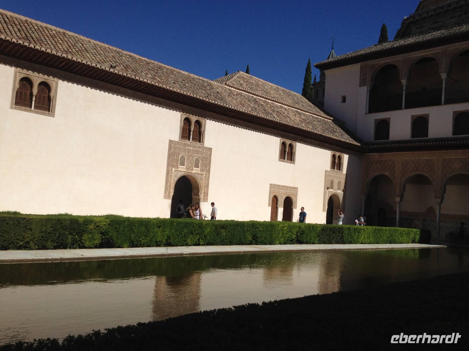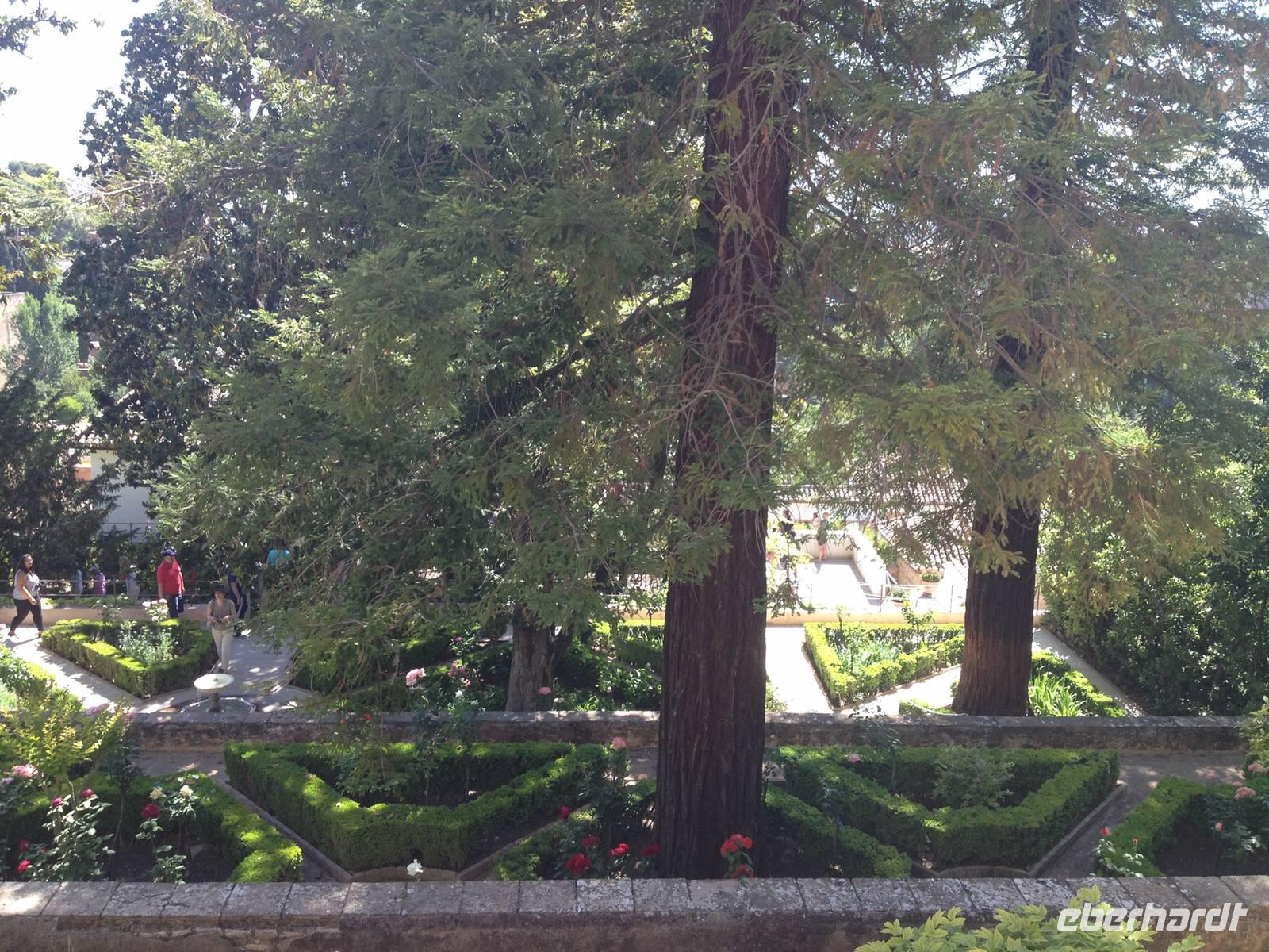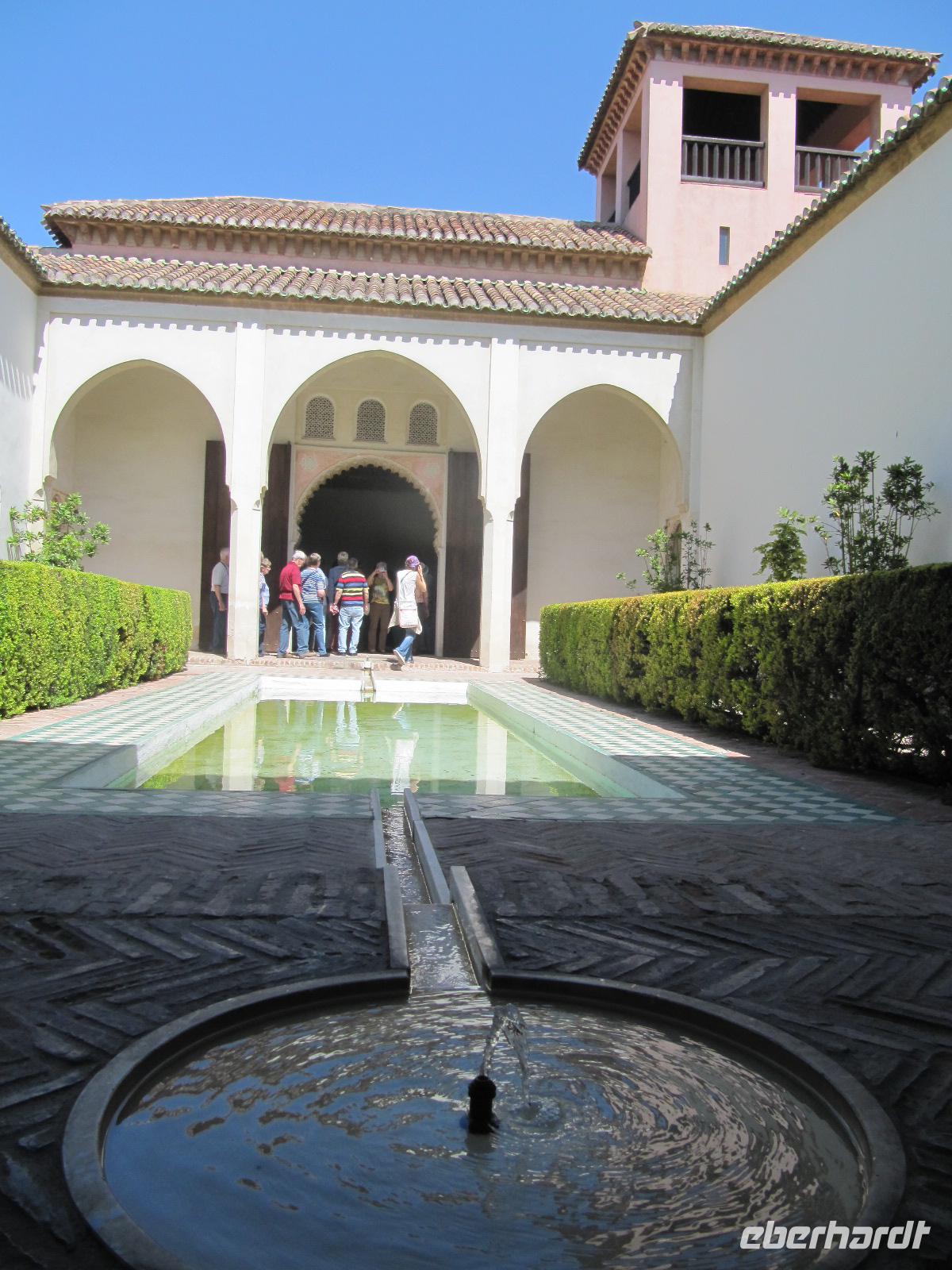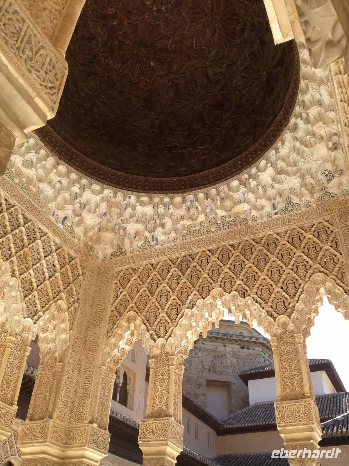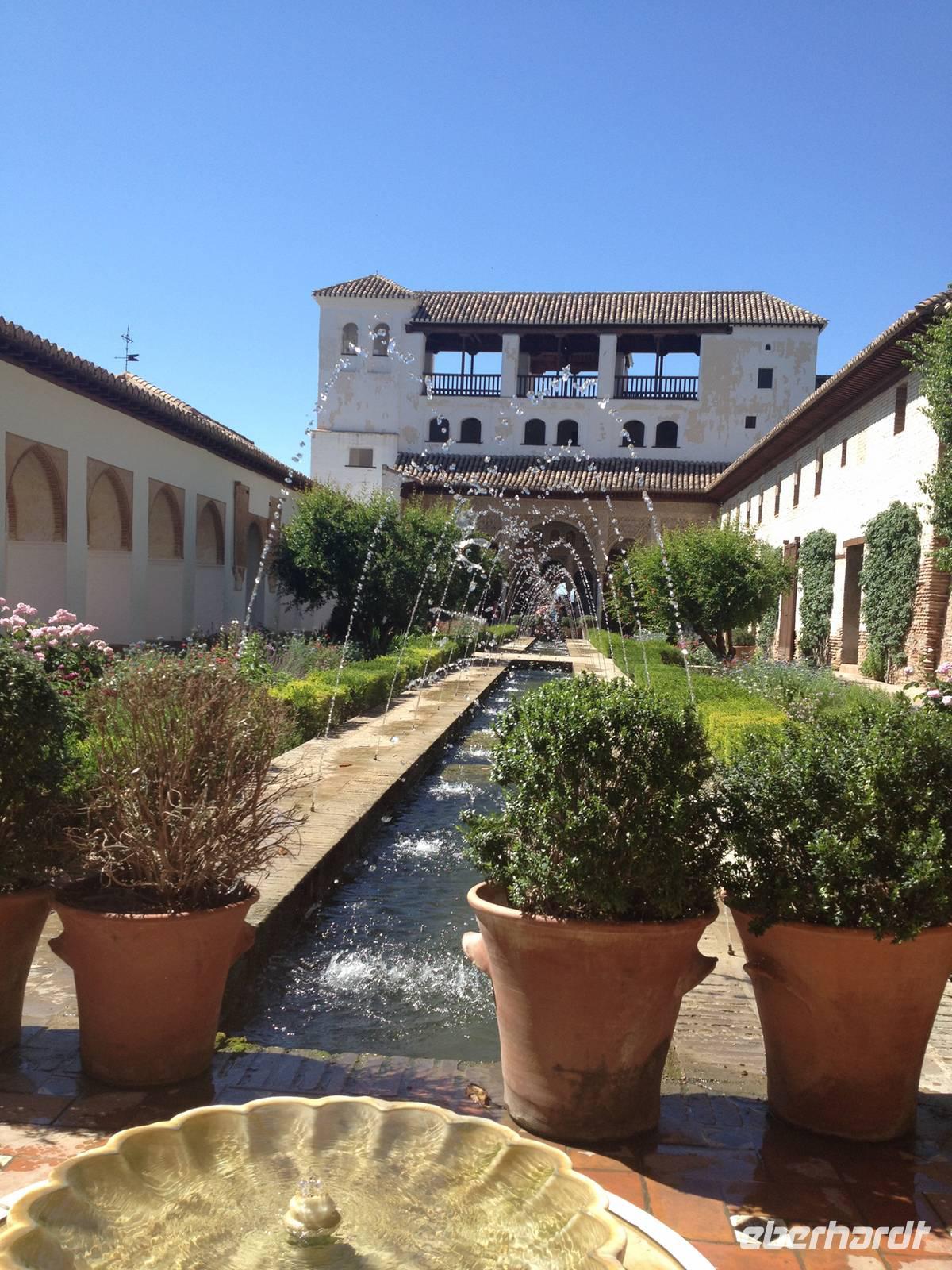 Nun endlich beginnt unsere Besichtigung durch die Gärten der Alhambra mit Toñi und dem Spezialisten Pedro. Anschließend besichtigen wir die ehemalige maurische Festungsanlage, die 1492 im Zuge der Rekatholisierung Spaniens an die Reyes Catolicos übergeben wurde. Hier bekommen wir einen faszinierenden Eindruck von der maurischen Pracht, den arabischen Zeichen und den kobaldblau verzierten Wänden und Decken. Des Weiteren ergötzen wir uns an dem wundervollen Ausblick auf die Sacromonte, der Albayzín, der Altstadt von Granada und die Sierra Nevada, die sogar noch mit Schnee bedeckt sind. Entlang der ältesten Mauren der Festung setzen wir unsere Tour fort zum Palast des Karl V bis zum Nazaríen- Palast, ein authentisches Wunderwerk. Jedes Zimmer möchtet uns etwas erzählen und bringt uns zum Träumen. Wir fühlen nicht nur die Elemente der Natur und dessen Farben, sondern lauschen auch den Geräuschen, das Singen der Vögel und spüren das Licht der Sterne sowie das Sonnenlicht am Tag.
