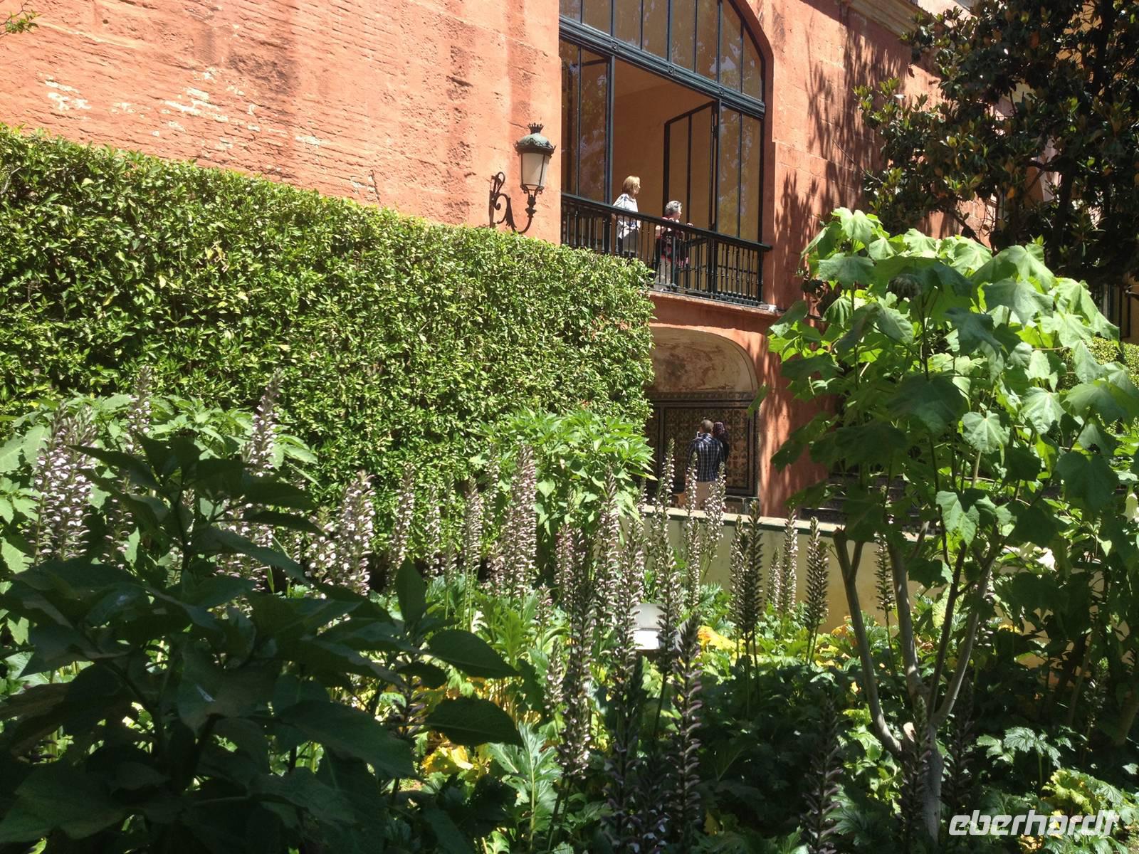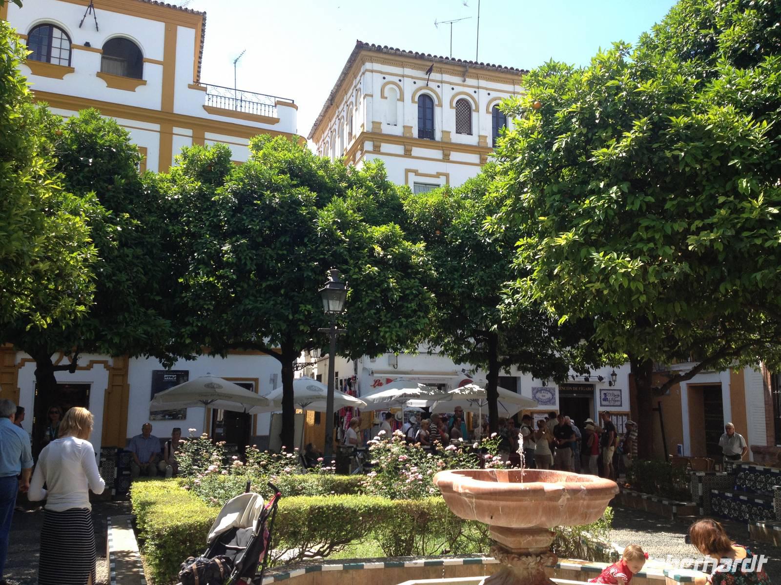 Wir begannen unsere Besichtigung auf der „Plaza de España“ auf der wir unsere Stadtführerin Vivien in Empfang nahmen. Sie erzählte uns viele interessante Dinge, u.a warum dieser Platz gebaut wurden ist und warum er so besonders ist. Danach haben wir unsere örtliche Reiseleiterin Carmen getroffen. Zusammen mit ihr begannen wir unsere Stadtführung in dem Garten von Murillo, indem sich ein Monument von Kolumbus befindet. Carmen führte uns weiter durch das Viertel von Santa Cruz, das bekannt für seine engen Straßen und Gassen ist. Nachdem wir uns durch diese geschlängelt hatten, entdeckten wir die typischen andalusischen „Patios“ der „Reales Alcázares“ in deren Zentrum sich eine kleine Wasserquelle befindet.