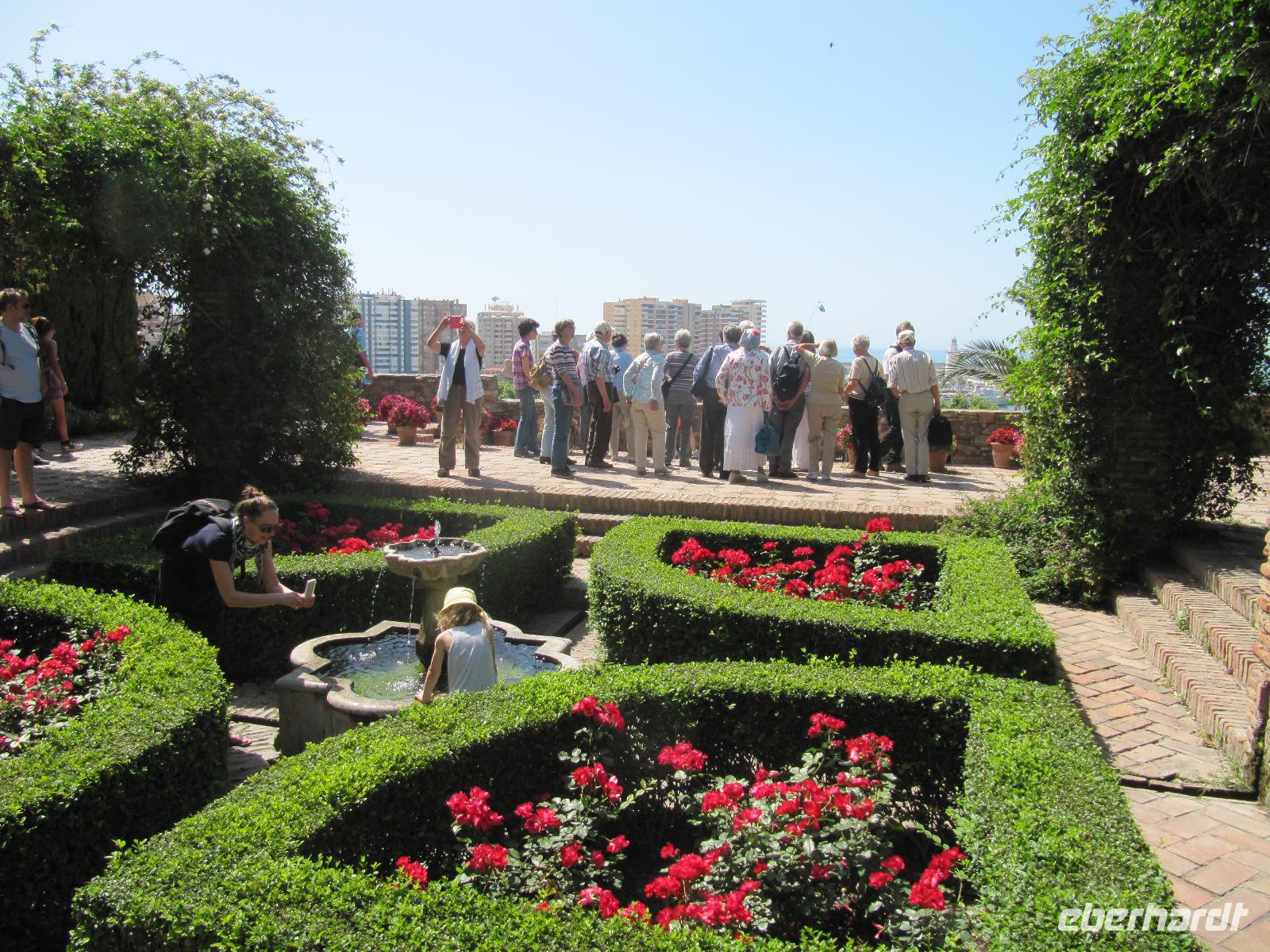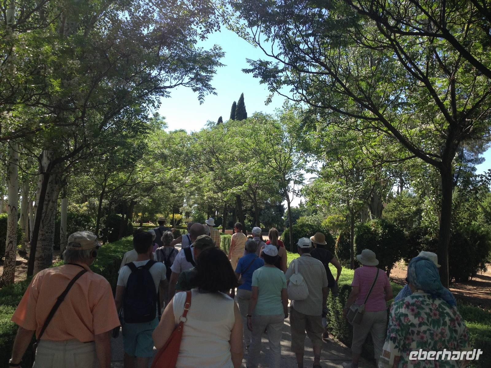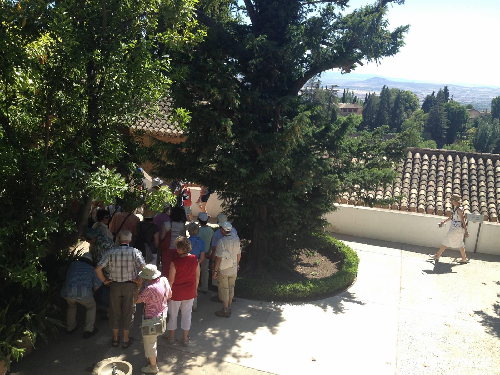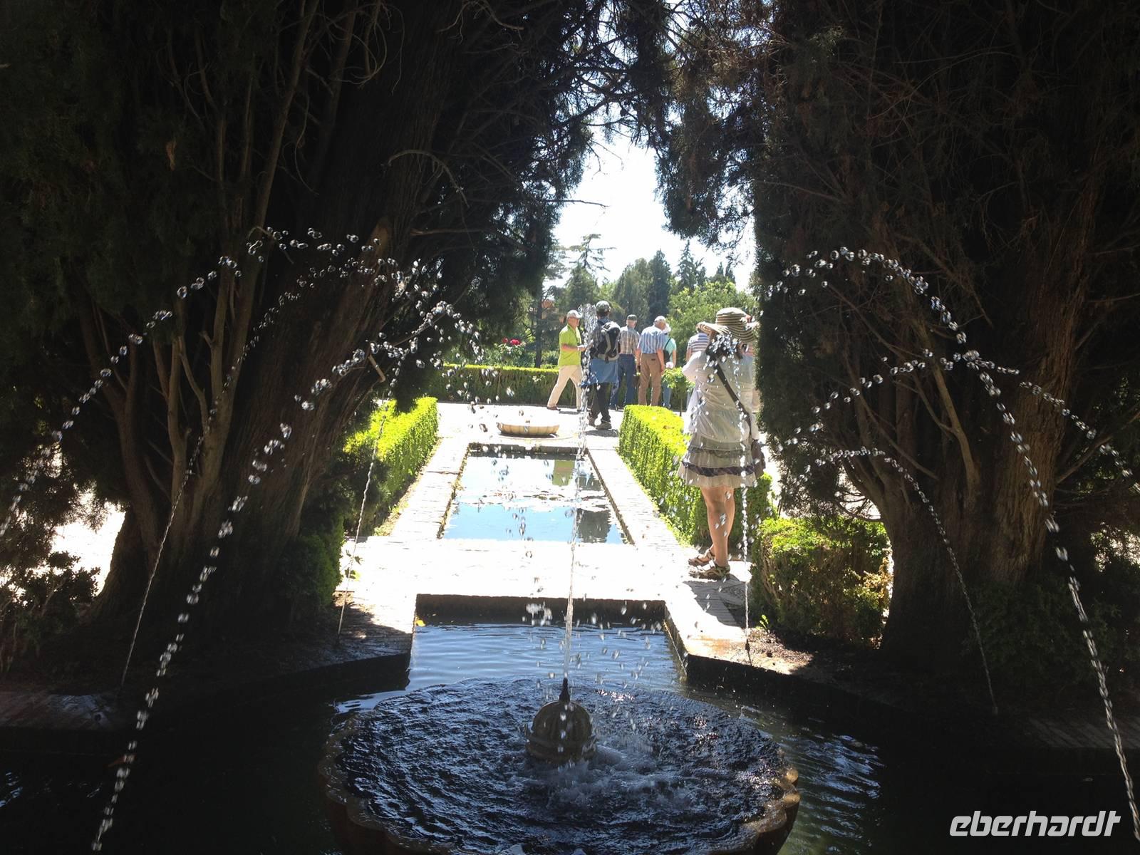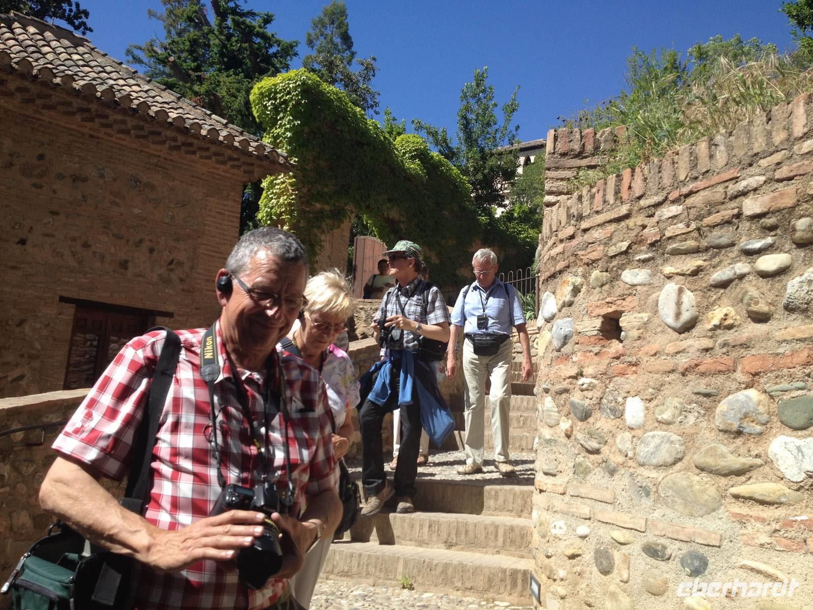 Nun endlich beginnt unsere Besichtigung durch die Gärten der Alhambra mit Toñi und dem Spezialisten Pedro. Anschließend besichtigen wir die ehemalige maurische Festungsanlage, die 1492 im Zuge der Rekatholisierung Spaniens an die Reyes Catolicos übergeben wurde. Hier bekommen wir einen faszinierenden Eindruck von der maurischen Pracht, den arabischen Zeichen und den kobaldblau verzierten Wänden und Decken. Des Weiteren ergötzen wir uns an dem wundervollen Ausblick auf die Sacromonte, der Albayzín, der Altstadt von Granada und die Sierra Nevada, die sogar noch mit Schnee bedeckt sind. Entlang der ältesten Mauren der Festung setzen wir unsere Tour fort zum Palast des Karl V bis zum Nazaríen- Palast, ein authentisches Wunderwerk. Jedes Zimmer möchtet uns etwas erzählen und bringt uns zum Träumen. Wir fühlen nicht nur die Elemente der Natur und dessen Farben, sondern lauschen auch den Geräuschen, das Singen der Vögel und spüren das Licht der Sterne sowie das Sonnenlicht am Tag.