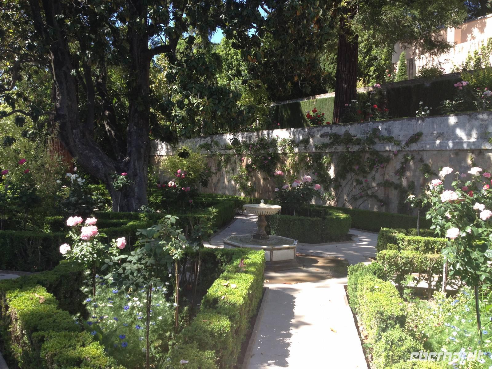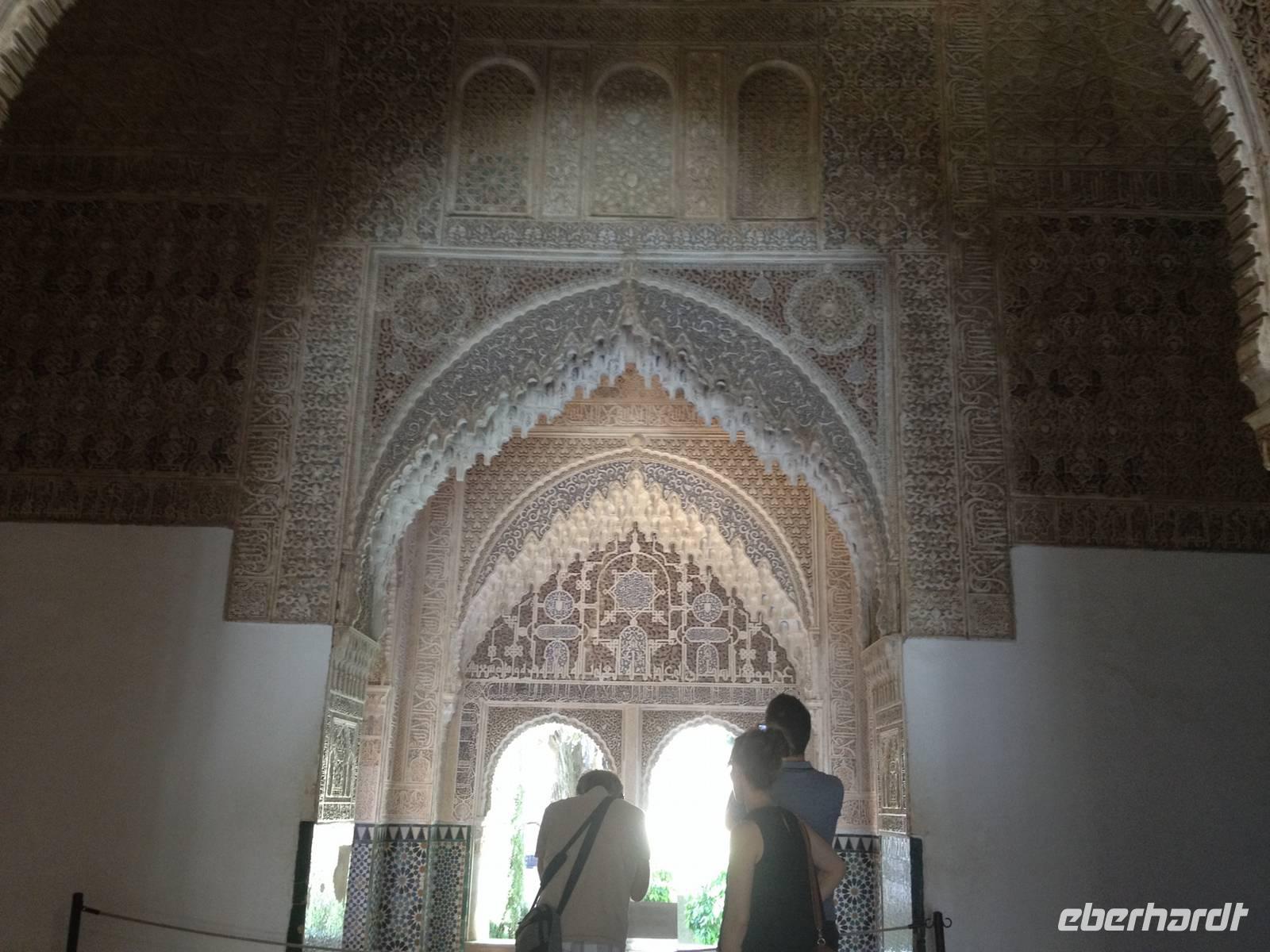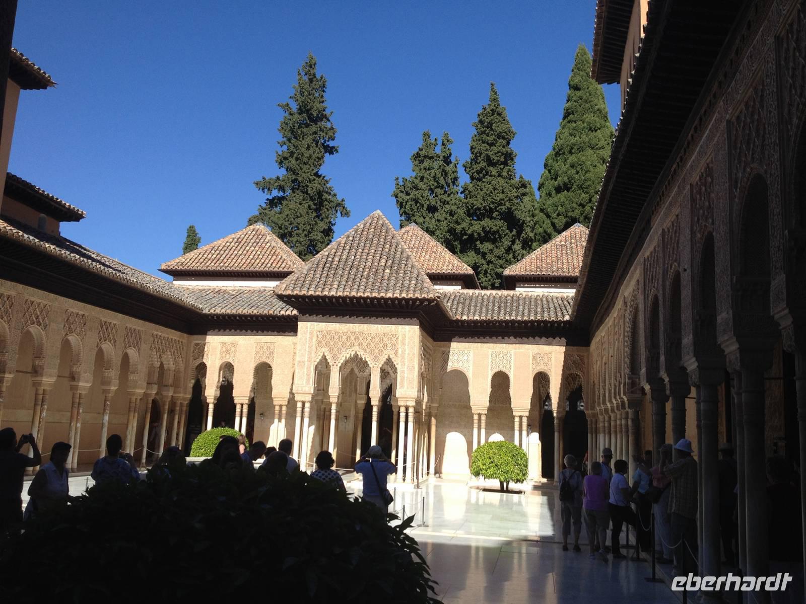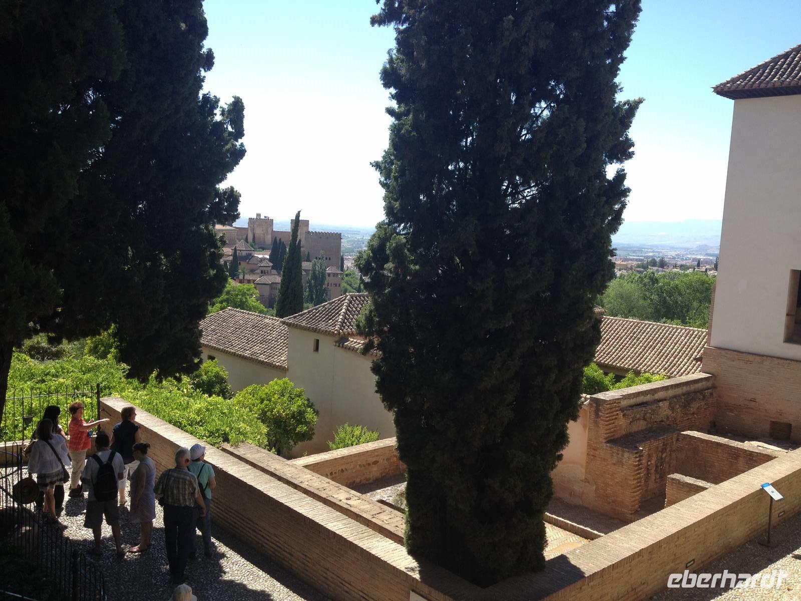 Nun endlich beginnt unsere Besichtigung durch die Gärten der Alhambra mit Toñi und dem Spezialisten Pedro. Anschließend besichtigen wir die ehemalige maurische Festungsanlage, die 1492 im Zuge der Rekatholisierung Spaniens an die Reyes Catolicos übergeben wurde. Hier bekommen wir einen faszinierenden Eindruck von der maurischen Pracht, den arabischen Zeichen und den kobaldblau verzierten Wänden und Decken. Des Weiteren ergötzen wir uns an dem wundervollen Ausblick auf die Sacromonte, der Albayzín, der Altstadt von Granada und die Sierra Nevada, die sogar noch mit Schnee bedeckt sind. Entlang der ältesten Mauren der Festung setzen wir unsere Tour fort zum Palast des Karl V bis zum Nazaríen- Palast, ein authentisches Wunderwerk. Jedes Zimmer möchtet uns etwas erzählen und bringt uns zum Träumen. Wir fühlen nicht nur die Elemente der Natur und dessen Farben, sondern lauschen auch den Geräuschen, das Singen der Vögel und spüren das Licht der Sterne sowie das Sonnenlicht am Tag.