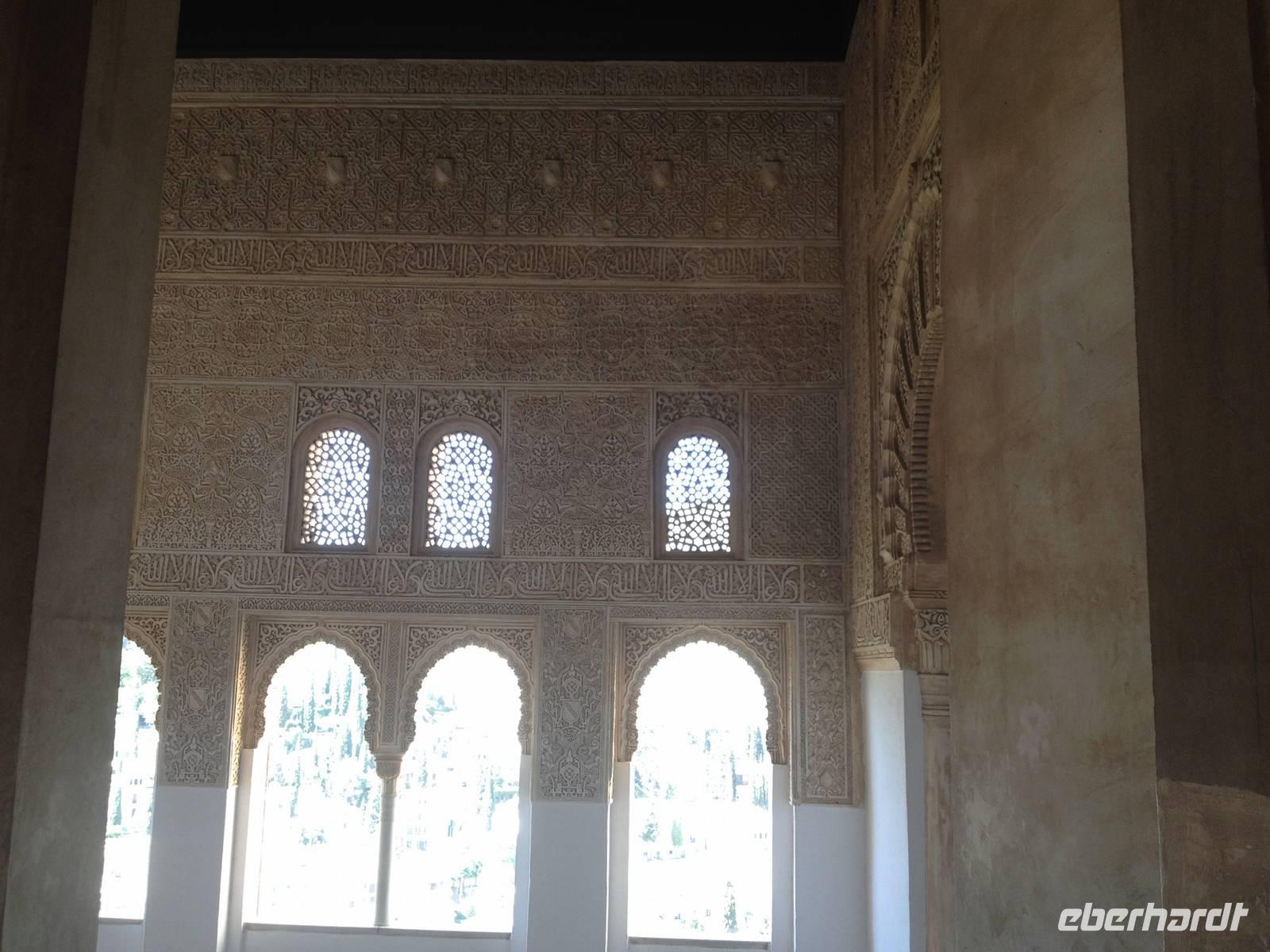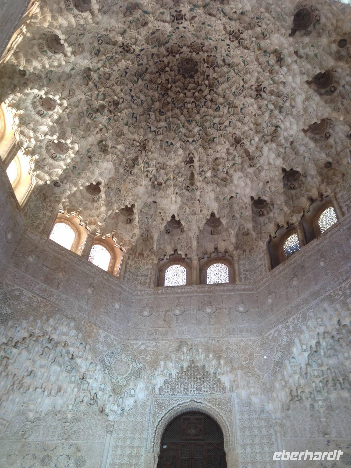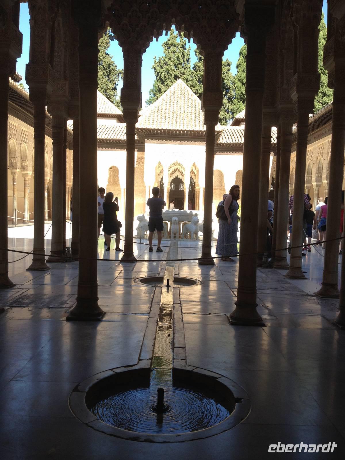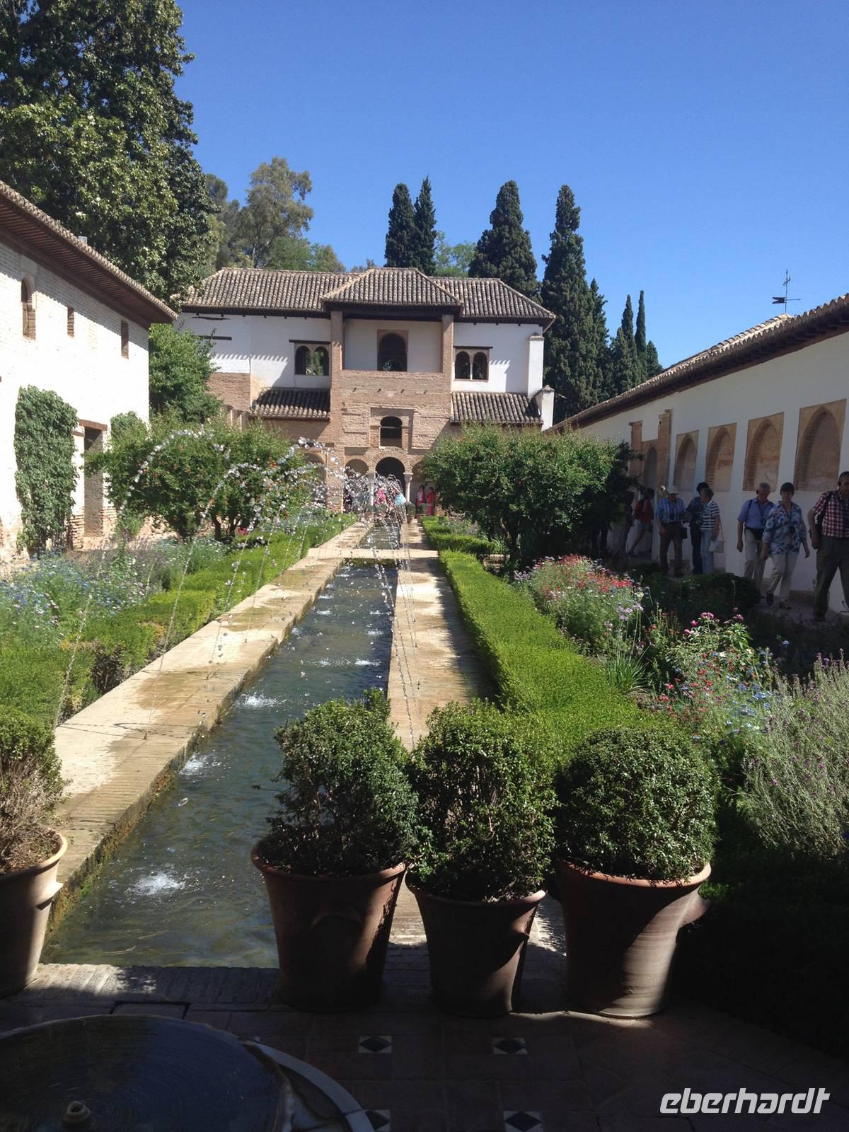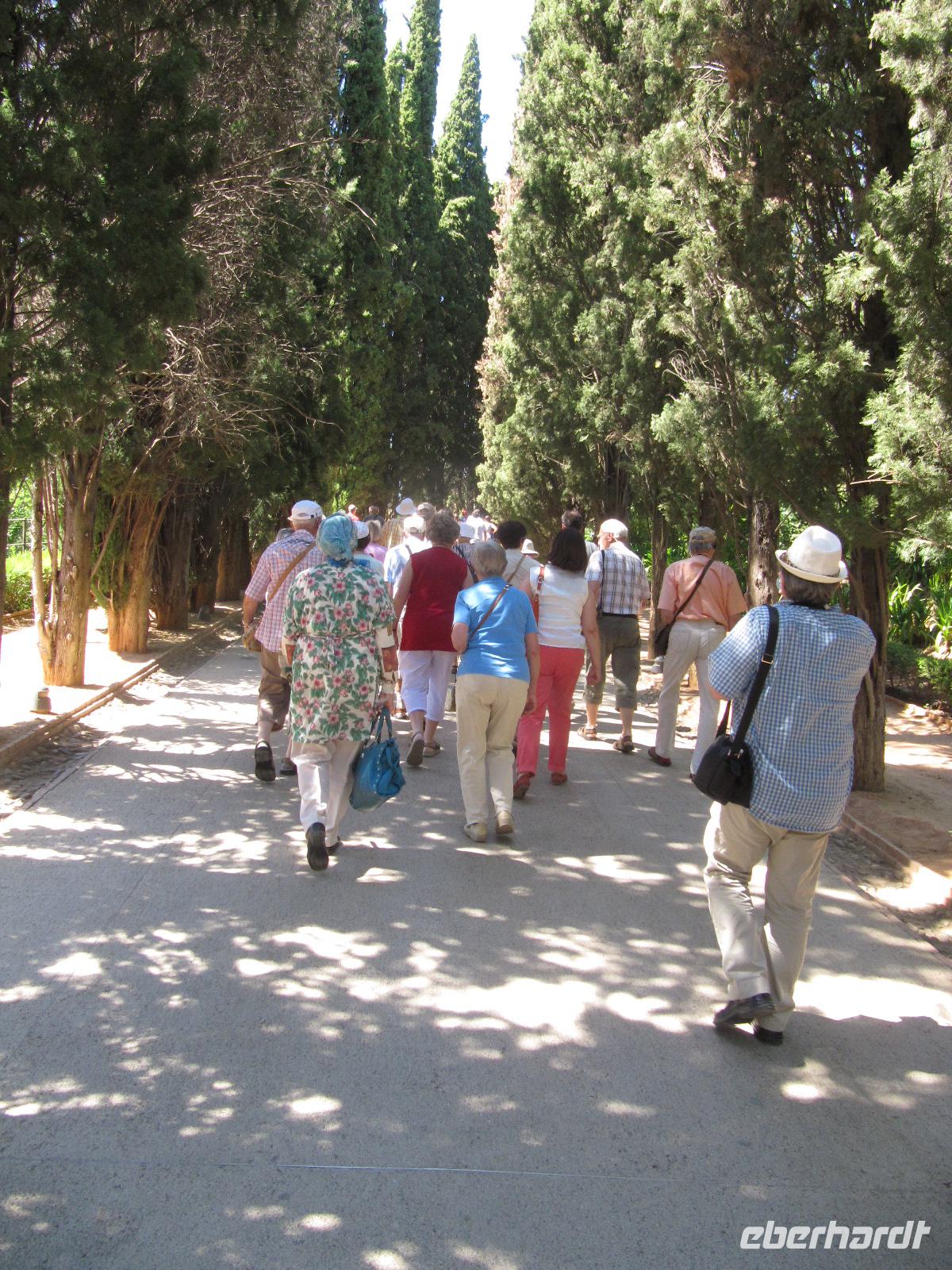 Nun endlich beginnt unsere Besichtigung durch die Gärten der Alhambra mit Toñi und dem Spezialisten Pedro. Anschließend besichtigen wir die ehemalige maurische Festungsanlage, die 1492 im Zuge der Rekatholisierung Spaniens an die Reyes Catolicos übergeben wurde. Hier bekommen wir einen faszinierenden Eindruck von der maurischen Pracht, den arabischen Zeichen und den kobaldblau verzierten Wänden und Decken. Des Weiteren ergötzen wir uns an dem wundervollen Ausblick auf die Sacromonte, der Albayzín, der Altstadt von Granada und die Sierra Nevada, die sogar noch mit Schnee bedeckt sind. Entlang der ältesten Mauren der Festung setzen wir unsere Tour fort zum Palast des Karl V bis zum Nazaríen- Palast, ein authentisches Wunderwerk. Jedes Zimmer möchtet uns etwas erzählen und bringt uns zum Träumen. Wir fühlen nicht nur die Elemente der Natur und dessen Farben, sondern lauschen auch den Geräuschen, das Singen der Vögel und spüren das Licht der Sterne sowie das Sonnenlicht am Tag.