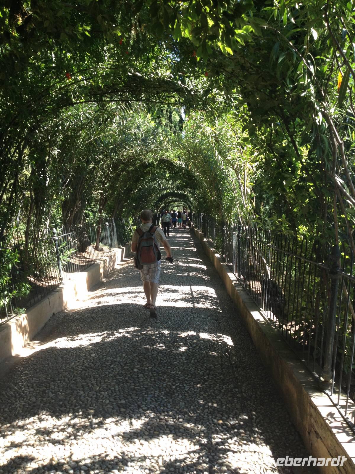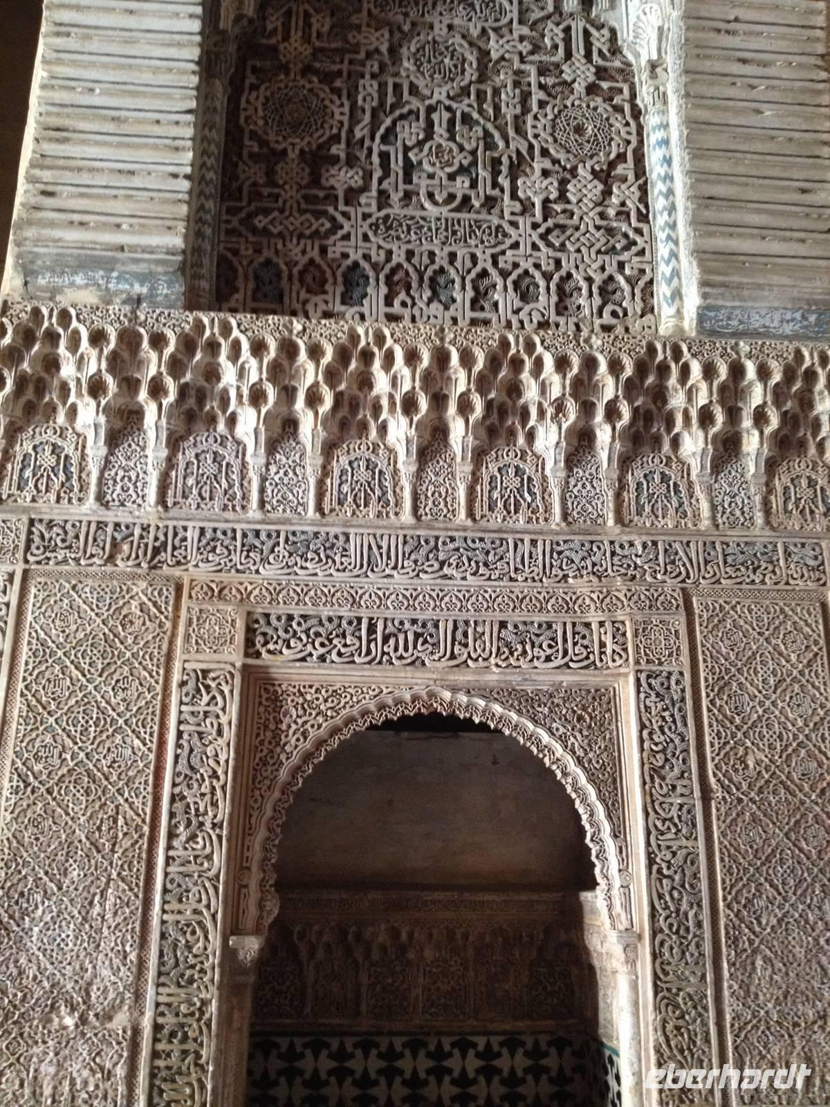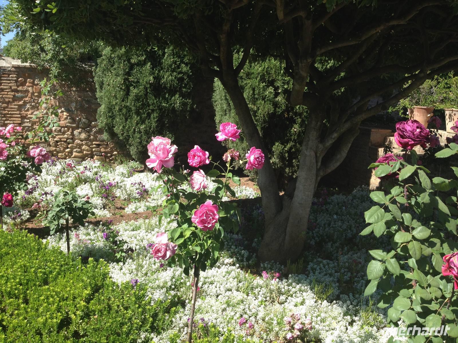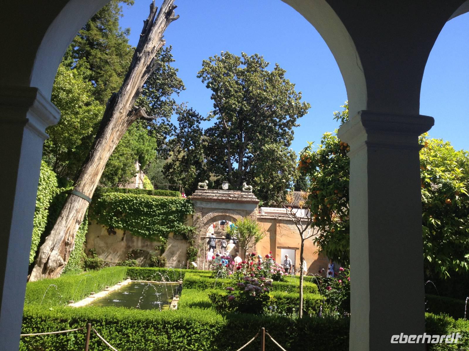 Nun endlich beginnt unsere Besichtigung durch die Gärten der Alhambra mit Toñi und dem Spezialisten Pedro. Anschließend besichtigen wir die ehemalige maurische Festungsanlage, die 1492 im Zuge der Rekatholisierung Spaniens an die Reyes Catolicos übergeben wurde. Hier bekommen wir einen faszinierenden Eindruck von der maurischen Pracht, den arabischen Zeichen und den kobaldblau verzierten Wänden und Decken. Des Weiteren ergötzen wir uns an dem wundervollen Ausblick auf die Sacromonte, der Albayzín, der Altstadt von Granada und die Sierra Nevada, die sogar noch mit Schnee bedeckt sind. Entlang der ältesten Mauren der Festung setzen wir unsere Tour fort zum Palast des Karl V bis zum Nazaríen- Palast, ein authentisches Wunderwerk. Jedes Zimmer möchtet uns etwas erzählen und bringt uns zum Träumen. Wir fühlen nicht nur die Elemente der Natur und dessen Farben, sondern lauschen auch den Geräuschen, das Singen der Vögel und spüren das Licht der Sterne sowie das Sonnenlicht am Tag.