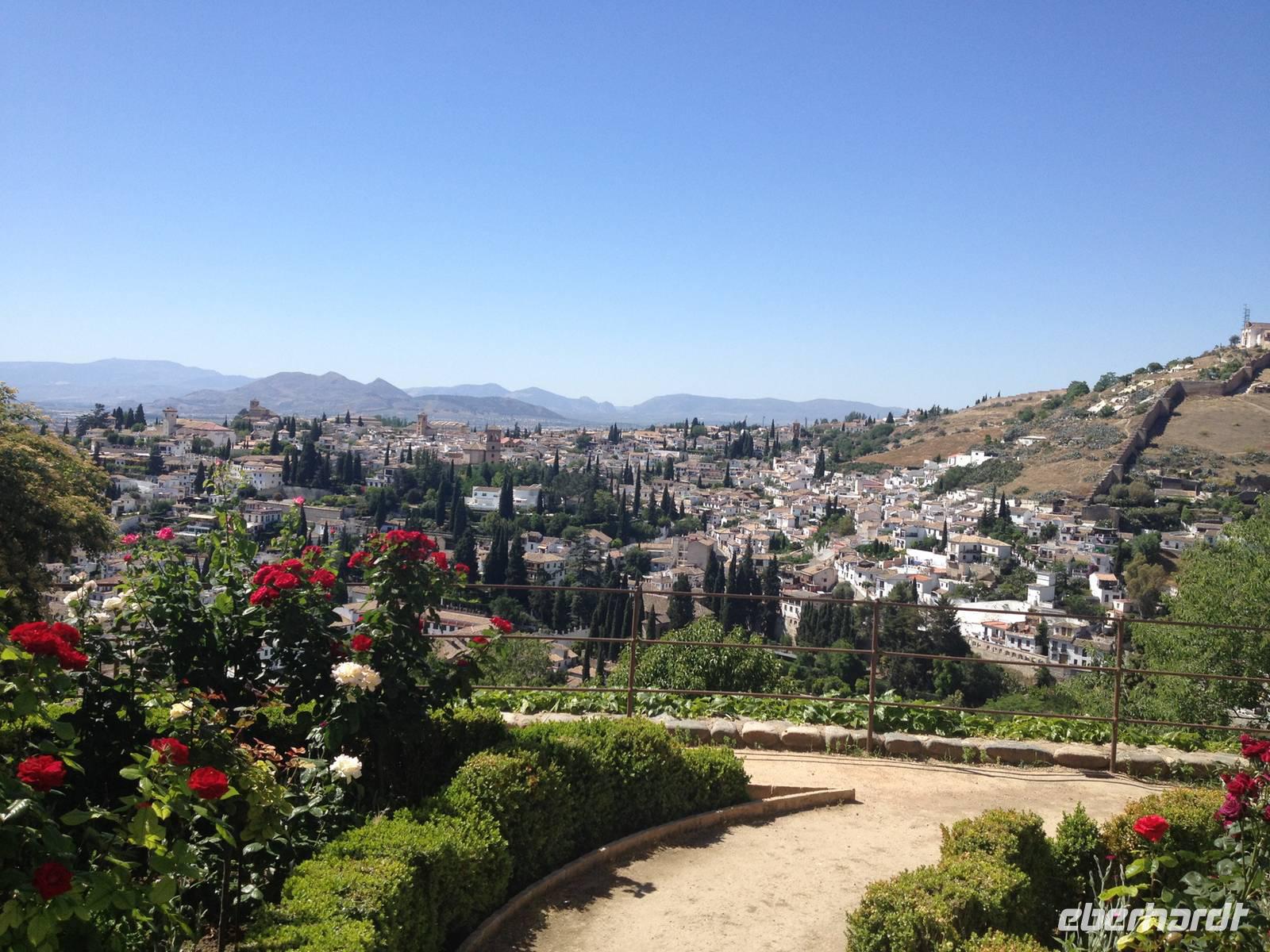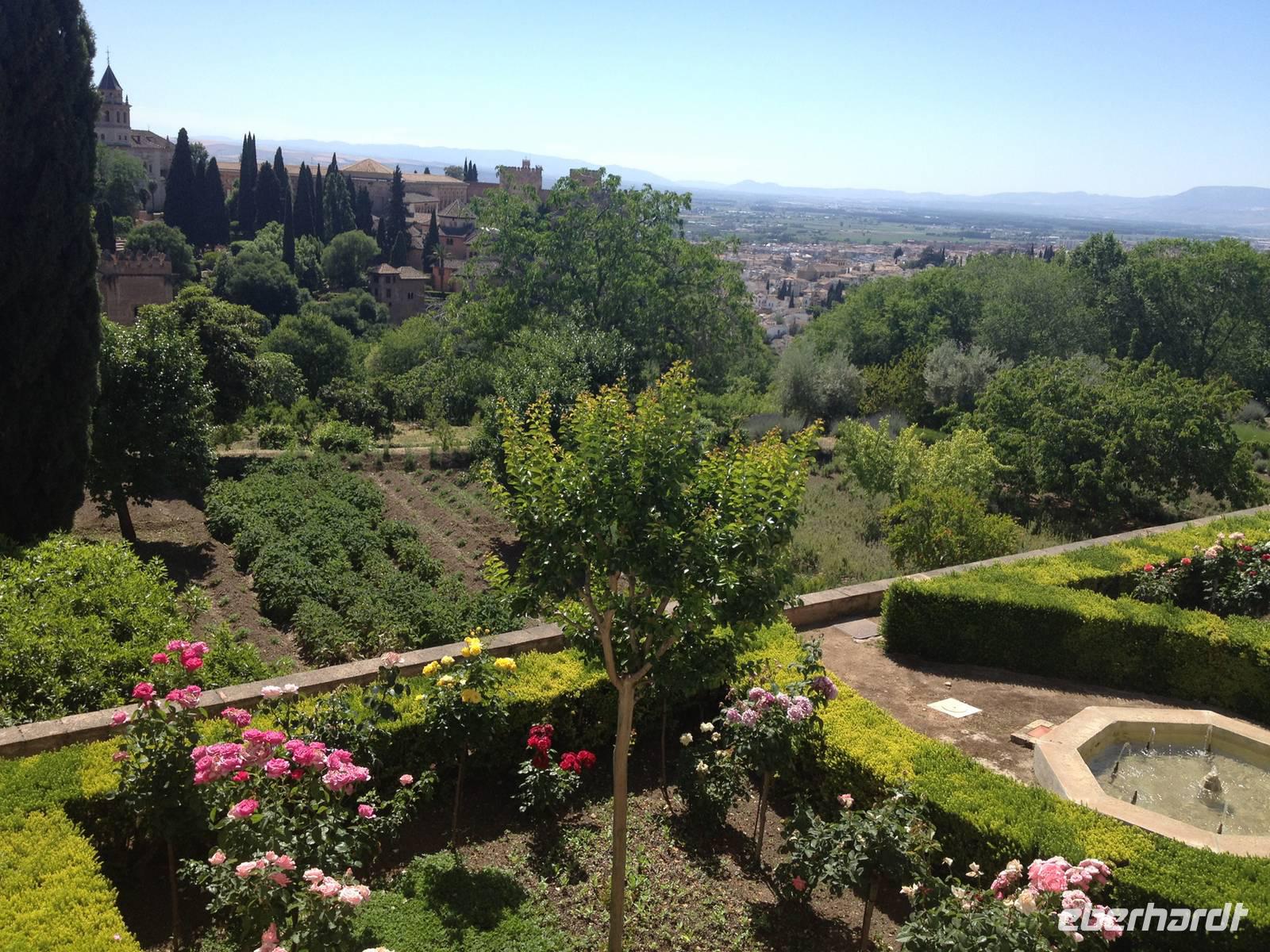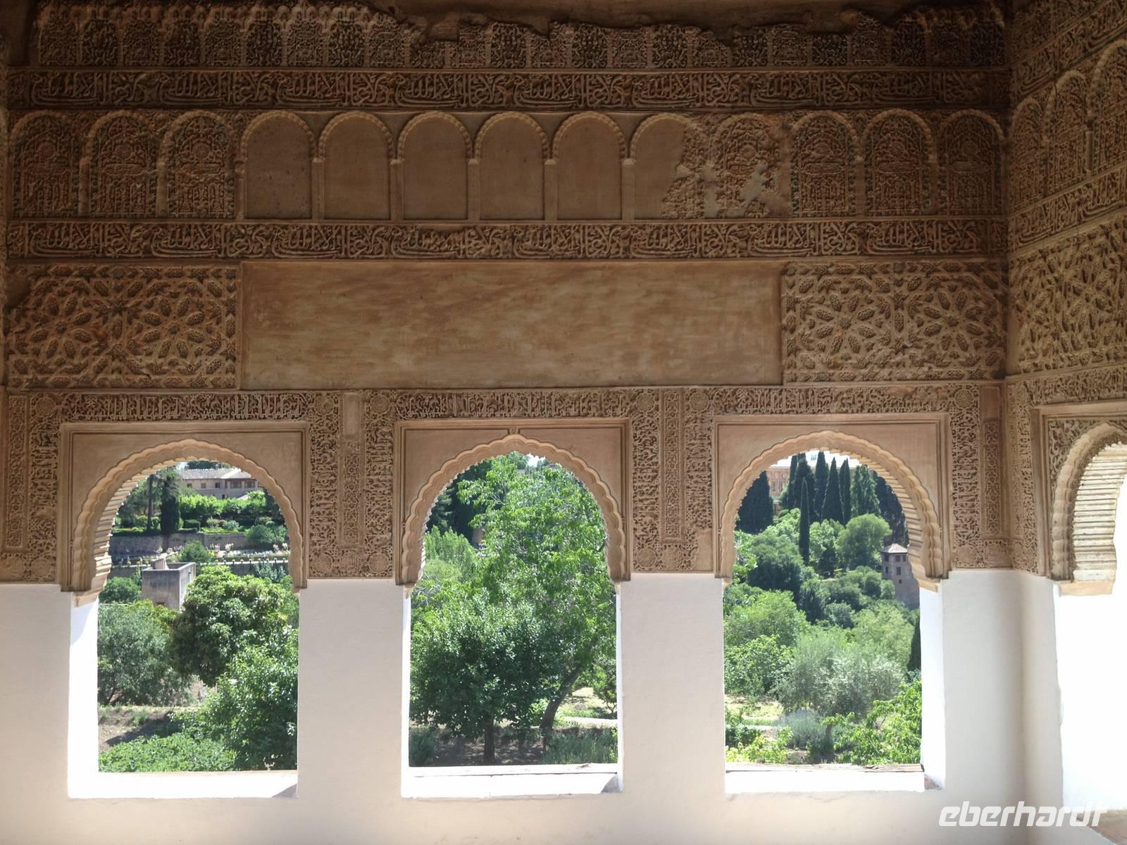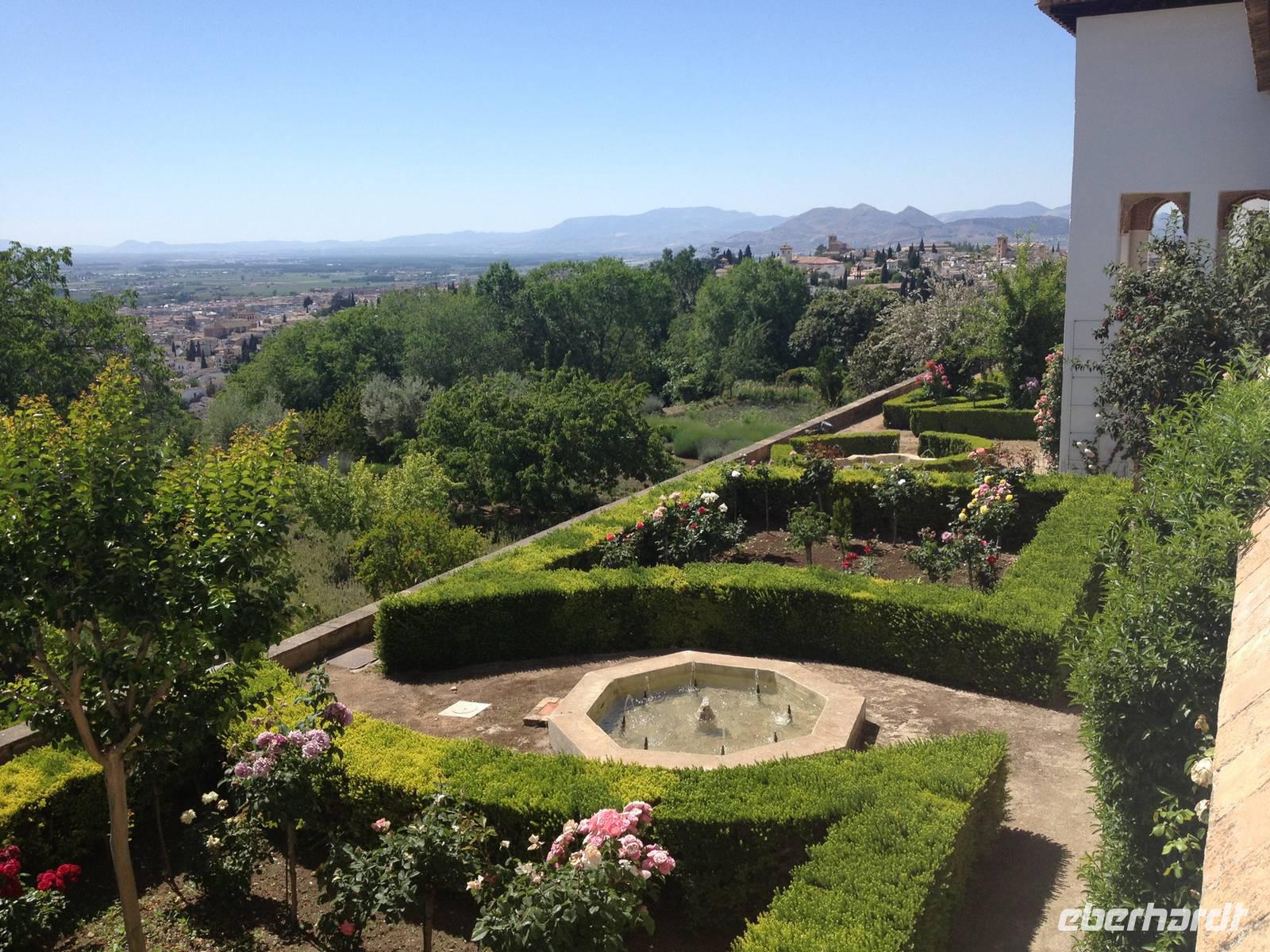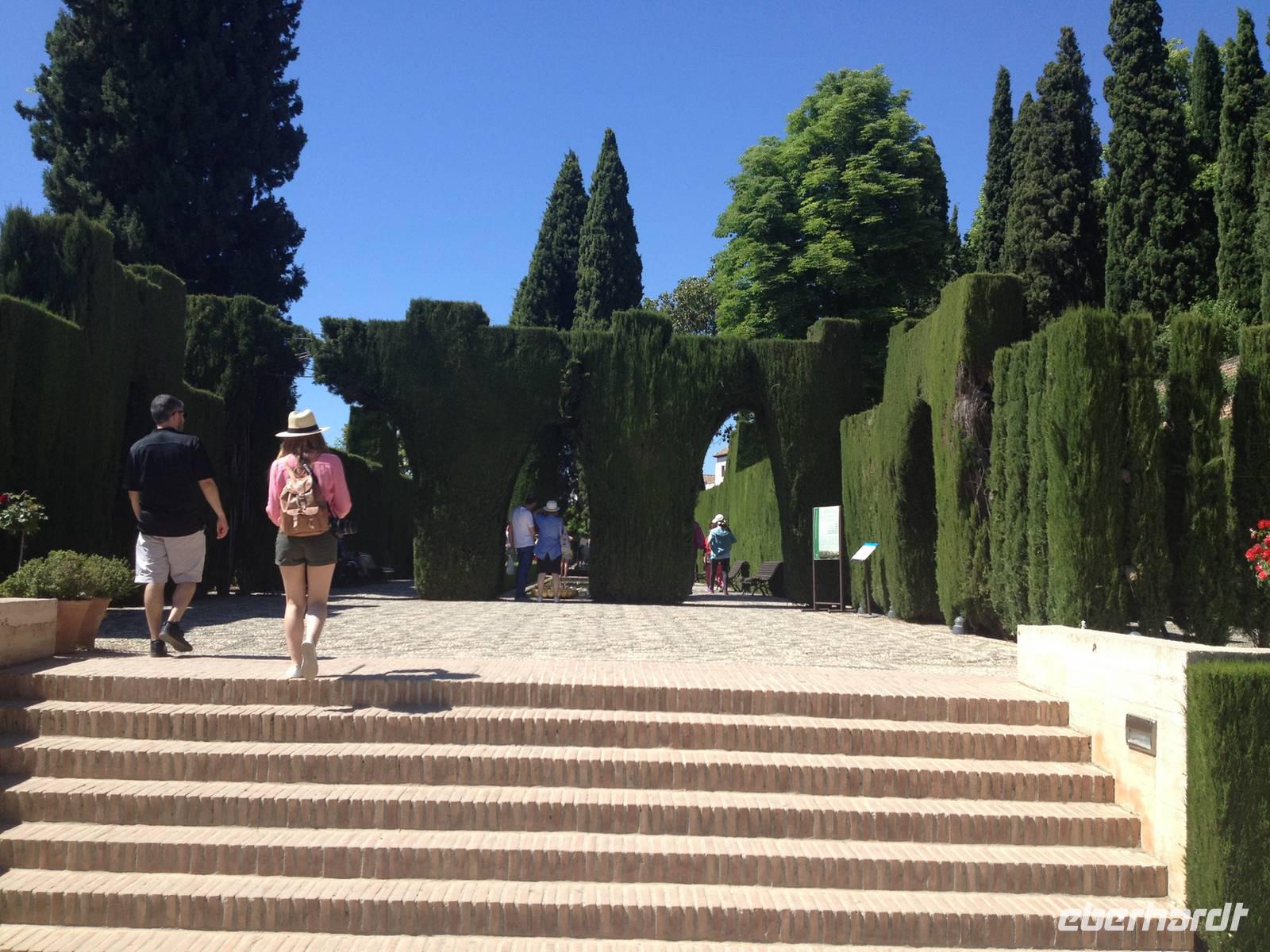 Nun endlich beginnt unsere Besichtigung durch die Gärten der Alhambra mit Toñi und dem Spezialisten Pedro. Anschließend besichtigen wir die ehemalige maurische Festungsanlage, die 1492 im Zuge der Rekatholisierung Spaniens an die Reyes Catolicos übergeben wurde. Hier bekommen wir einen faszinierenden Eindruck von der maurischen Pracht, den arabischen Zeichen und den kobaldblau verzierten Wänden und Decken. Des Weiteren ergötzen wir uns an dem wundervollen Ausblick auf die Sacromonte, der Albayzín, der Altstadt von Granada und die Sierra Nevada, die sogar noch mit Schnee bedeckt sind. Entlang der ältesten Mauren der Festung setzen wir unsere Tour fort zum Palast des Karl V bis zum Nazaríen- Palast, ein authentisches Wunderwerk. Jedes Zimmer möchtet uns etwas erzählen und bringt uns zum Träumen. Wir fühlen nicht nur die Elemente der Natur und dessen Farben, sondern lauschen auch den Geräuschen, das Singen der Vögel und spüren das Licht der Sterne sowie das Sonnenlicht am Tag.