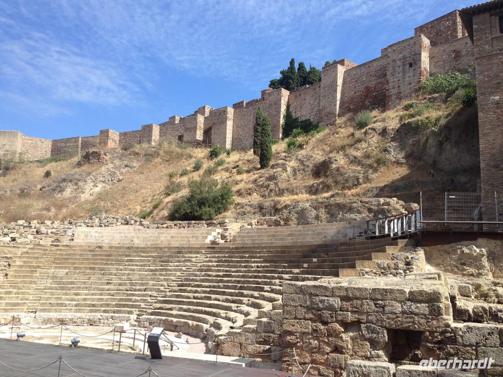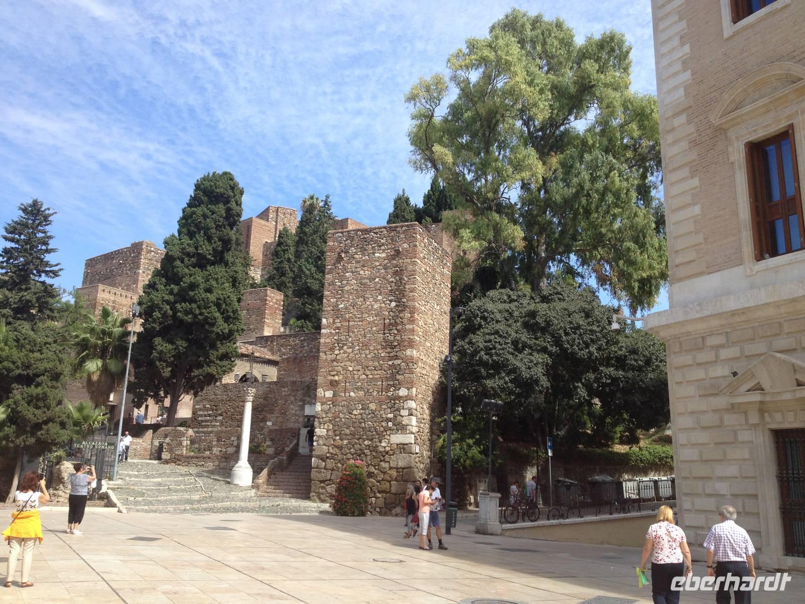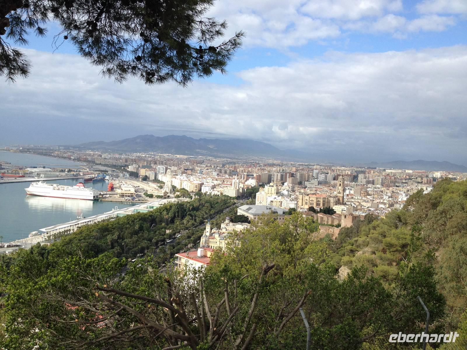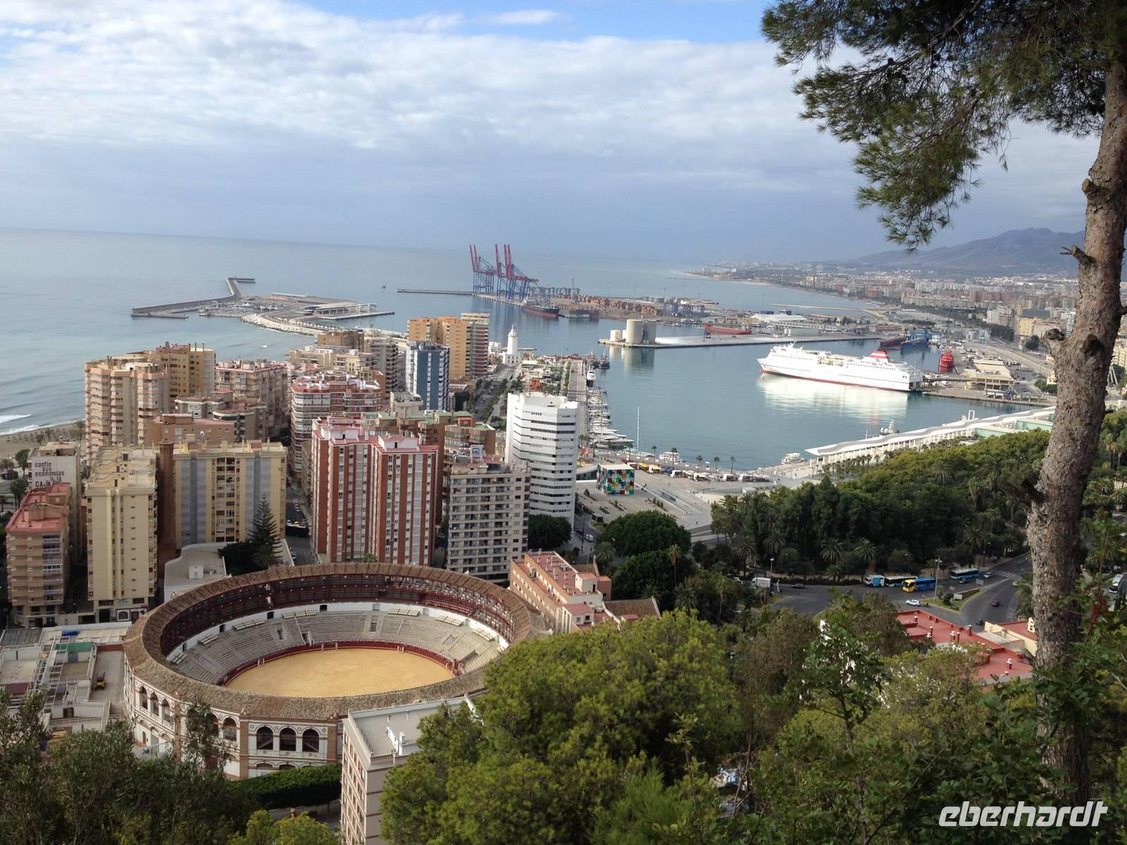 Vom Strand fahren wir hinauf zur Gibralfaro Burg und laufen von da bis zum Parador de Gibralfaro, einem Hotel mit einem schönen Ausblick auf den Hafen und die Altstadt von Málaga.