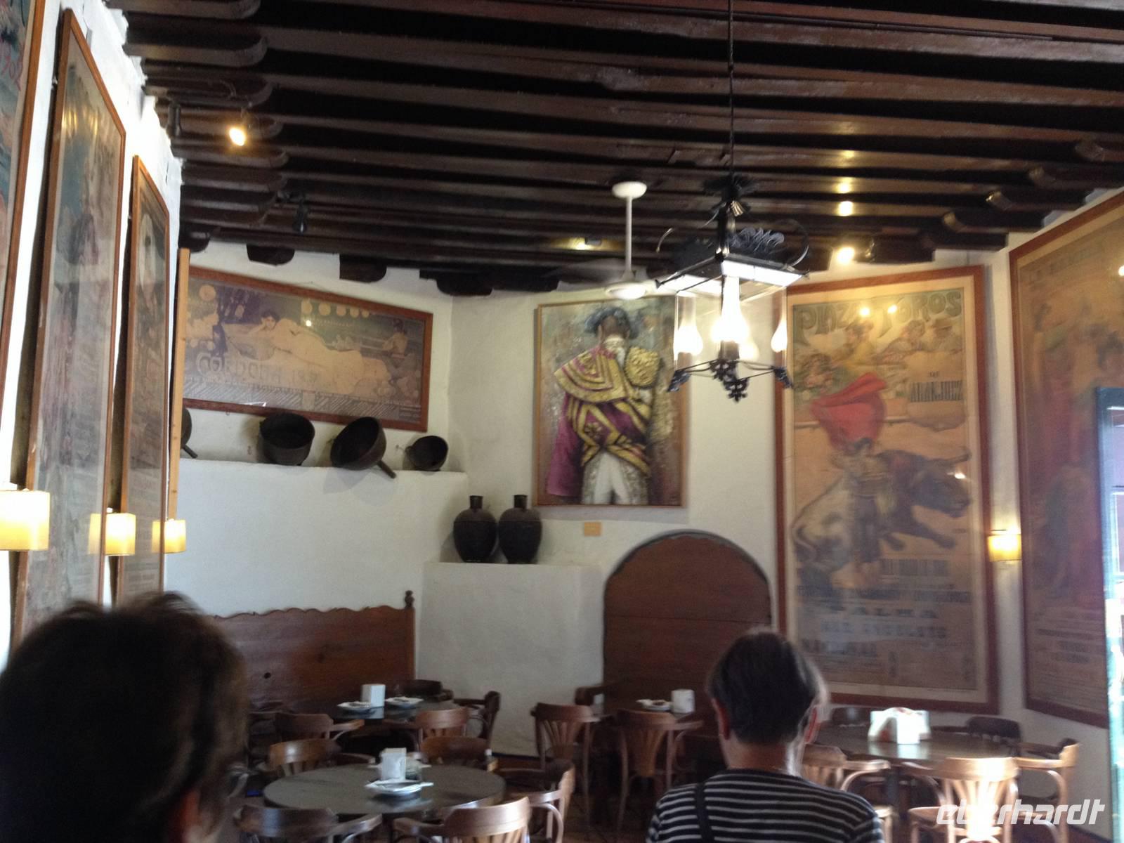 Wir besuchen einen traditionalen Markt, probieren den bekannten Serranoschinken, verschiedene Obstsorten wie Granada Apfel oder Chirimoyas (Rahmapfel oder Zuckerapfel). Wir laufen durch die alte Festung, die heute ein Garten ist, sehen die Stierkampfarena und finden verschiedene Überraschungen auf unserem Weg durch das Dorf. In der Bar El Niño machen wir eine Mittagspause und die Reisegruppe lernt meine Mutter und meinen Bruder kennen.
