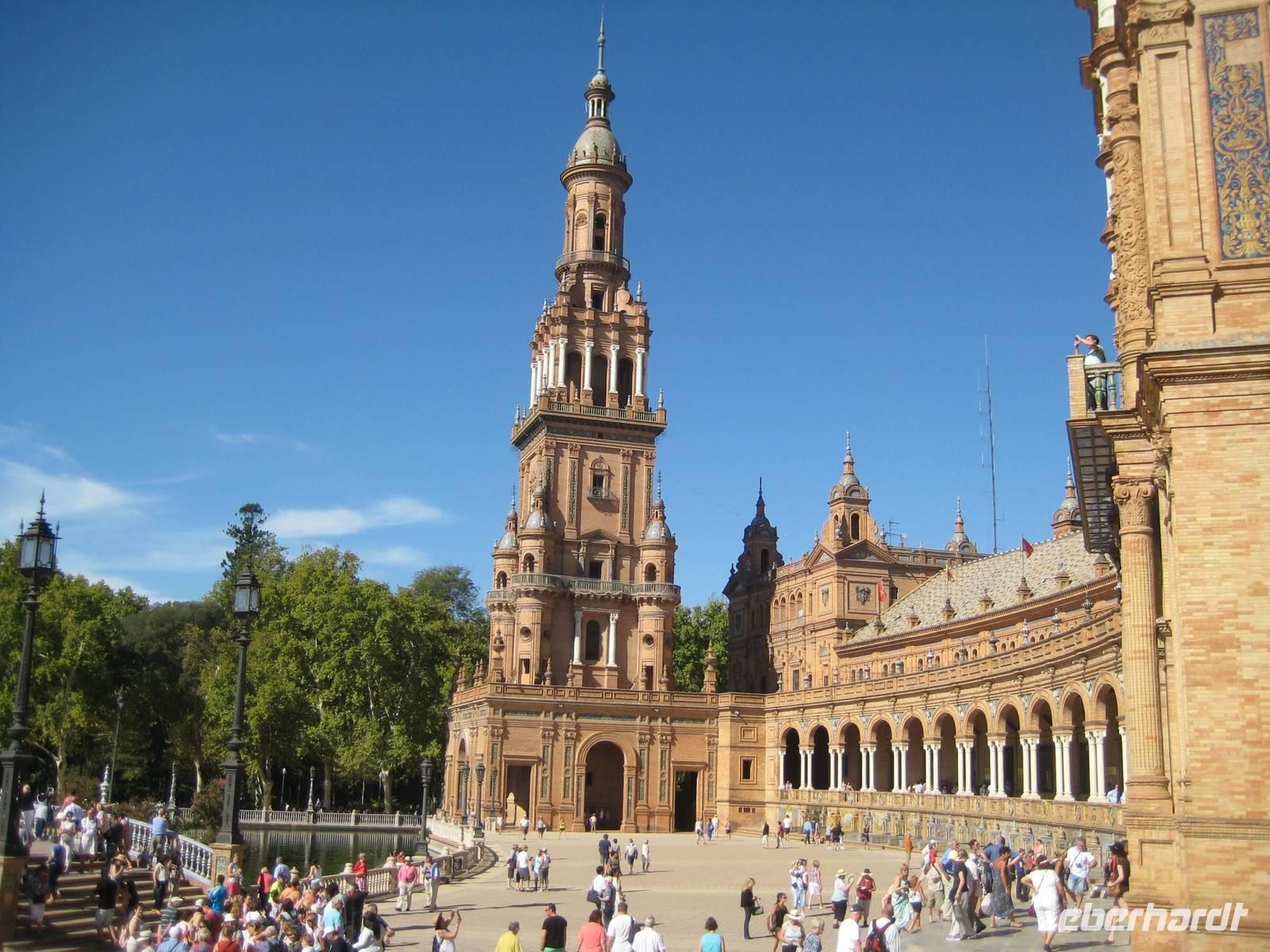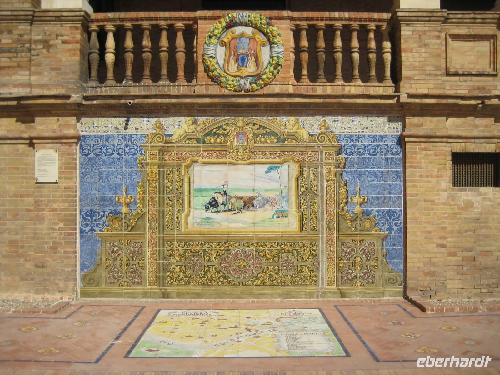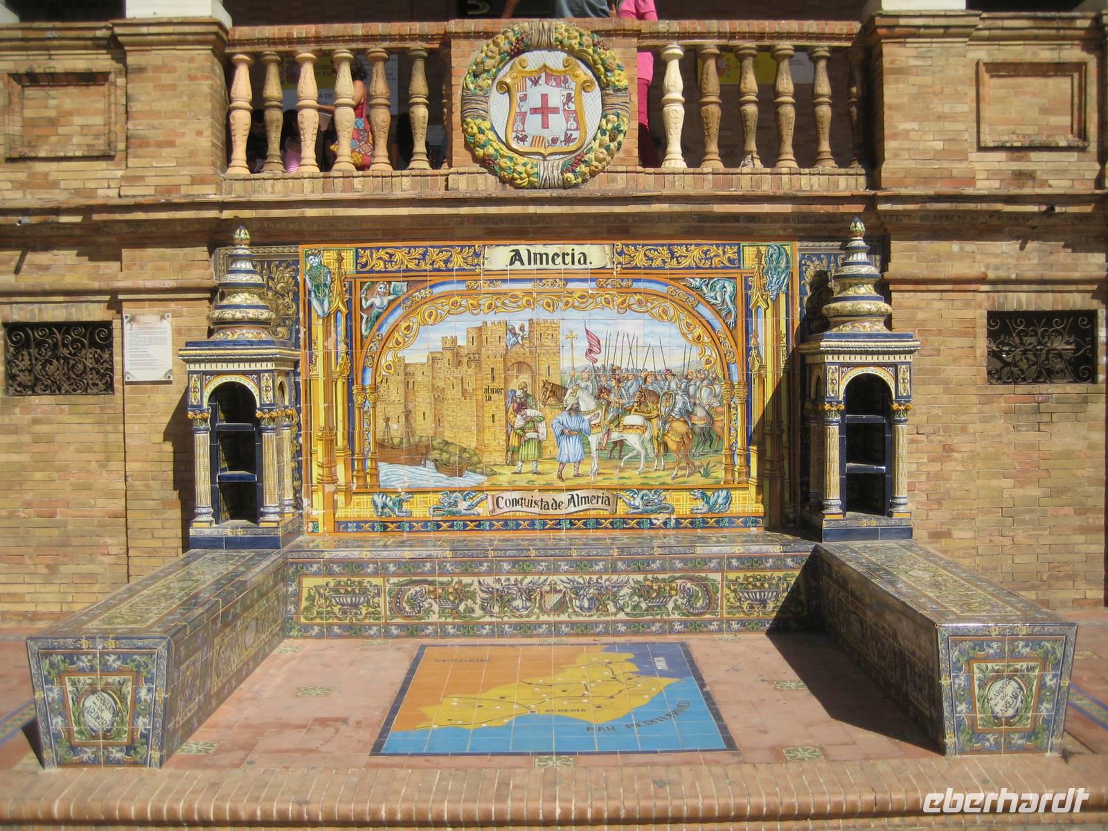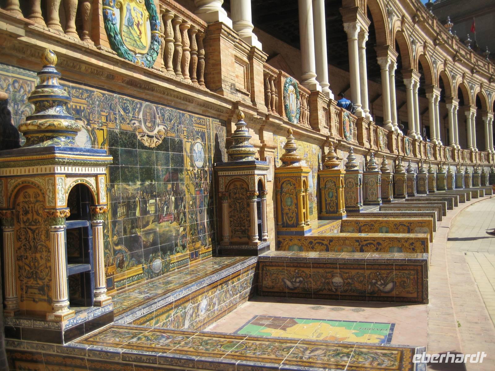 In Sevilla angekommen unternehmen wir einen Stadtrundgang und sind begeistert von der Schönheit des Spanischen Platzes. An den Wänden befinden sich eine Reihe von Kachelornamenten, welche an die 48 spanischen Provinzen erinnern sollen und dabei alphabetisch angeordnet sind.
