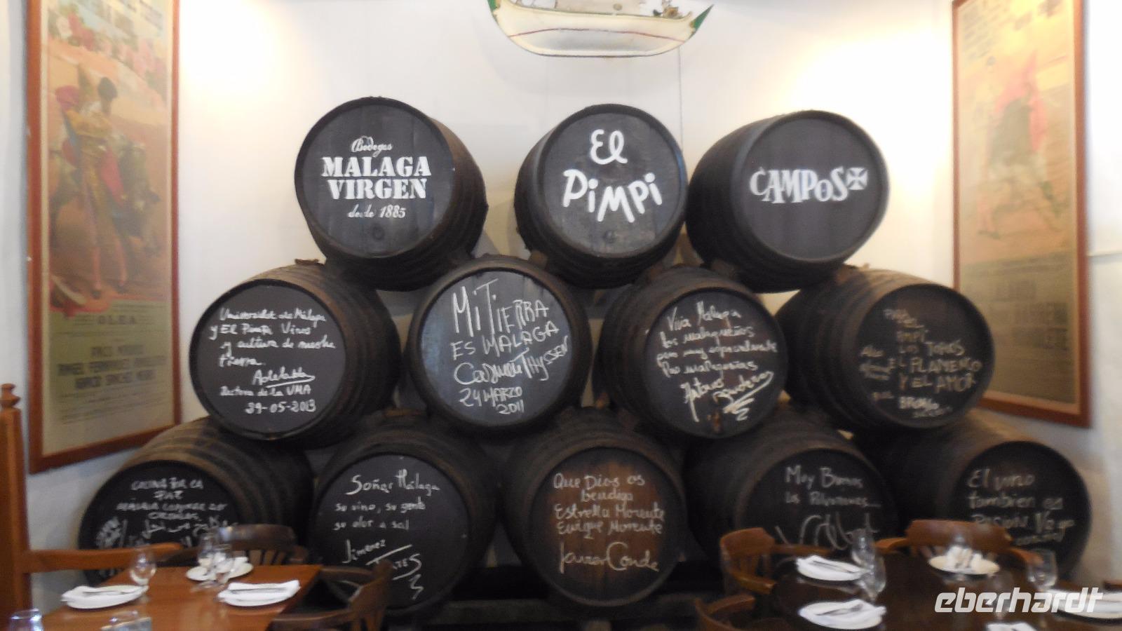 Bei diesem Stadtrundgang sah wir auch die Jakobskirche "Iglesia de Santiago", wo Picasso getauft war und gingen durch den bekannten Weinkeller El Pimpi, in dem wir eine Pause machten um das "Blut von Málaga" Moscatel Wein zu probieren.
