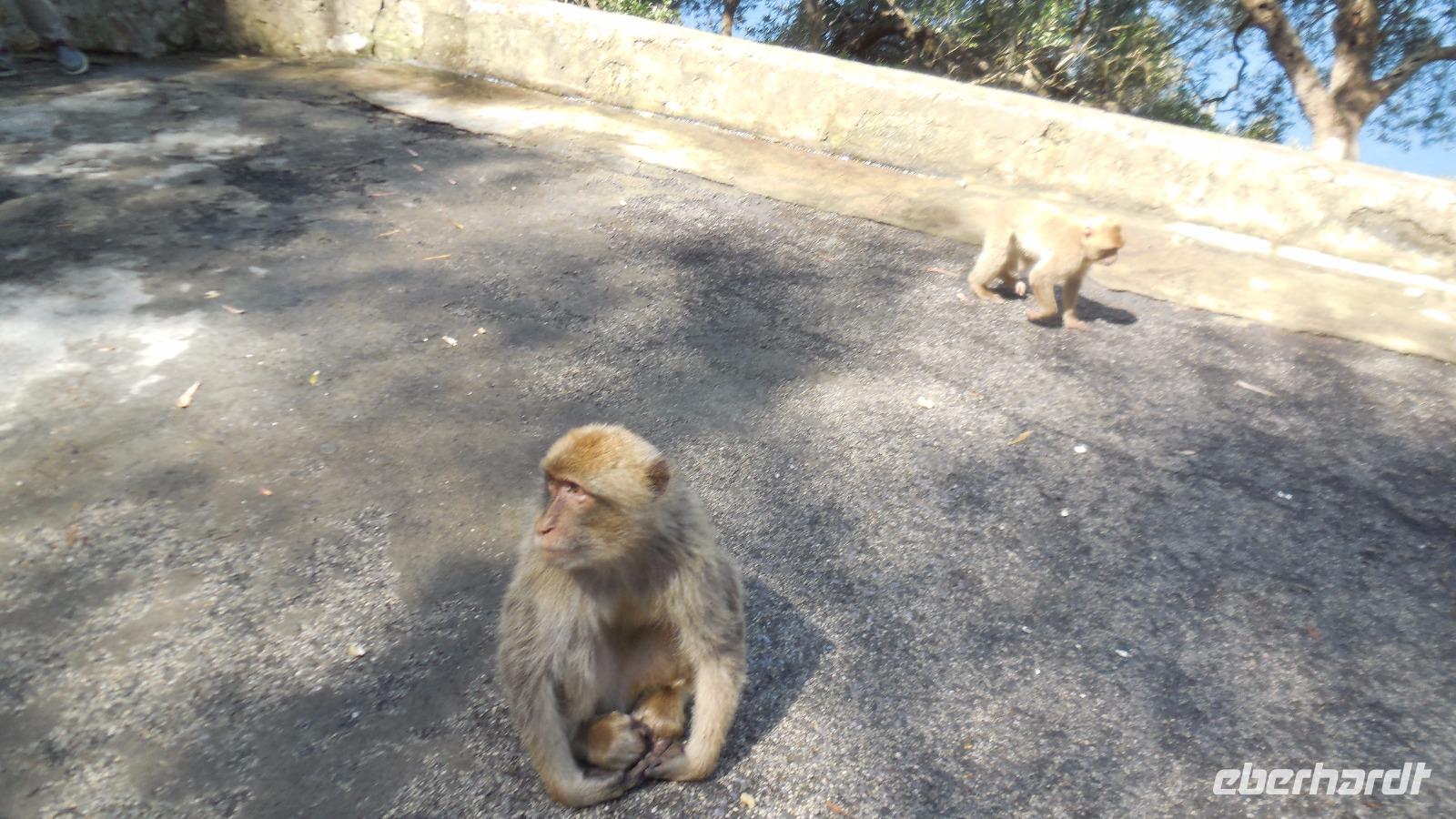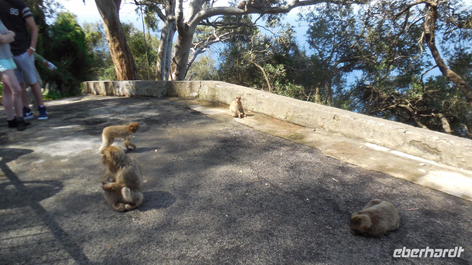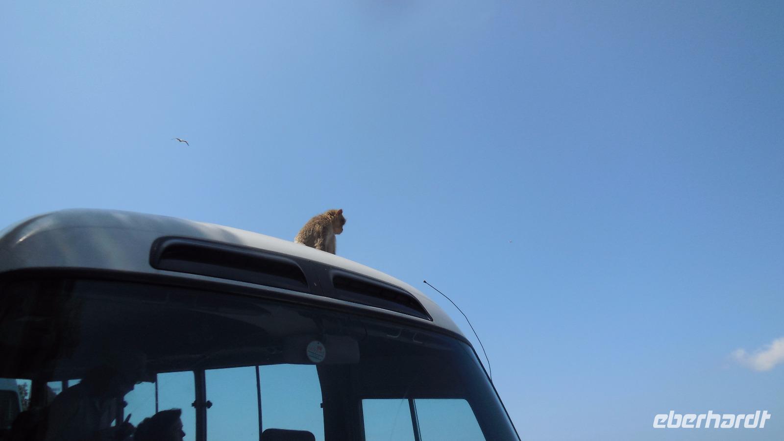 Danach kamen die auf dem Felsen lebenden Affen, um uns zu begrüßen und uns die Familie vorzustellen. Wir waren an der Futterstelle und die Affen haben auch unseren Bus inspiziert, haben ihn dann aber doch nicht als Mitfahrgelegenheit benutzt.