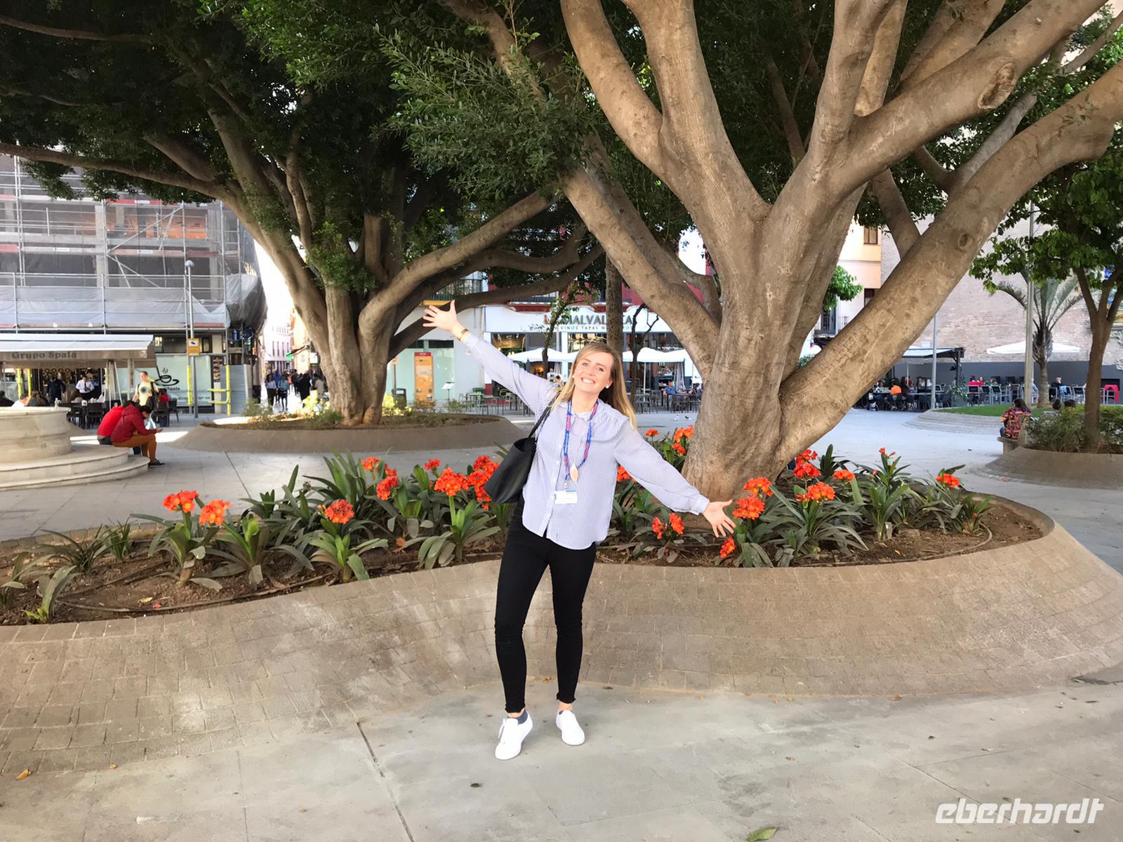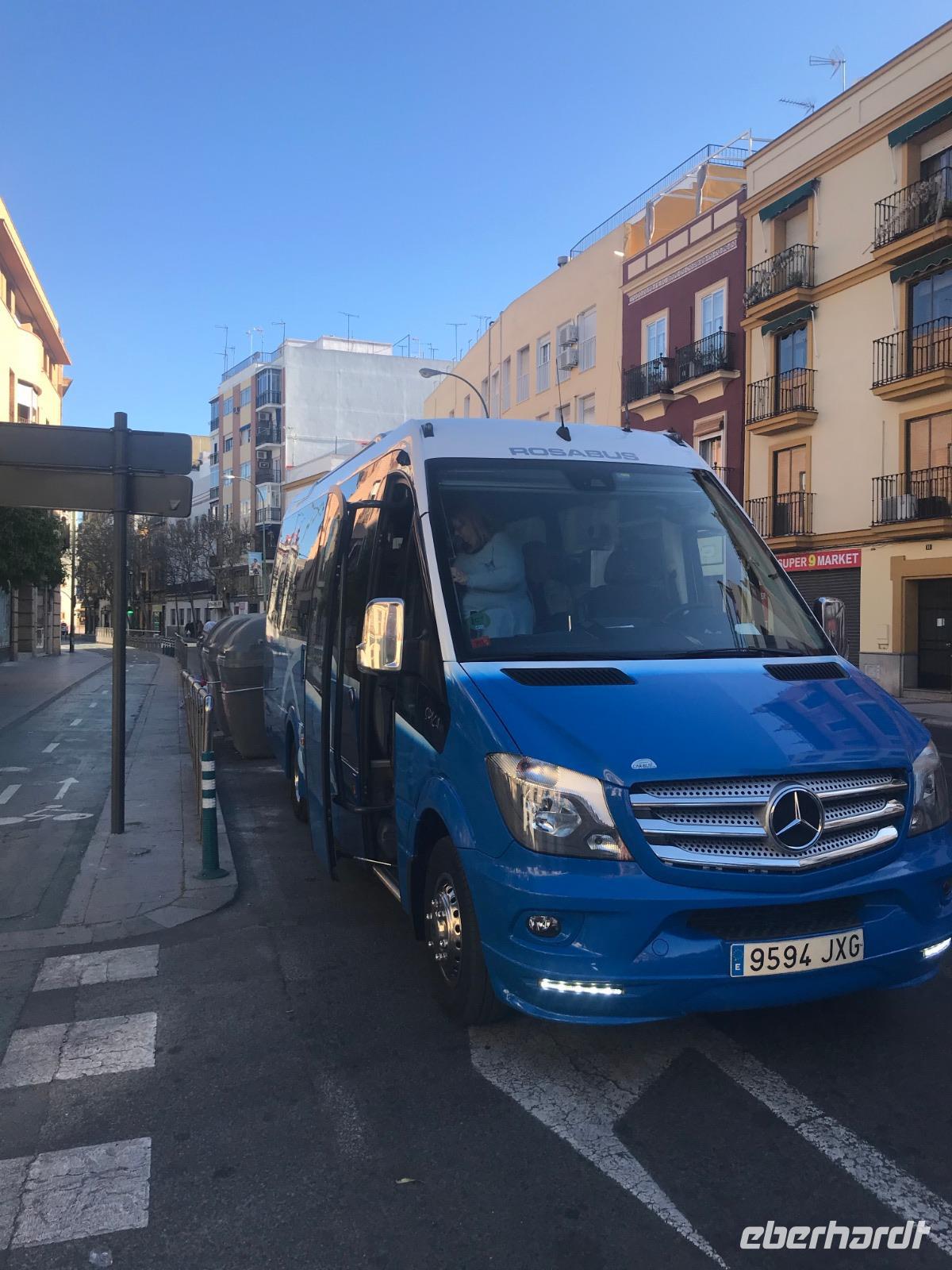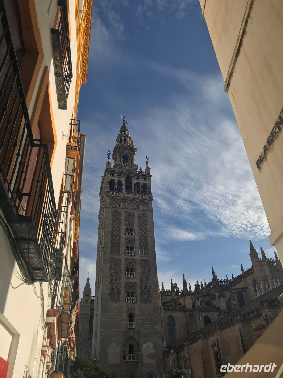 Am Donnerstagvormittag trifft sich unsere Eberhardt-Gruppe am Frankfurter Flughafen, um die südspanische Region Andalusien zu bereisen. Der Flieger bringt uns in weniger als drei Stunden in die Hauptstadt Andalusiens, nach Sevilla. Am Flughafen in Sevilla werden wir von unserem Busfahrer Manolo in Empfang genommen und zu unserem Hotel Catalonia Giralda im Stadtzentrum gefahren. Schon kurze Zeit später brechen einige von uns zu einem Spaziergang auf, um einen ersten Eindruck von Sevilla erhaschen zu können. Der Frühling ist in Sevilla bereits angekommen und die Blüten der Orangenbäume entfalten einen herrlichen Duft, der die Straßen erfüllt. Es begleiten uns dabei angenehme Temperaturen über 20 Grad bei Sonnenschein. Zunächst führt es uns in die rustikale Bar El Rinconcillo, in der wir auf ein kühles Getränk oder einen Café americano einkehren. Im Anschluss spazieren wir zum Metropol Parasol, eine futuristische Holzkonstruktion, die als Sonnenschutzdach fungiert. Für die Sevillaner stellt es das moderne Wahrzeichen ihrer Stadt dar, das sie gern als die „Setas" bezeichnen, was mit die Pilze zu übersetzen ist. Wir schlendern weiter durch die engen Gassen in die Altstadt und erblicken schon von weitem den Turm der Kathedrale Giralda, der als ehemaliges Minarett in den Himmel emporragt. Wir passieren den Campus der Universität, die zu den größten Spaniens zählt und kehren daraufhin zu unserem Hotel zurück. Am Abend trifft sich unsere Eberhardt-Gruppe, um sich besser kennenzulernen. Wir nehmen unser gemeinsames Abendessen im Hotel ein, das wir uns schmecken lassen. Danach freuen wir uns auf unser Bett, schließlich sind die meisten von uns bereits seit den frühen Morgenstunden auf den Beinen. In diesem Sinne sagen wir ¡Buenas noches y hasta mañana!.